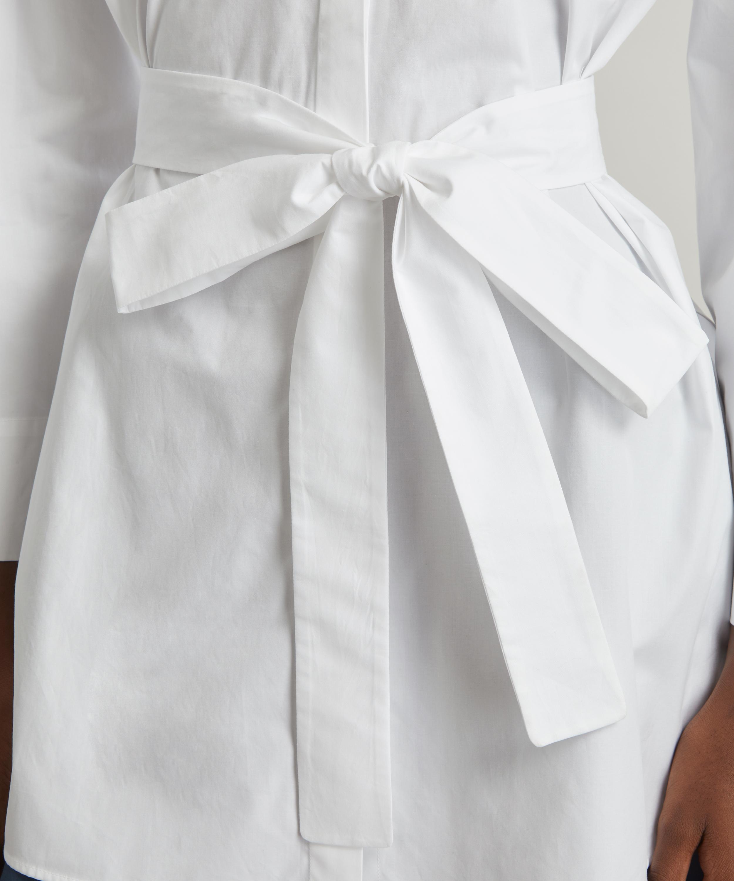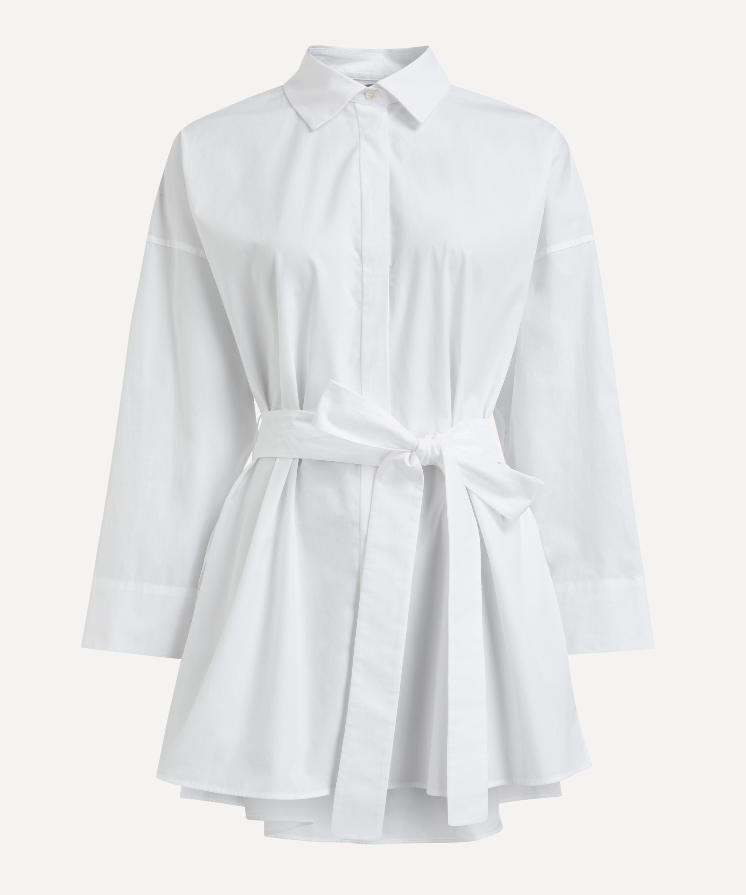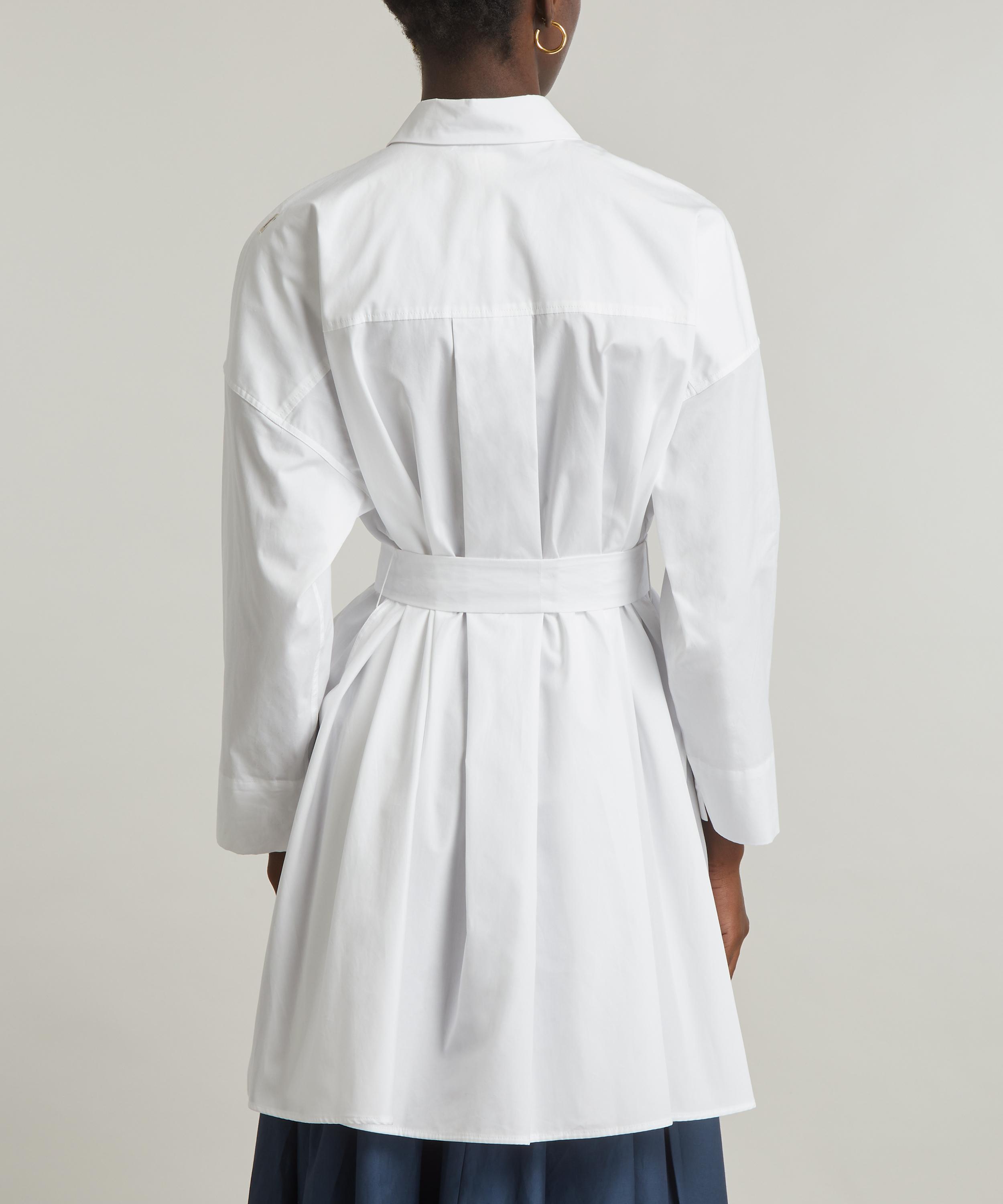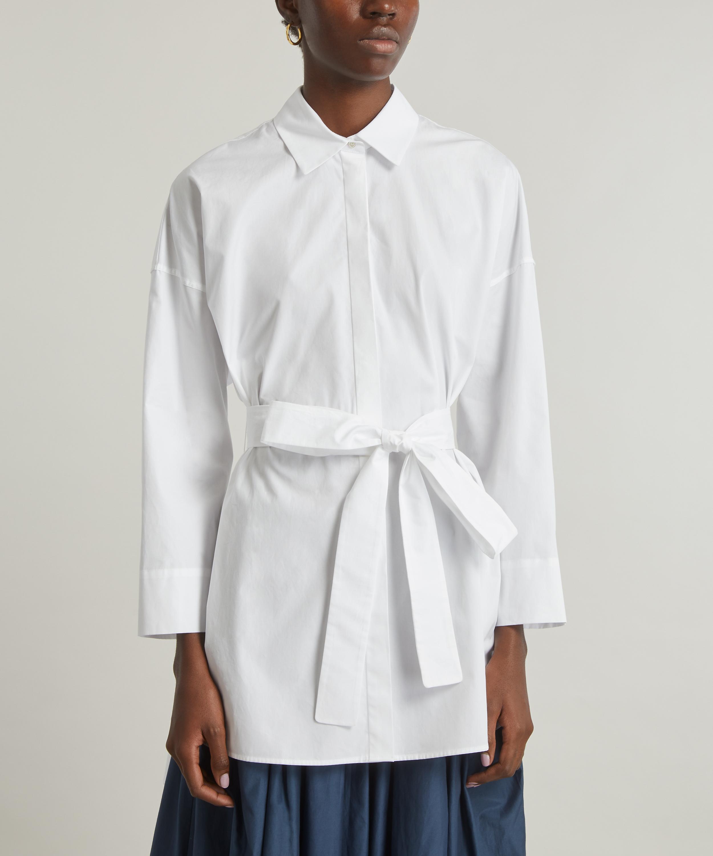 A demonstration of Max Mara’s commitment to wearable, luxury ready-to-wear, this soft cotton poplin shirt boasts a wide, flared silhouette with dropped-shoulder sleeves, and an asymmetric hem. Secured with a matching waist belt, it has classic point collar and a button fastening at the front for a tailored finish.