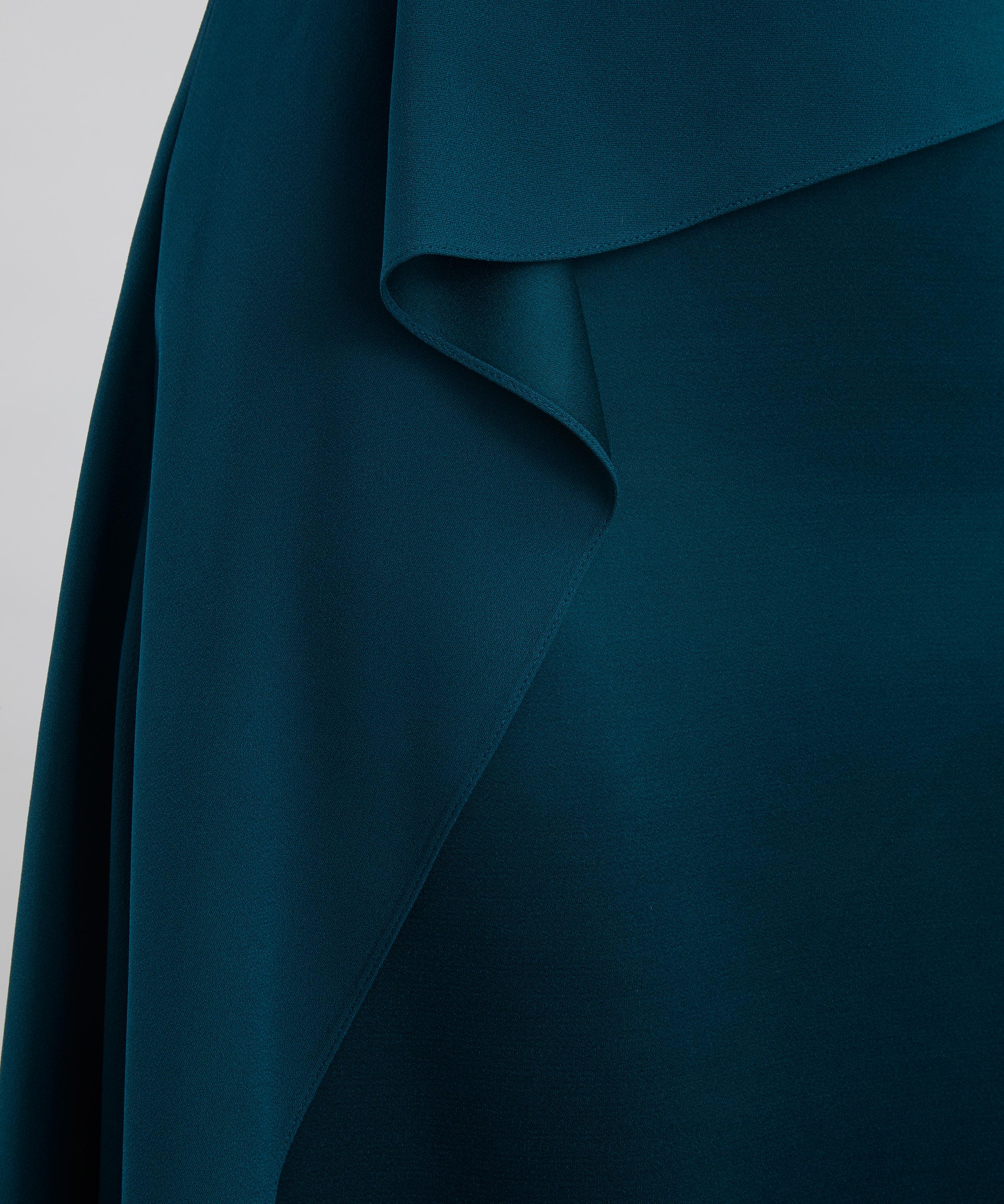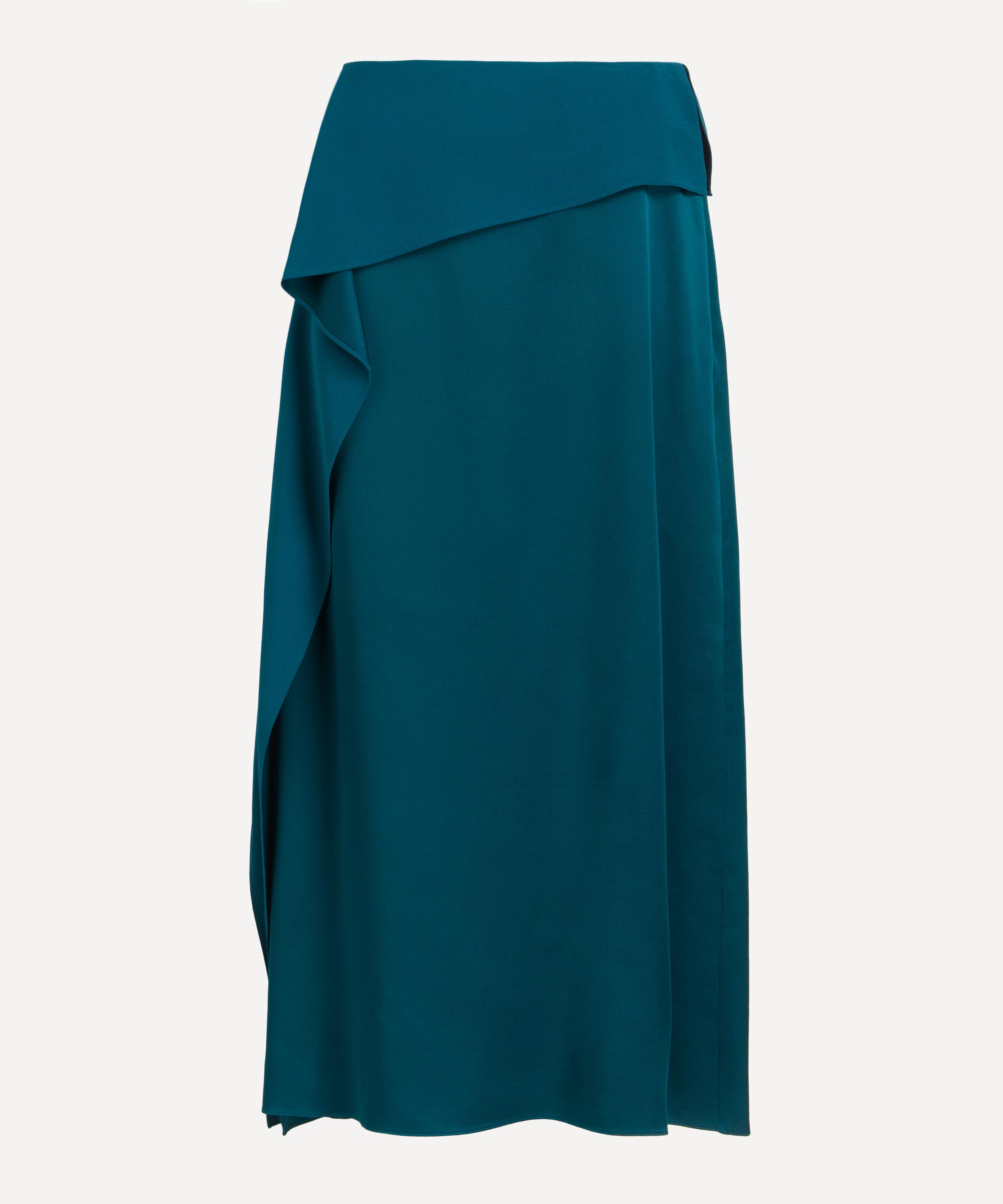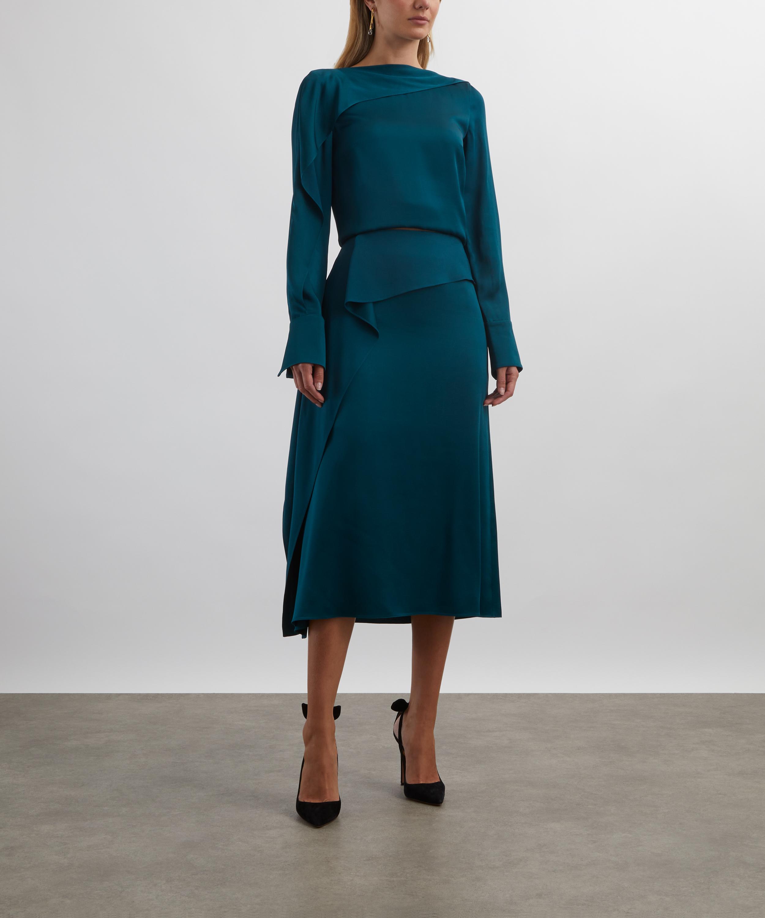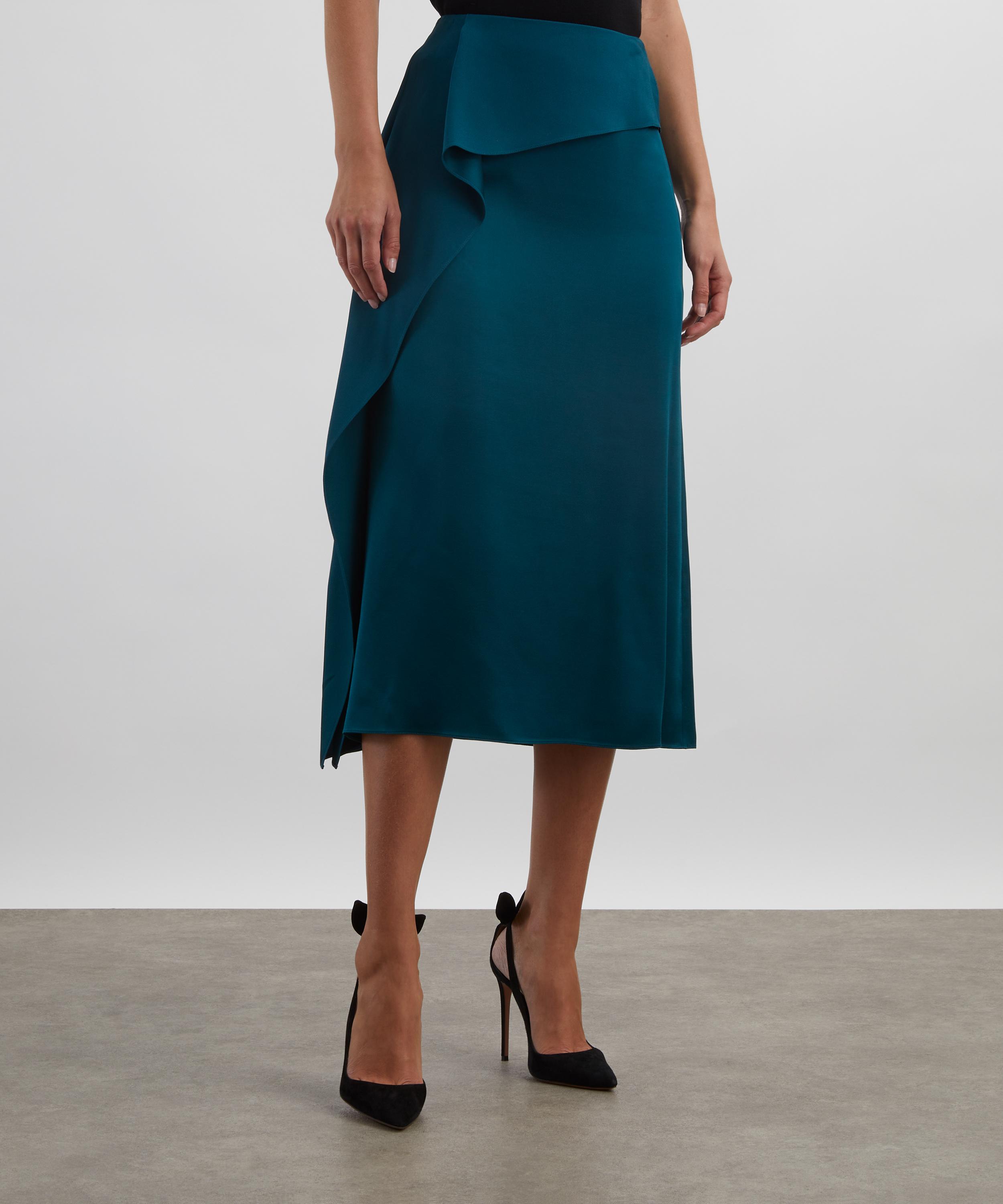 Crafted from sleek teal satin-cady, this midi skirt showcases a flattering A-line silhouette, enhanced by a softly draped overlay that adds graceful movement and a refined finish.
