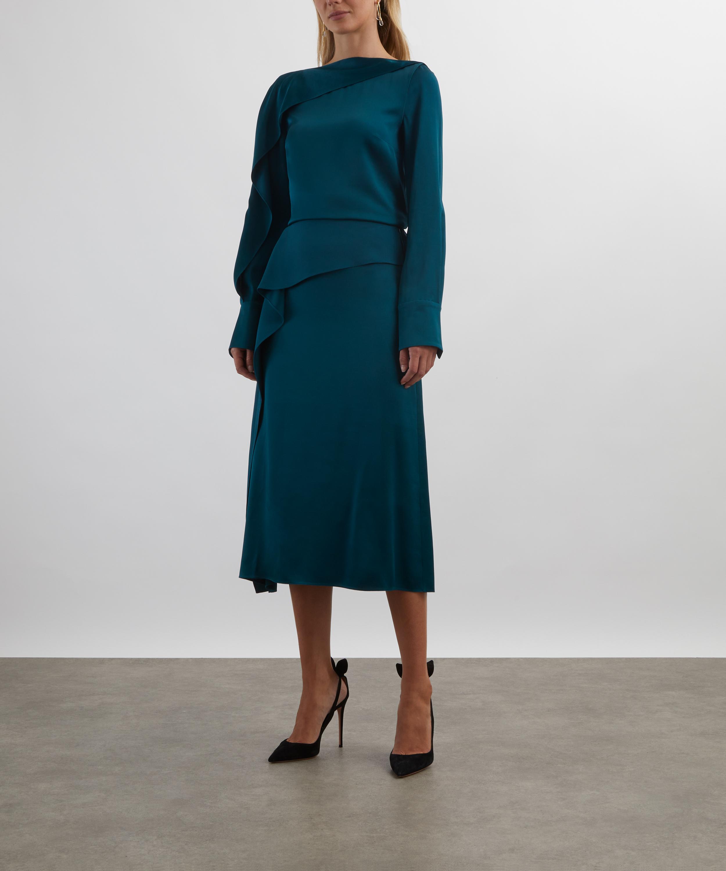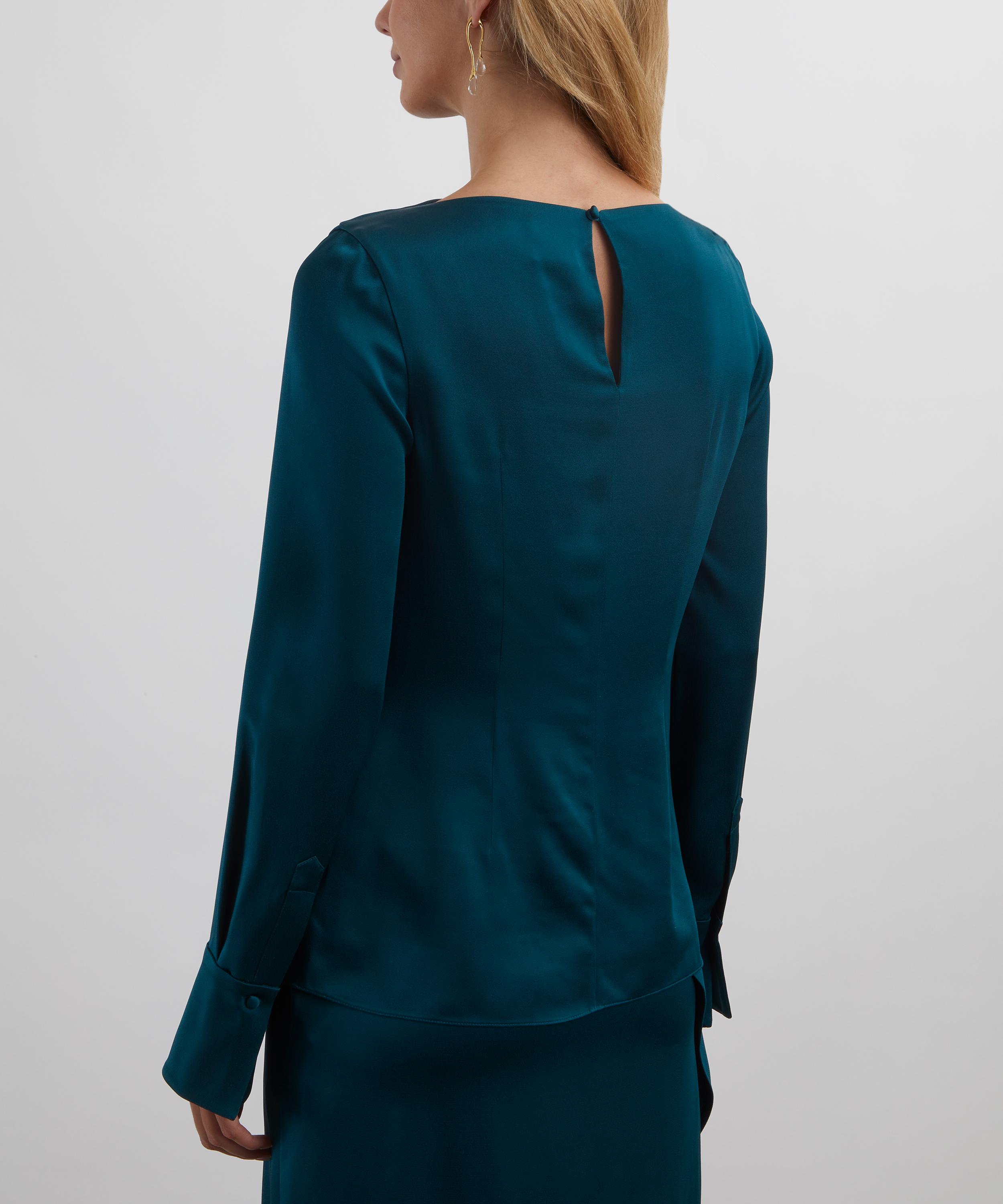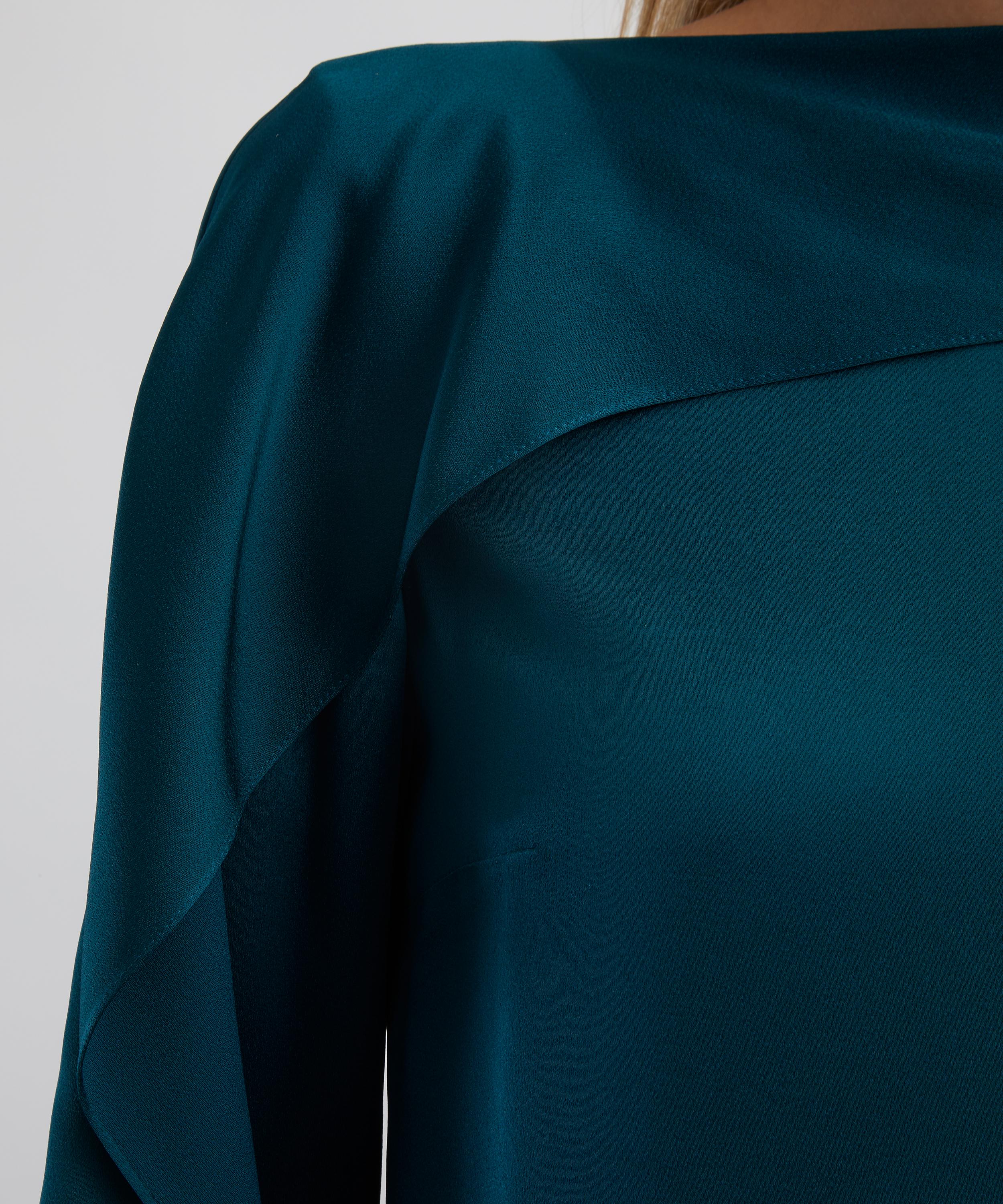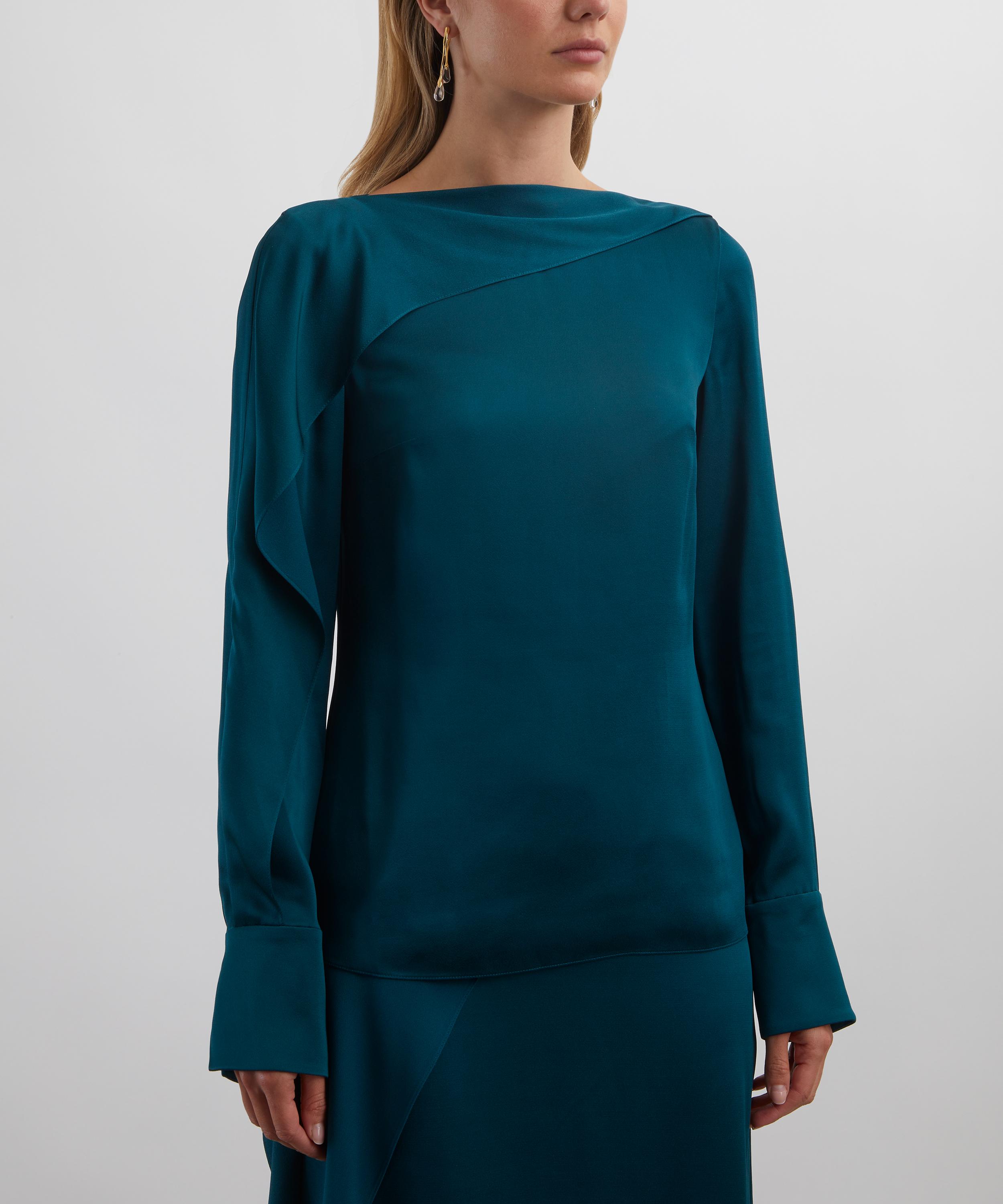 Crafted from sleek teal satin-cady, this long-sleeve top features a flattering relaxed fit, elevated by a slash neckline and a fluid draped detail that cascades down the sleeve, bringing graceful movement and a polished, modern finish.