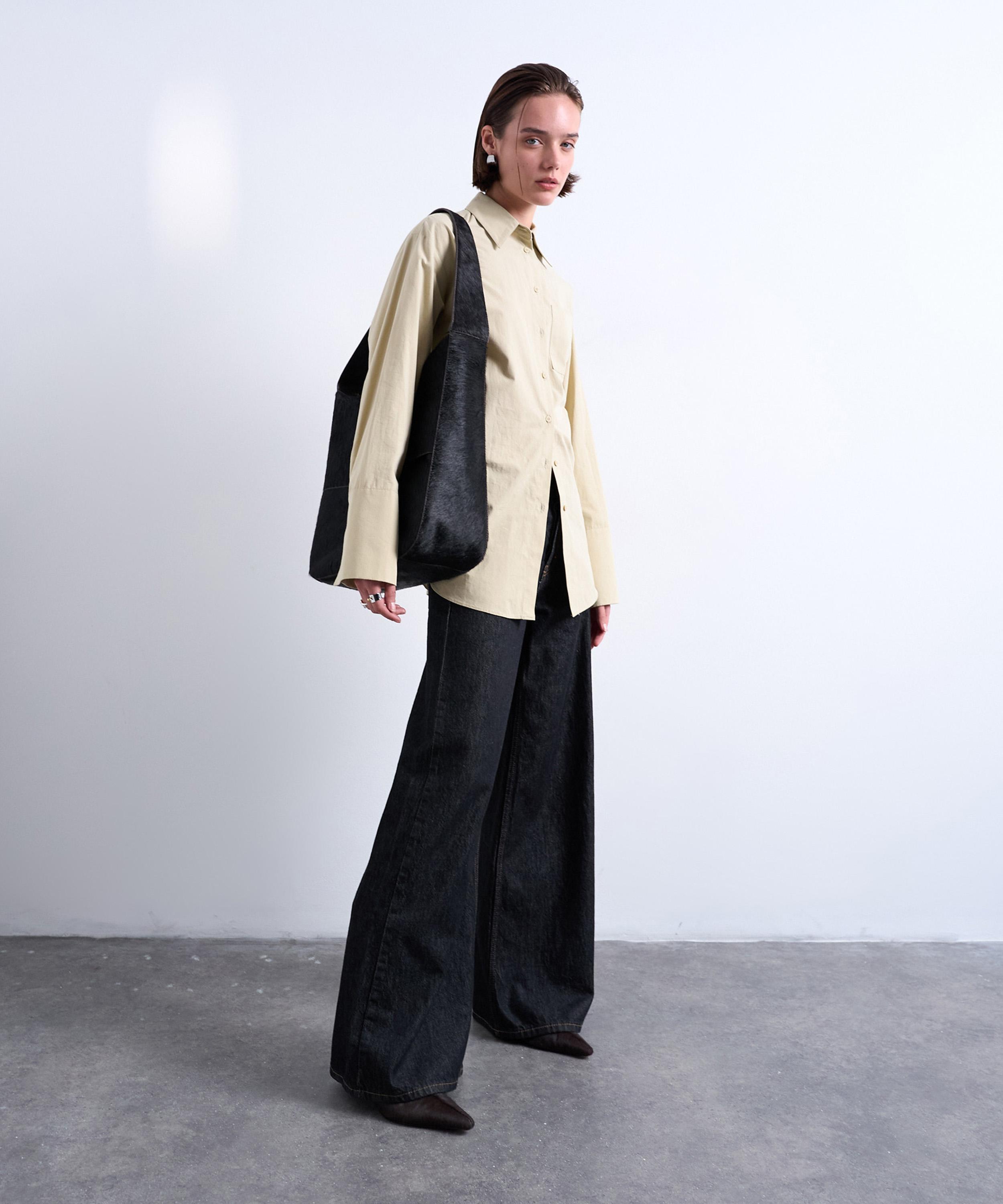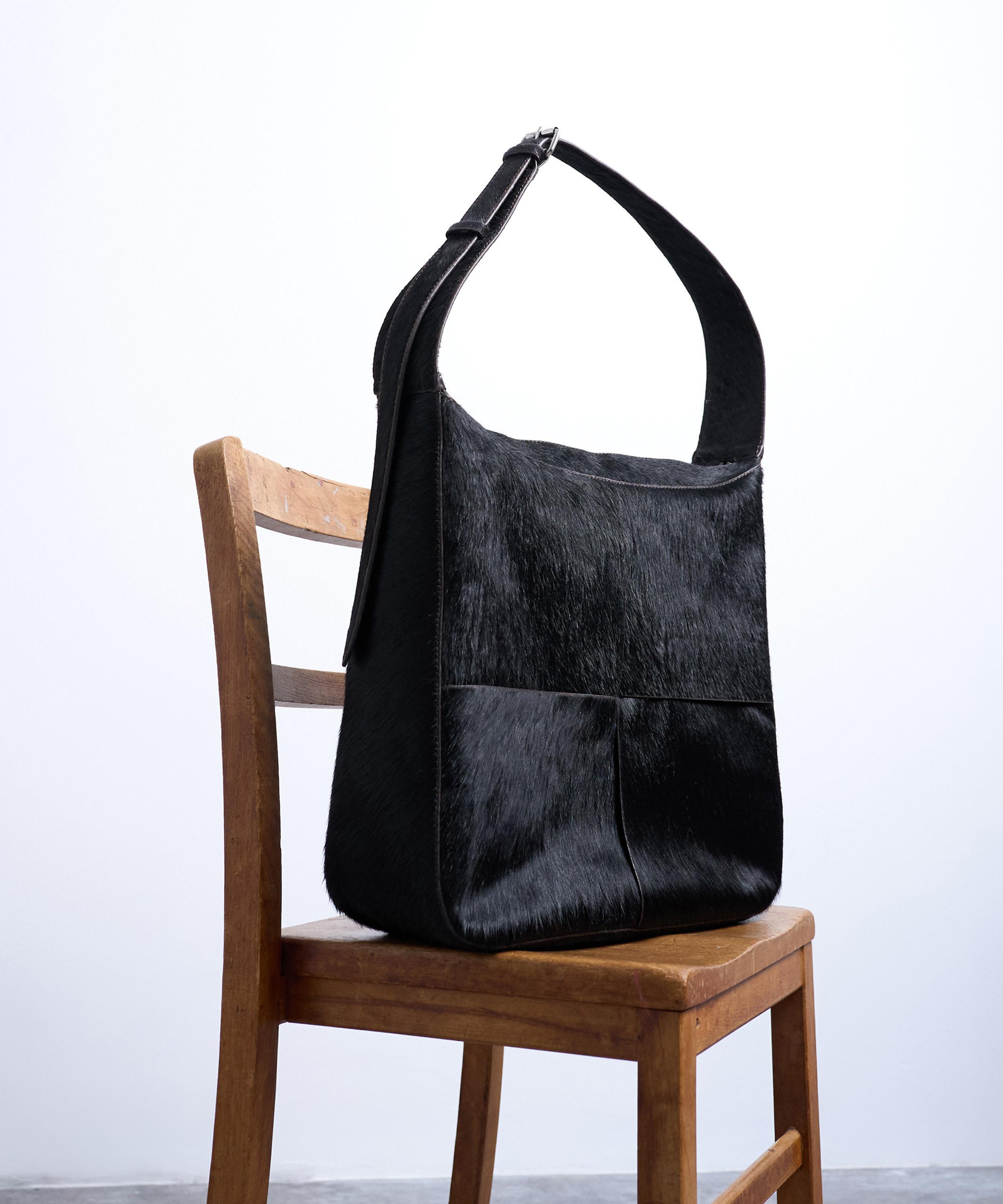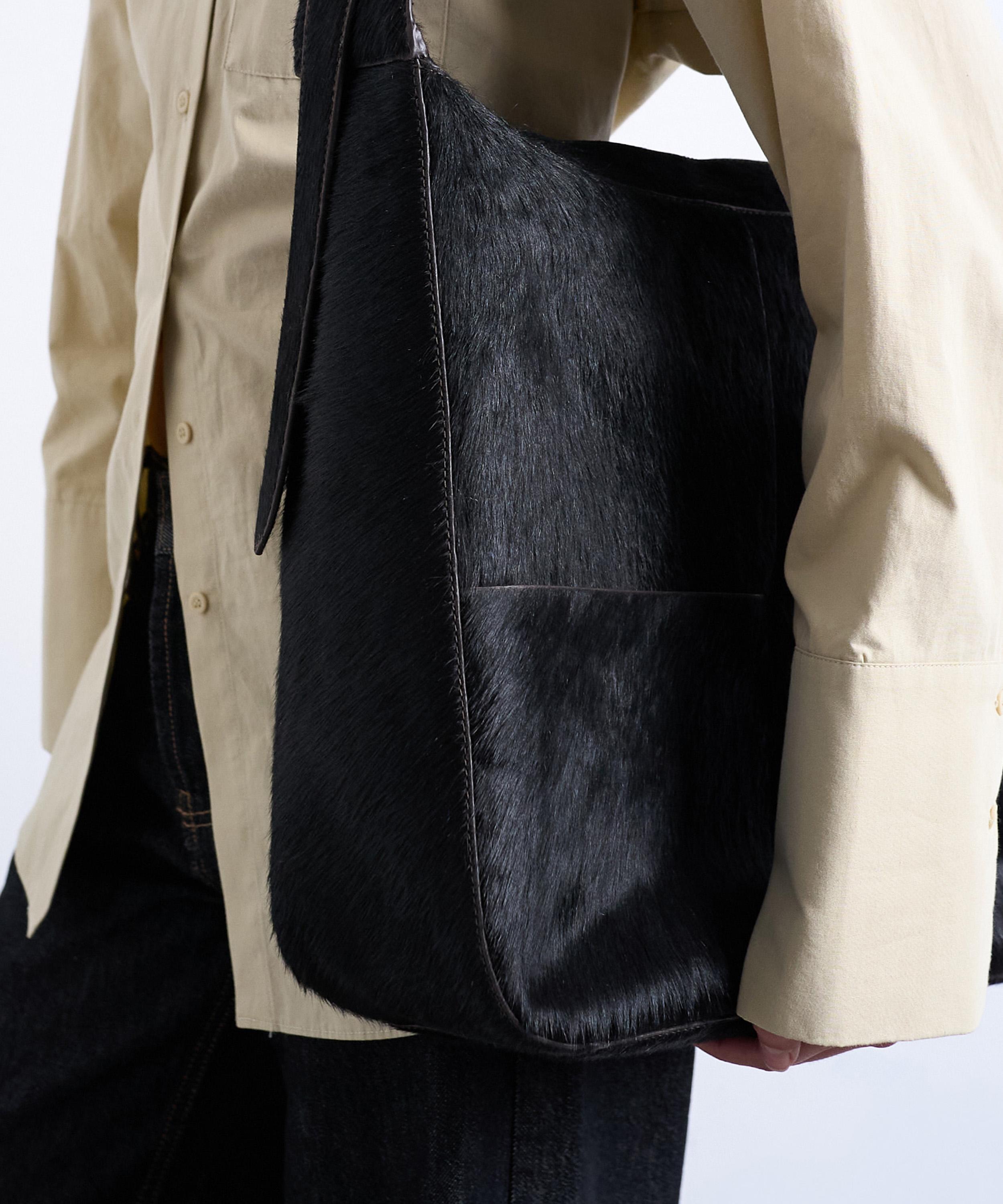 Crafted from textured pony leather with a distinctive hair-like finish, this oversized tote features a boxy silhouette and an adjustable shoulder strap for enhanced comfort and everyday practicality.
