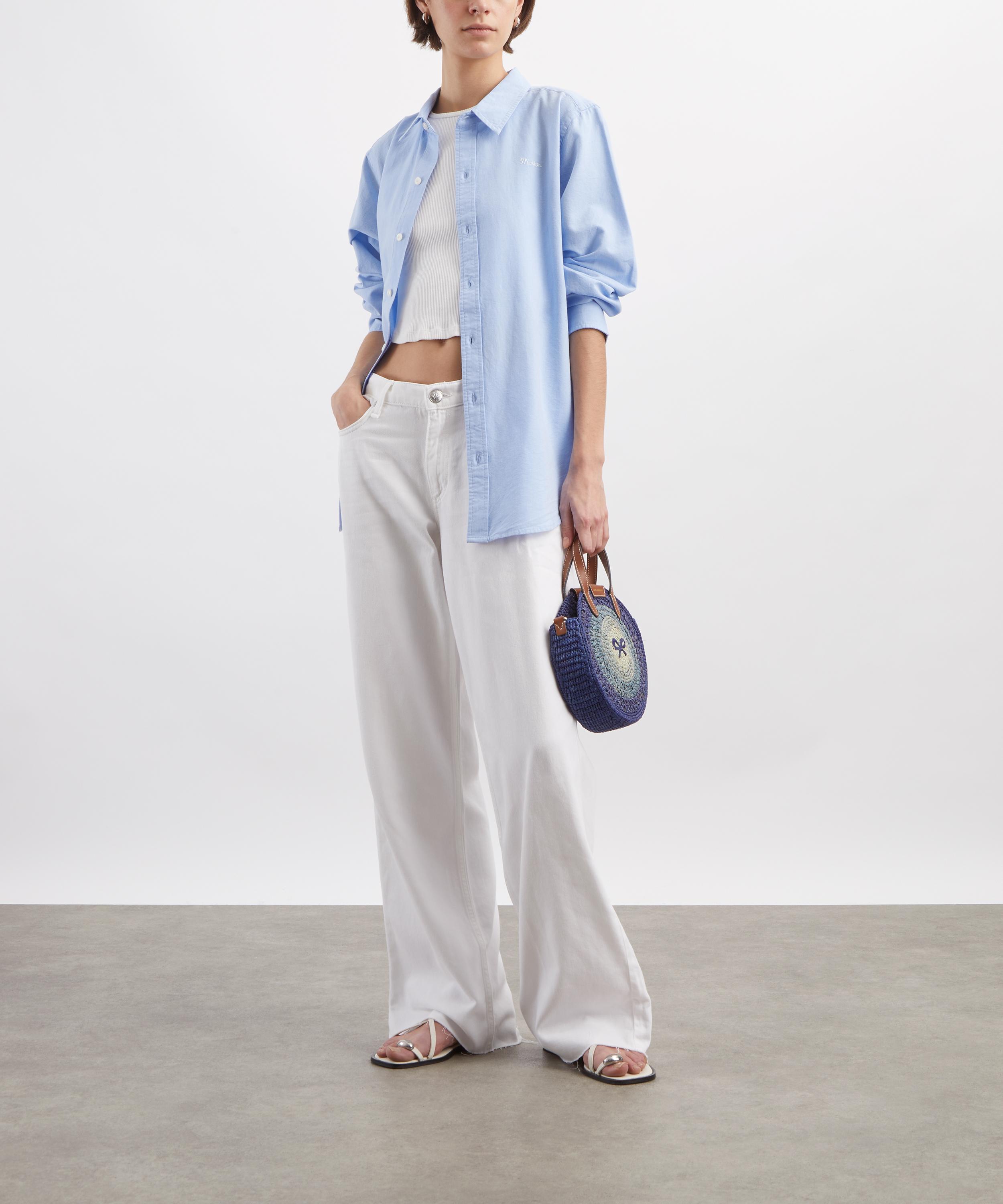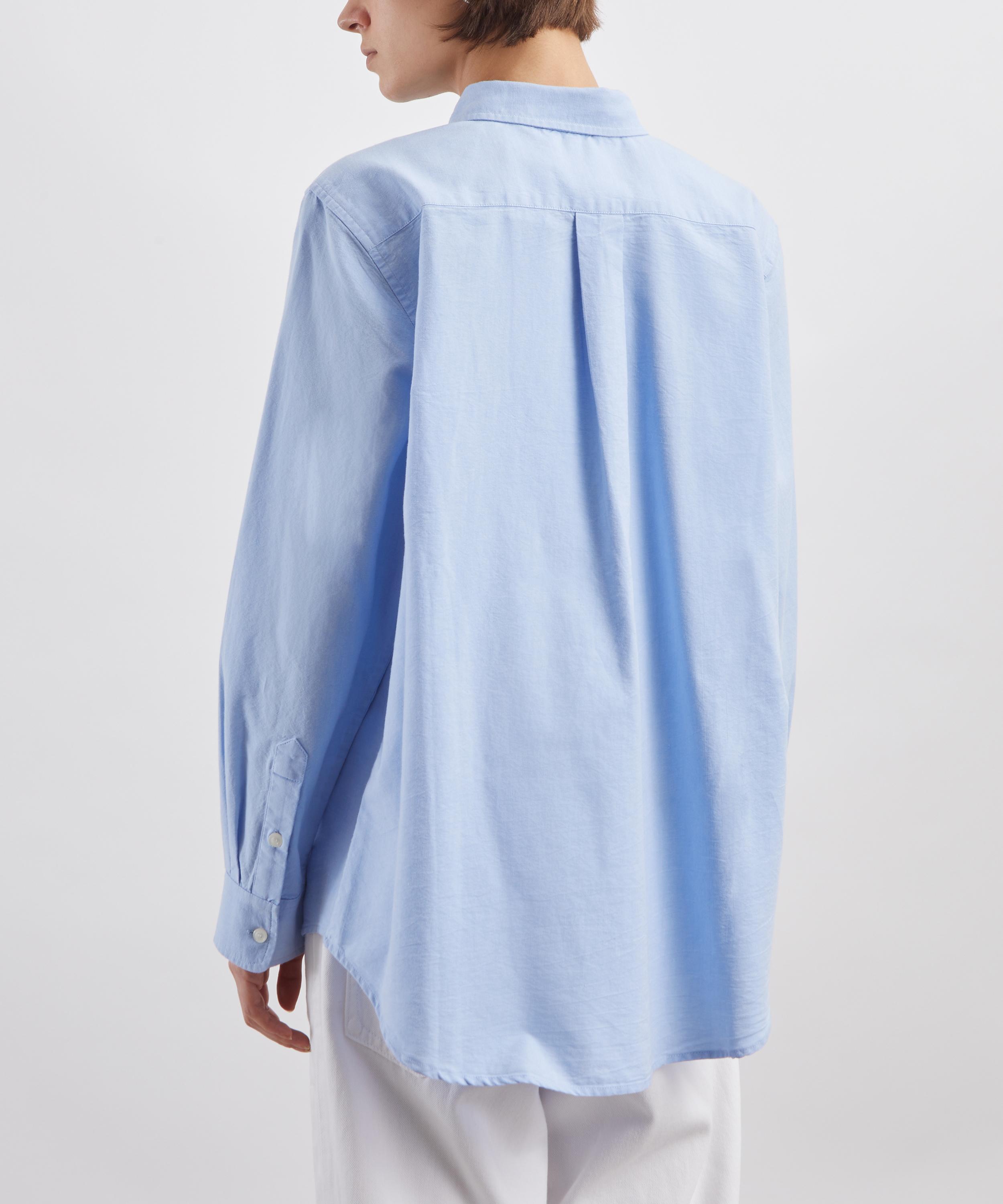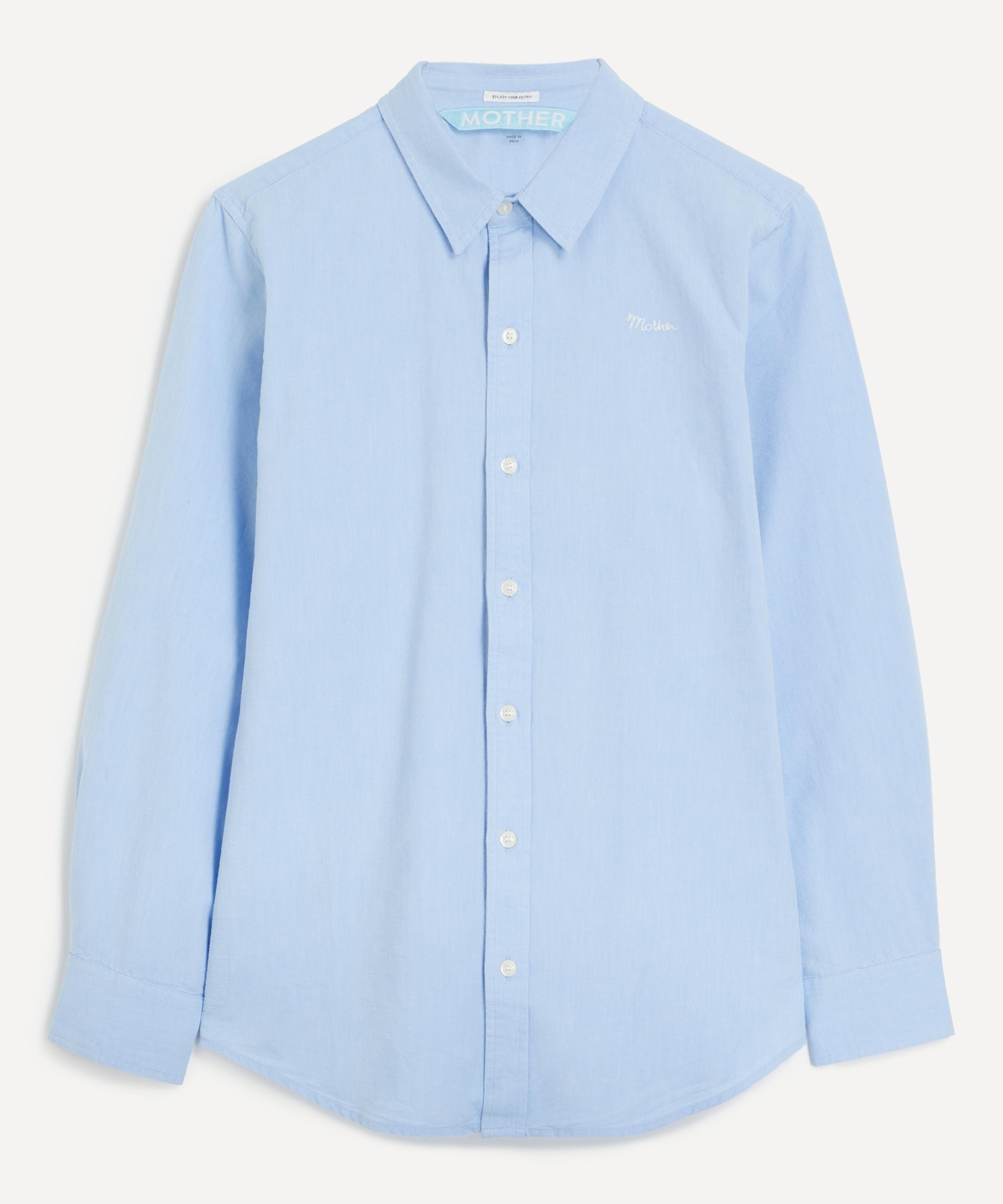 Crafted from pure cotton, this sumptuous light blue shirt embodies laid-back luxury. Designed with an oversized fit, it features a point collar, front button closure, long sleeves, and a curved hem, finished with a logo at the front for a signature touch.