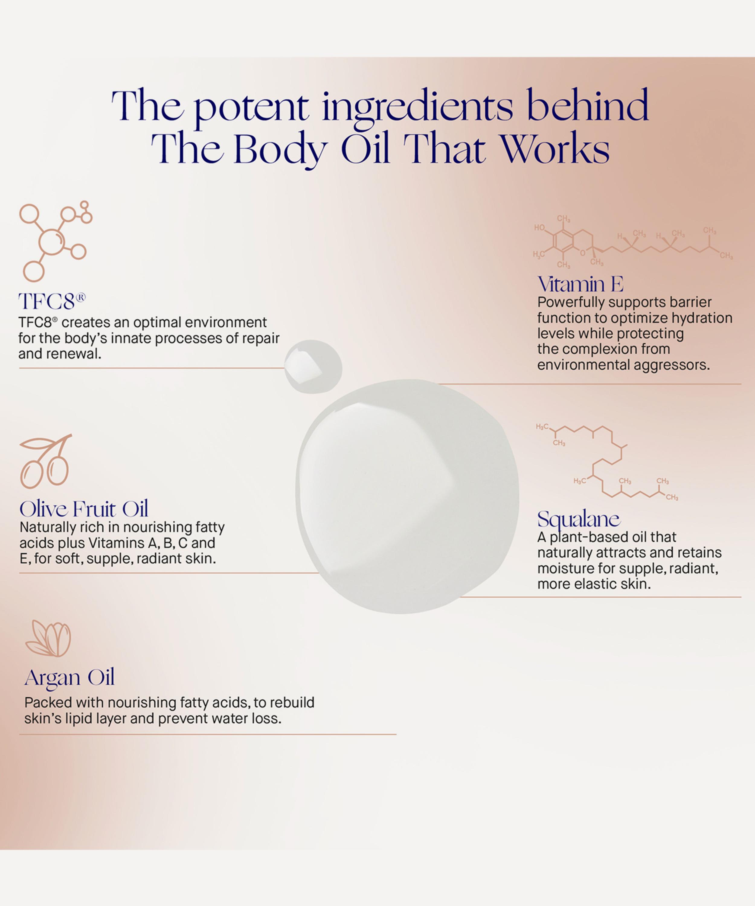 Catered to all skin types, silky, rich, yet lightweight body oil brings cutting-edge science to the masses with the brand's signature TFC8® technology - a high-performance complex of amino acids, vitamins and synthesised molecules naturally found in your skin. This - alongside an active botanical blend and nourishing plant-derived oils - helps reduce the appearance of cellulite, stretch marks and pigmentation to leave your skin feeling deeply conditioned and protected with a soft, plump appearance.