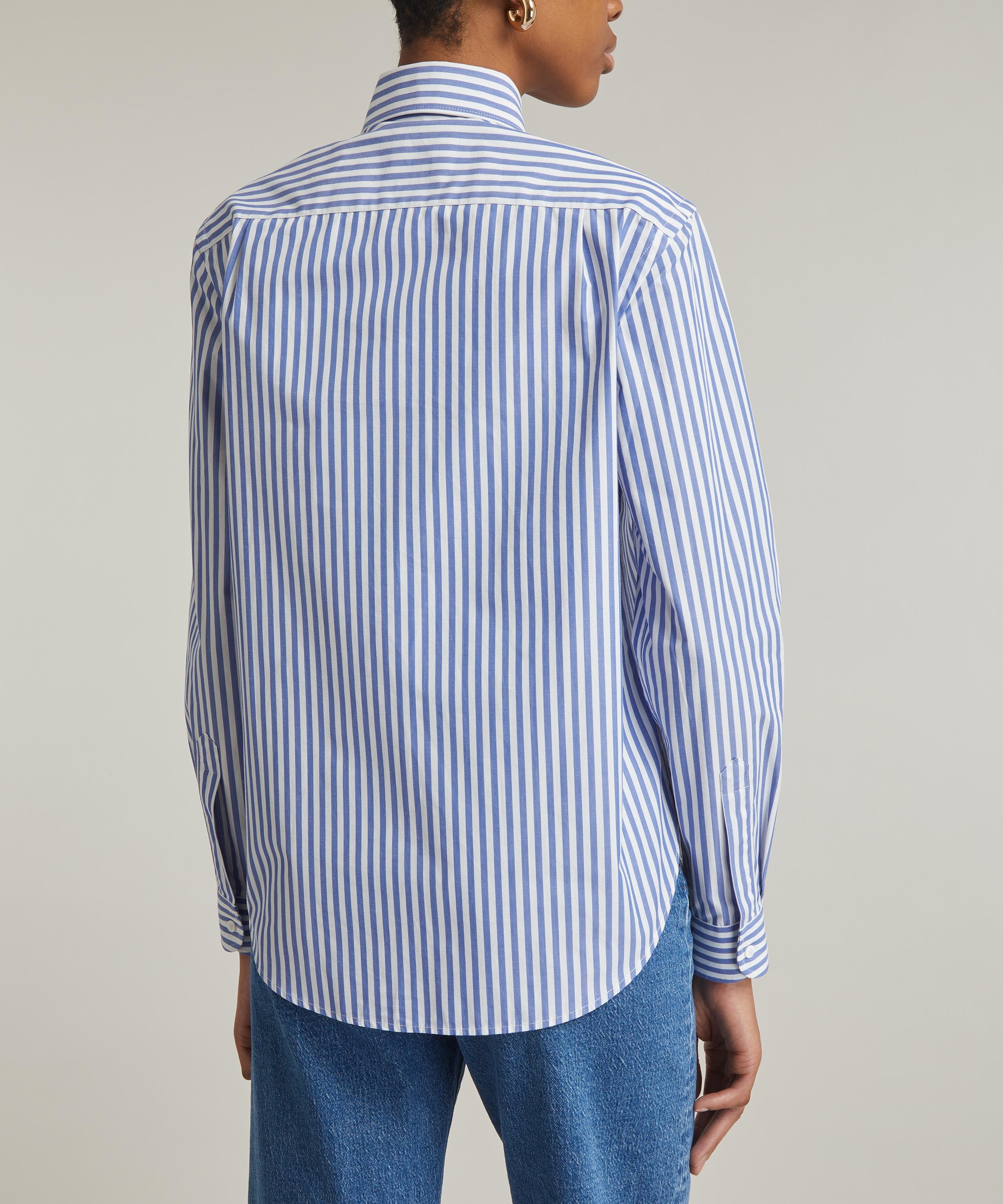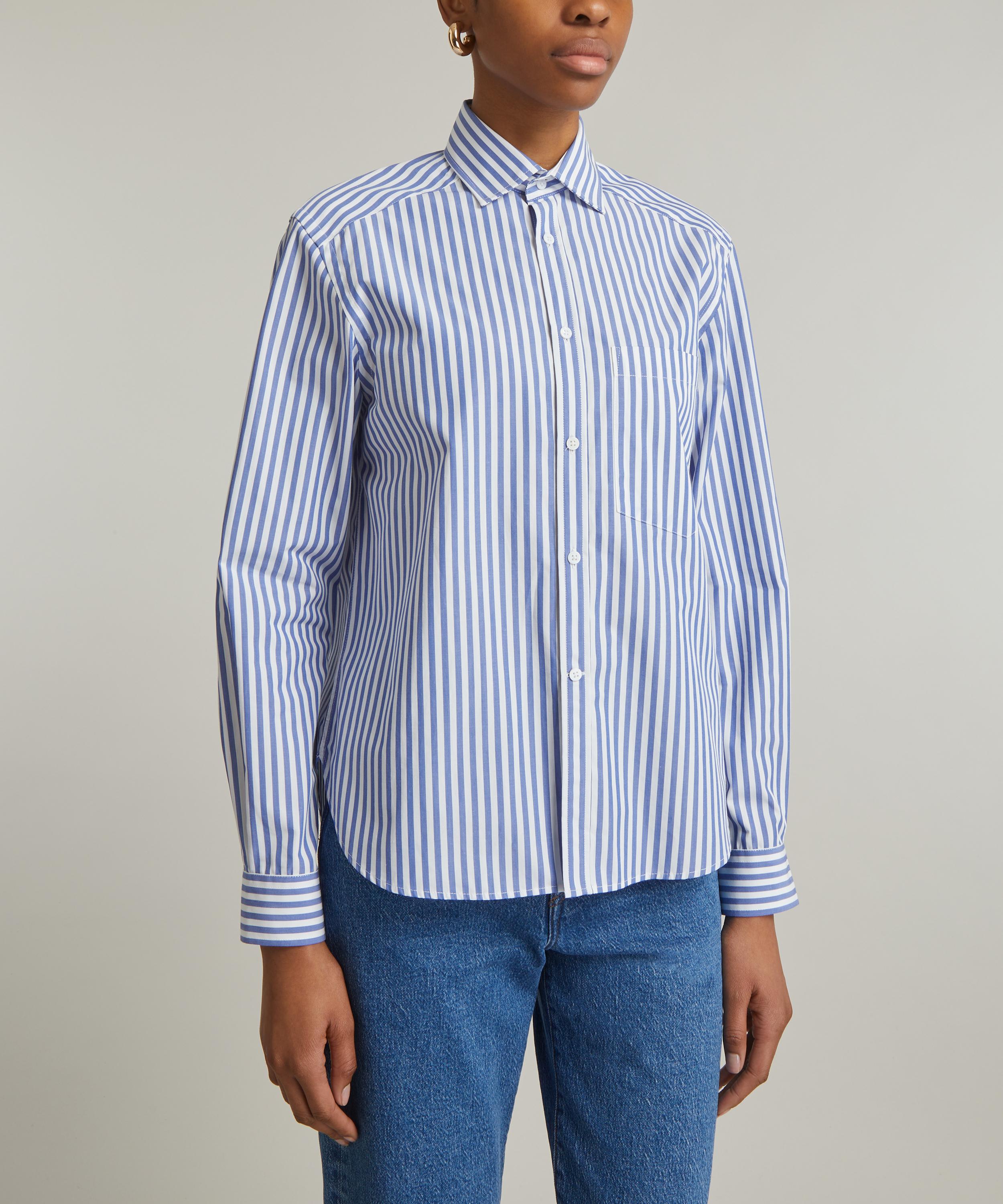 Inspired by British heritage and timeless style, this striped blue and white shirt has been cut from crisp cotton poplin to a semi-loose fit featuring slightly dropped shoulders, two pleats across the yoke, and a single chest patch pocket.