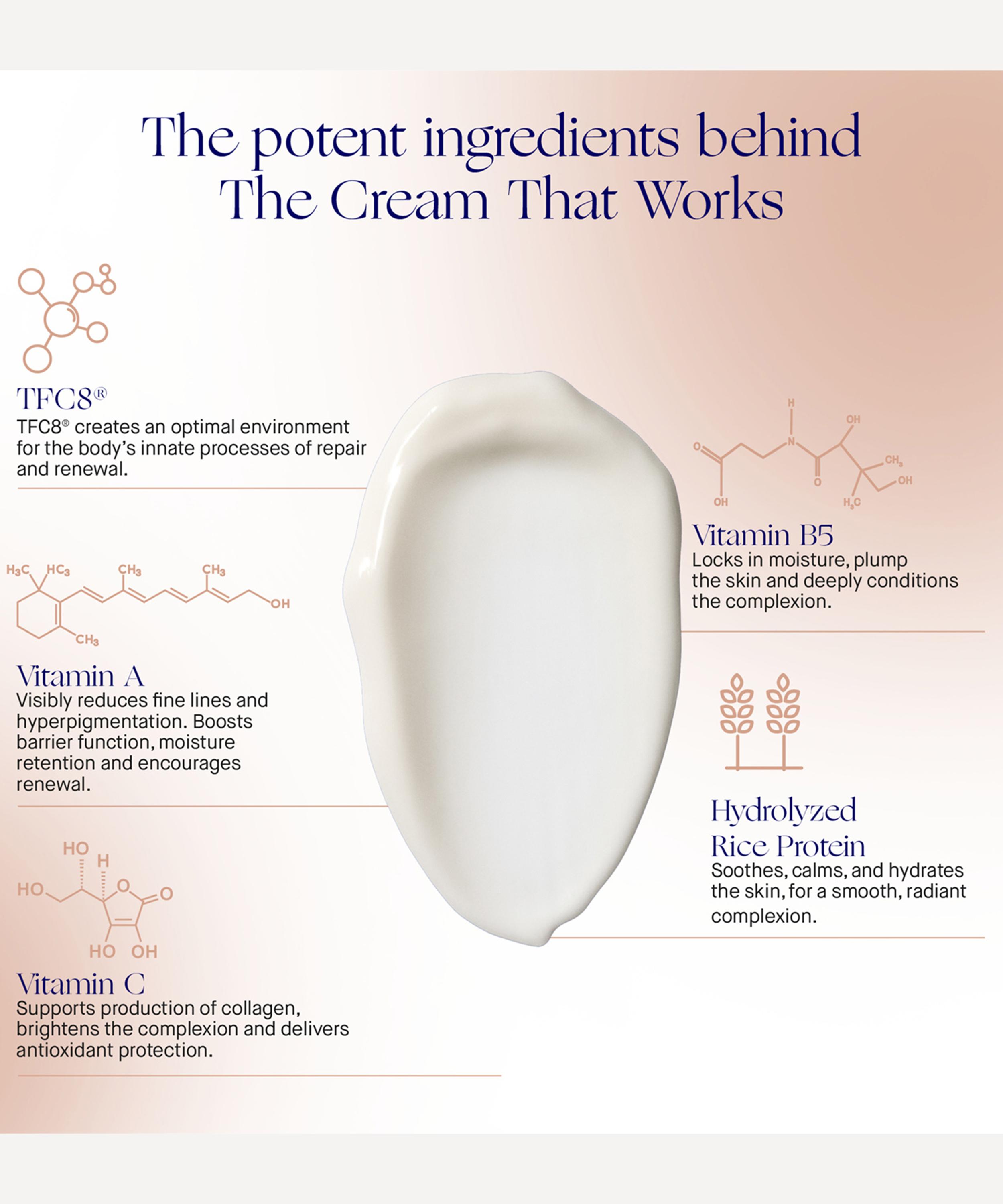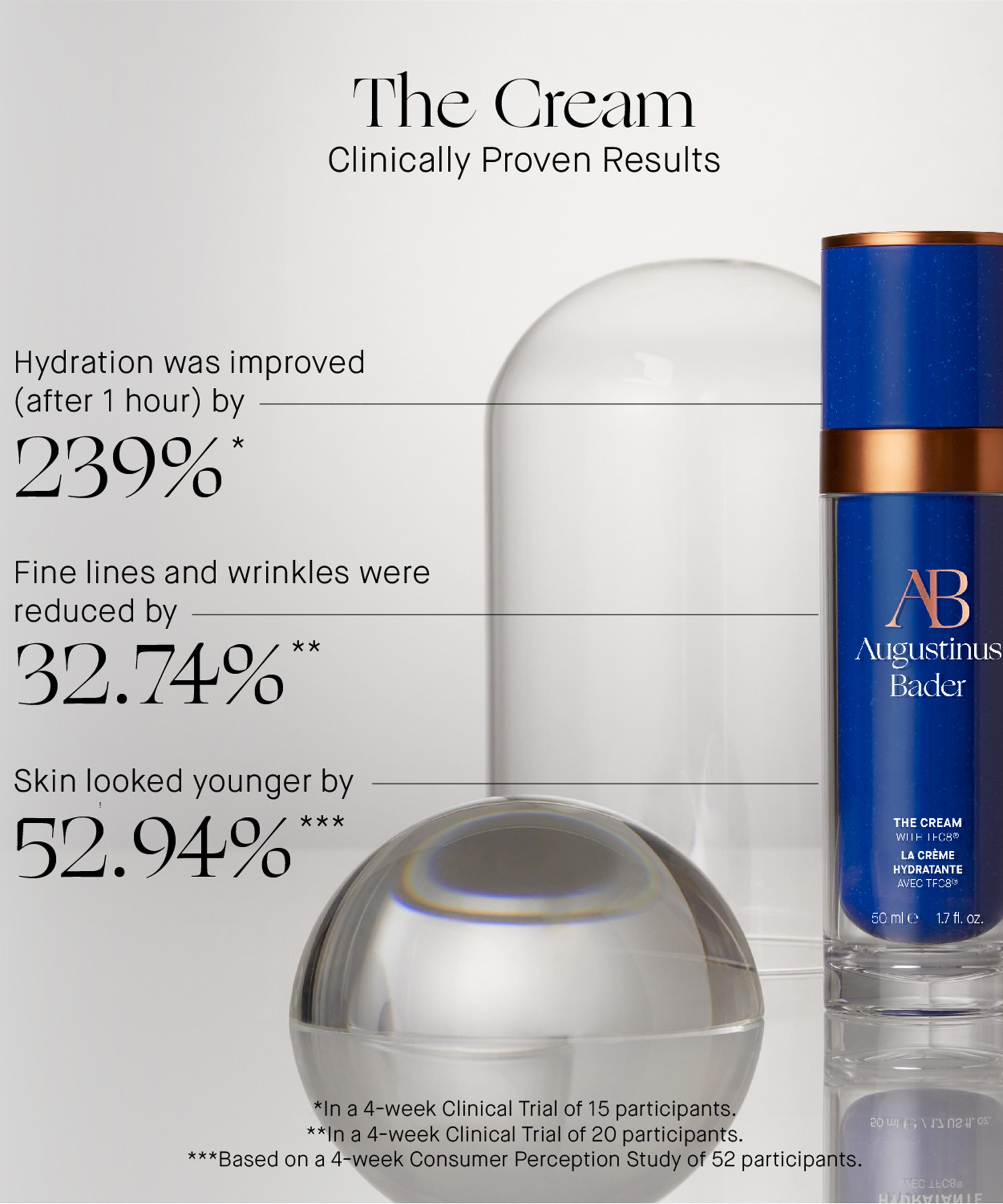 Morning and evening after cleansing and drying, smooth the desired amount over face, neck and décolleté. To activate Augustinus Bader's patented TFC8®, start by massaging the cream along your jawline in upward sweeping motions. Sweep from your nose to your ears and across your forehead, then massage over cheeks and temples. Apply from the base of the neck to the tip of the chin, then take any excess cream and massage over the décolleté.