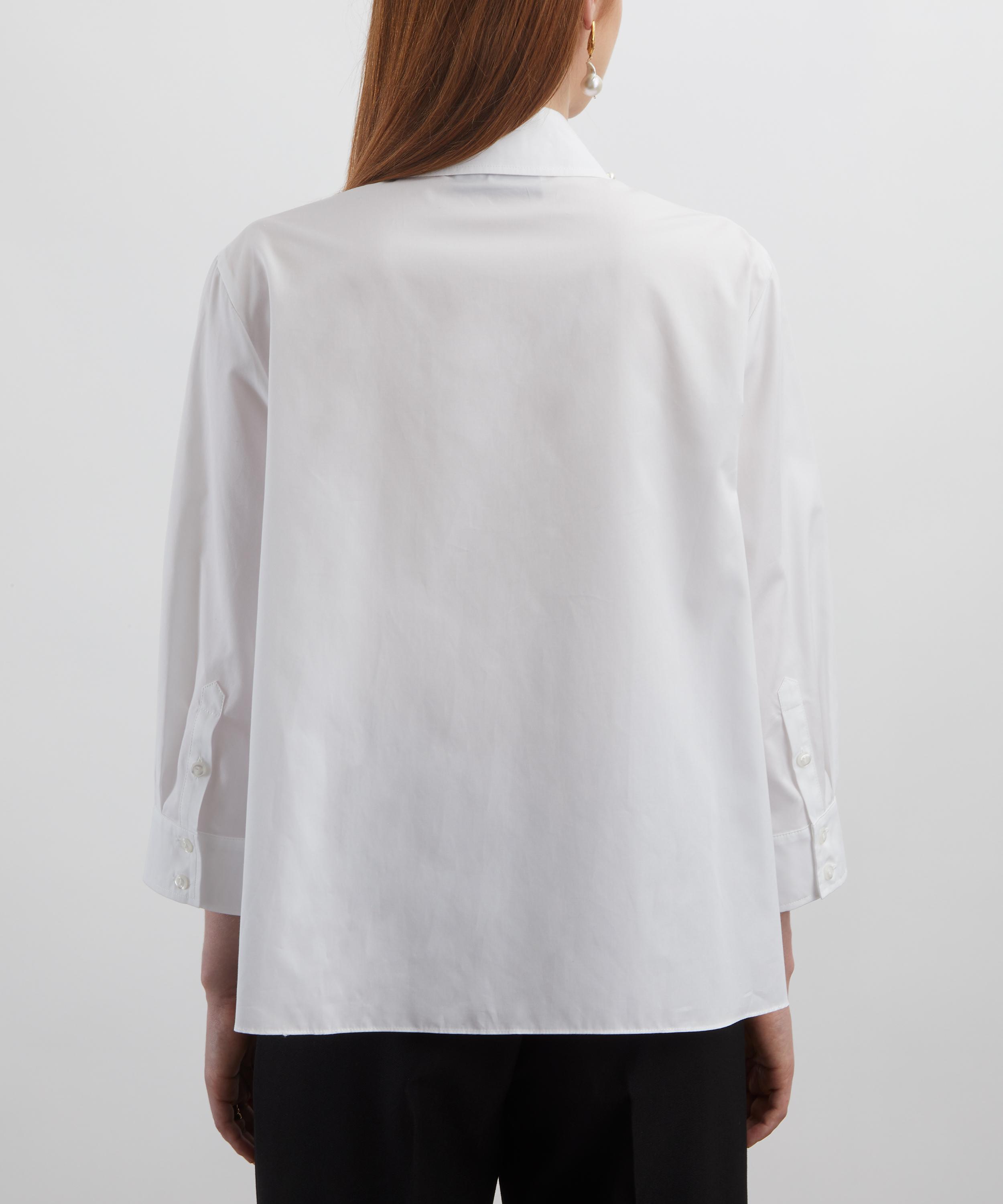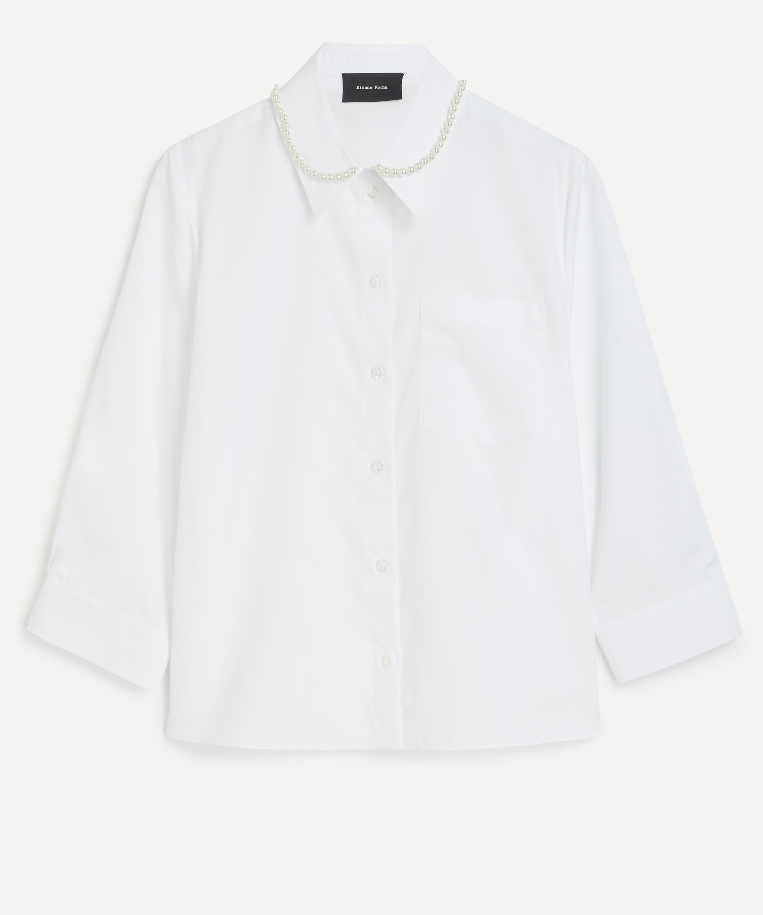Crafted from crisp cotton poplin, this cropped shirt is adorned with delicate faux pearl embellishments along the spread collar, adding a touch of romantic elegance. Featuring a button closure, shirttail hem, and tailored cropped fit, it reimagines classic menswear through a distinctly feminine lens.