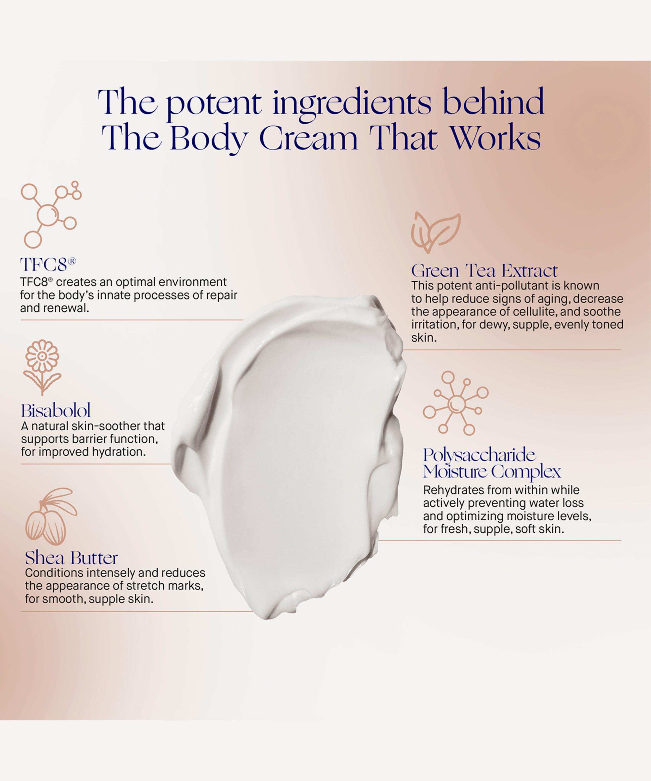 The Body Cream: Aqua/Water/Eau, Butyrospermum Parkii (Shea) Butter, Behenyl Alcohol, Dicaprylyl Ether, Glycerin, Lauryl Laurate, Myristyl Myristate, Glyceryl Stearate, Polyglyceryl-3 Methylglucose Distearate, Sodium Stearoyl Glutamate, Xylitylglucoside, Anhydroxylitol, Citric Acid, Xylitol, Chlorphenesin, Xanthan Gum, Bisabolol, Sodium Benzoate, Tocopherol, Helianthus Annuus (Sunflower) Seed Oil, Glucose, Tocopheryl Acetate, Caprylic/Capric Triglyceride, Hydrogenated Phosphatidylcholine, Hydrolyzed Rice Protein, Maltodextrin, Niacinamide, Sodium Hydroxide, Alanyl Glutamine, Arginine, Camellia Sinensis Leaf Extract, Pentylene Glycol, Squalane, Brassica Alba Seed Extract, Ceramide NP, Hydrogenated Lecithin, Oligopeptide-177, Phenylalanine, Potassium Sorbate, Sodium Chloride.