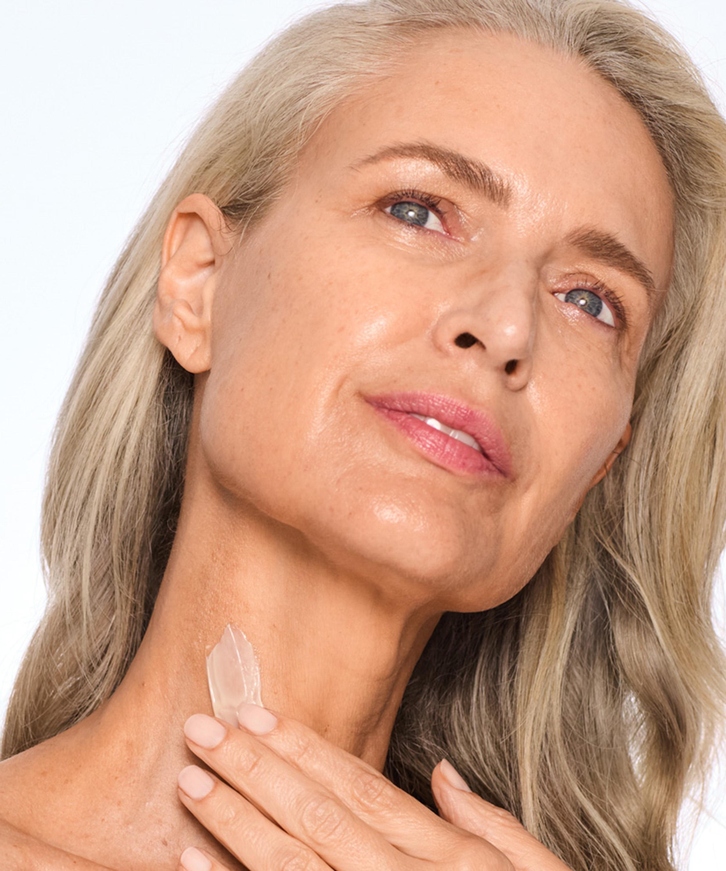 After your serum step, apply three pumps to your neck and décolleté using upward motions. Take some time to massage the neck for added skin-smoothing benefits.