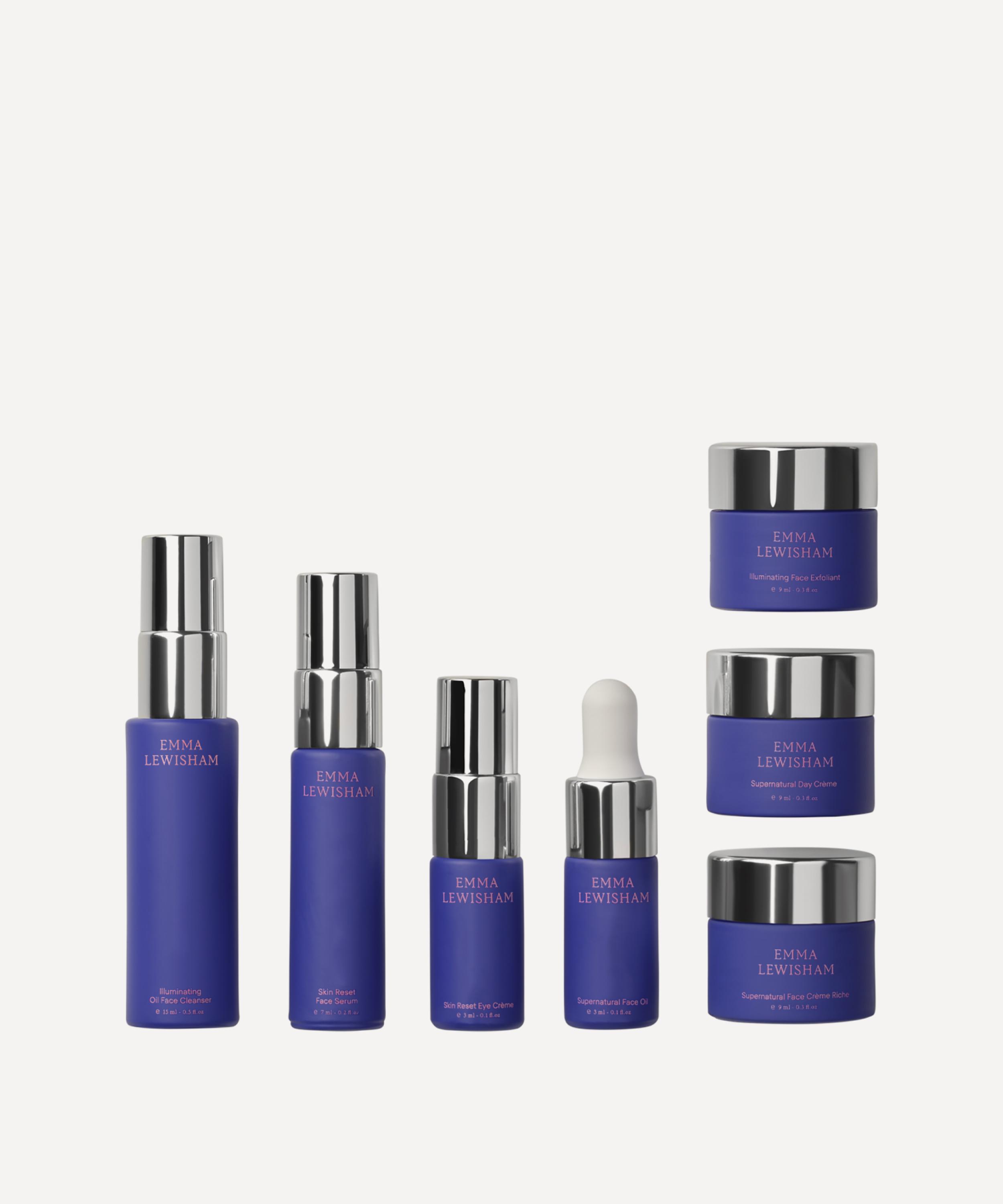 - The Emma Lewisham Essentials includes: Illuminating Brighten Your Day Crème 9ml, Skin Reset Eye Crème 3ml, Illuminating Exfoliant 9ml, Supernatural Face Crème Riche 9ml, Illuminating Oil Cleanser 15ml, Skin Reset Face Serum 7ml and Supernatural Face Oil 3ml