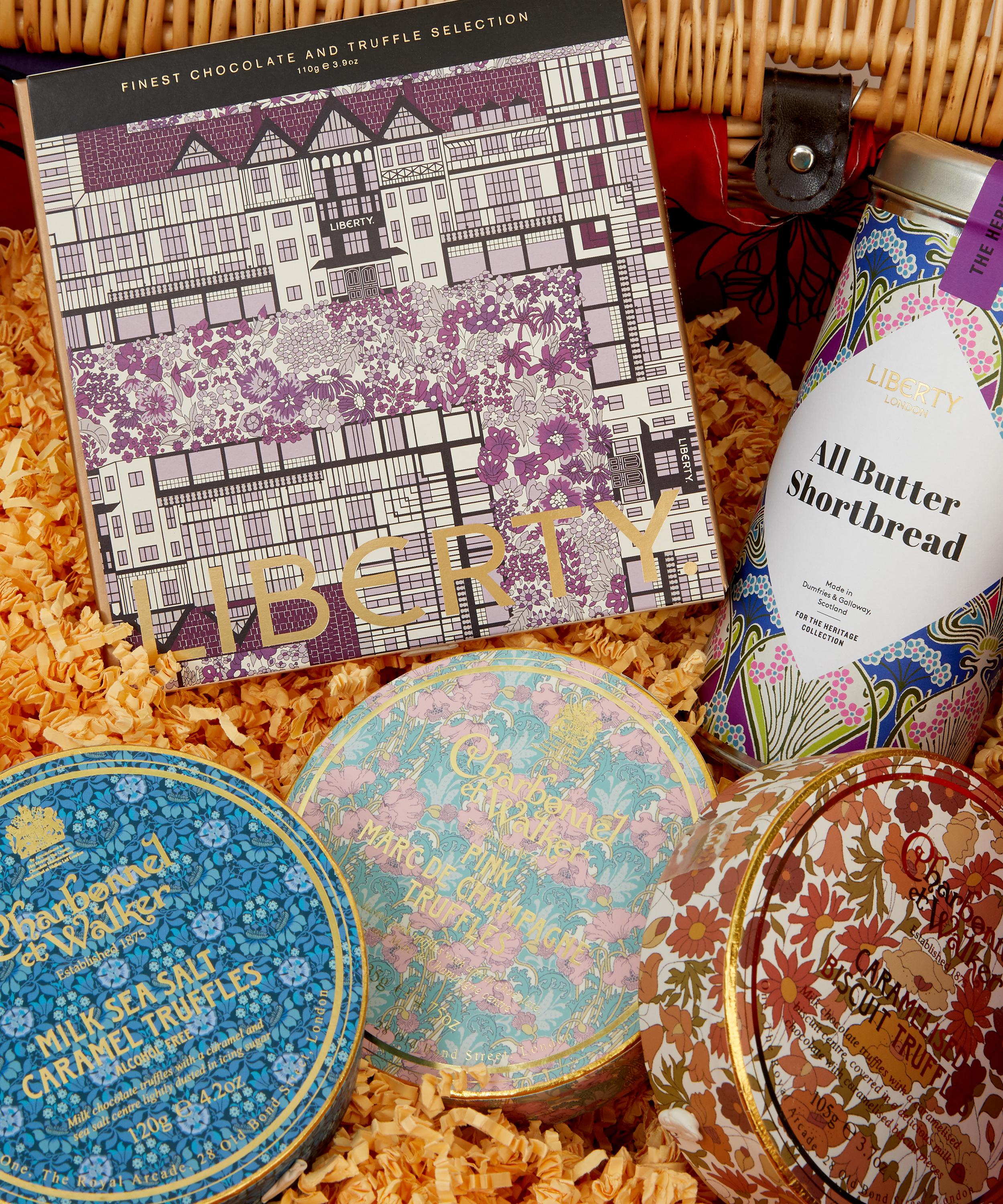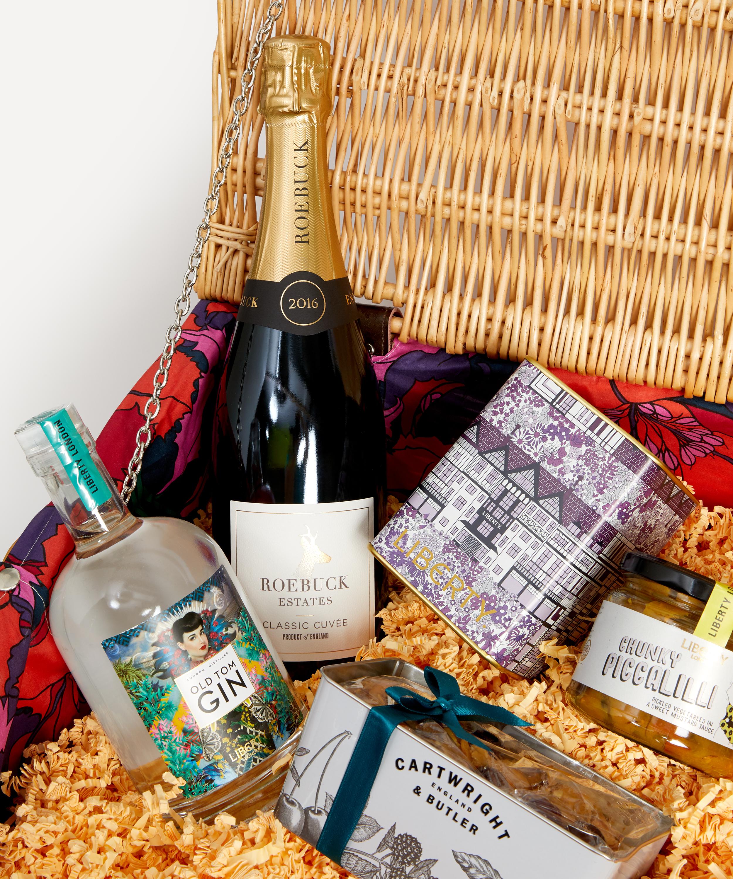 - Includes: Eustacia Wicker Hamper, Liberty Old Tom Gin (500ml), Roebuck Estates Classic Cuvée 2014 (750ml), Liberty Tudor English Breakfast Tea (40g), Liberty Heritage Strawberry Jam (227g), Manfood Chunky Piccalilli (300g), The Fine Cheese Co. Flavoured Crackers Selection Box (375g), Liberty Heritage Fruit Shortbread Biscuits (230g), Liberty Heritage All-Butter Shortbread Biscuits (230g), Liberty Print Milk Sea Salt Caramel Truffles (120g), Liberty Print Caramelised Biscuit Truffles (120g), Liberty Print Pink Marc de Champagne Truffles (135g), Liberty Tudor Finest Chocolate and Truffle Selection (110g), Cartwright & Butler Cherry & Almond Loaf Cake in Tin (550g)