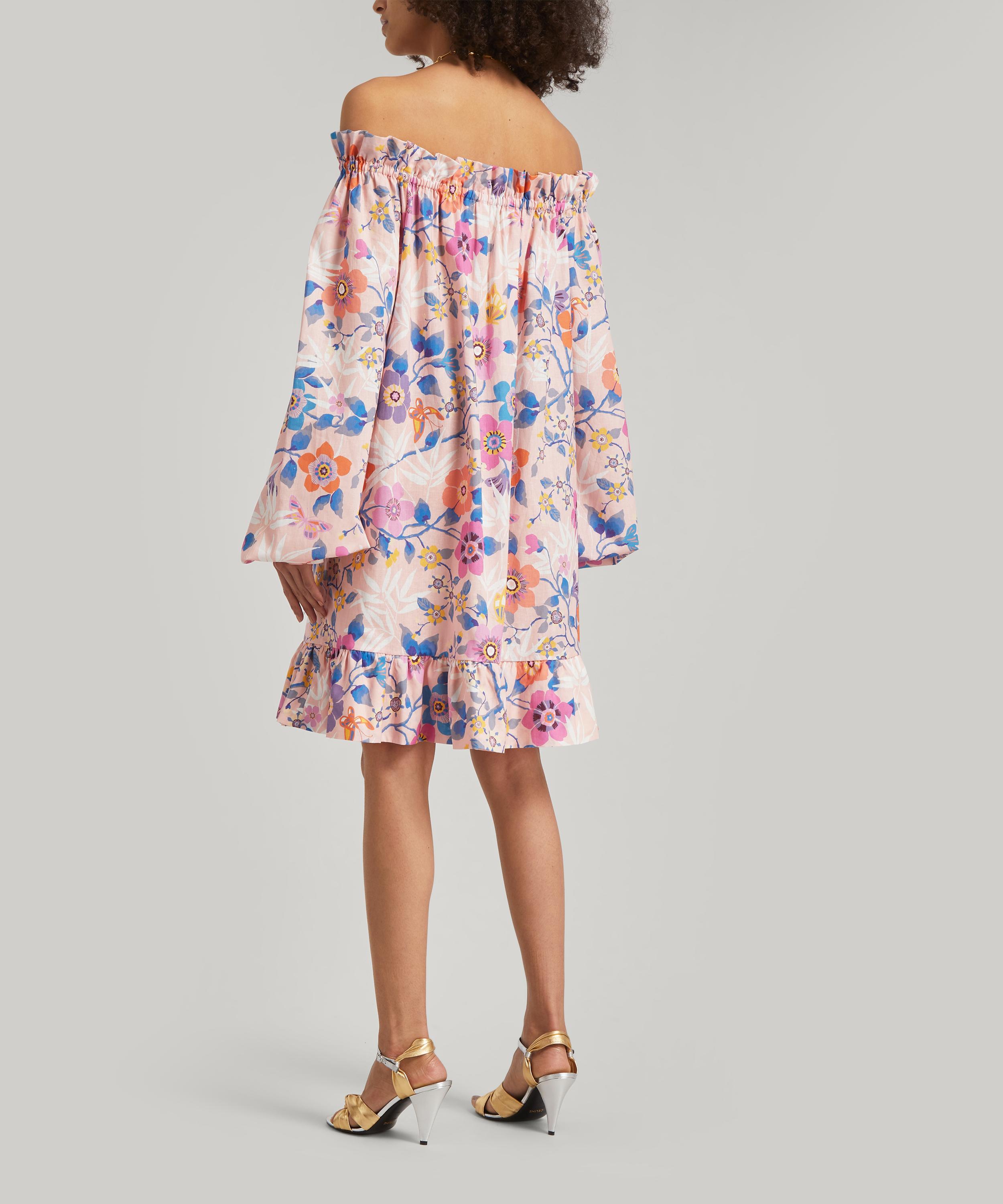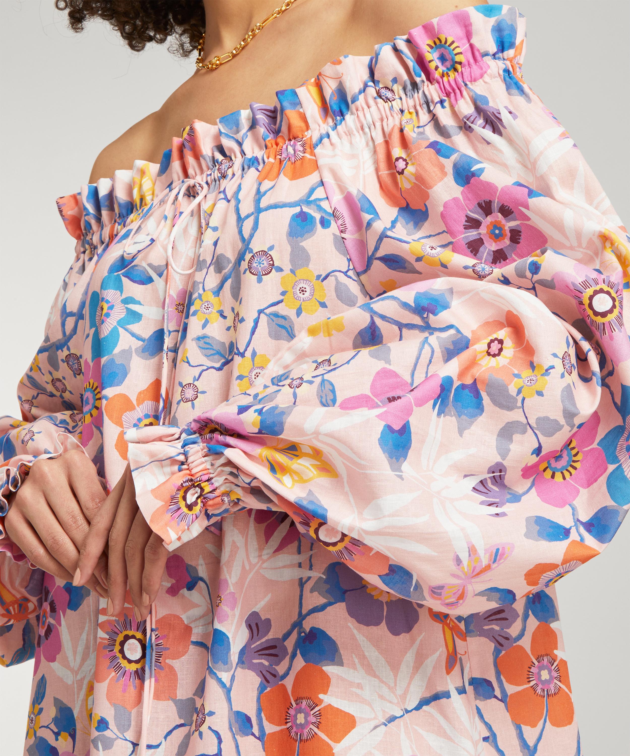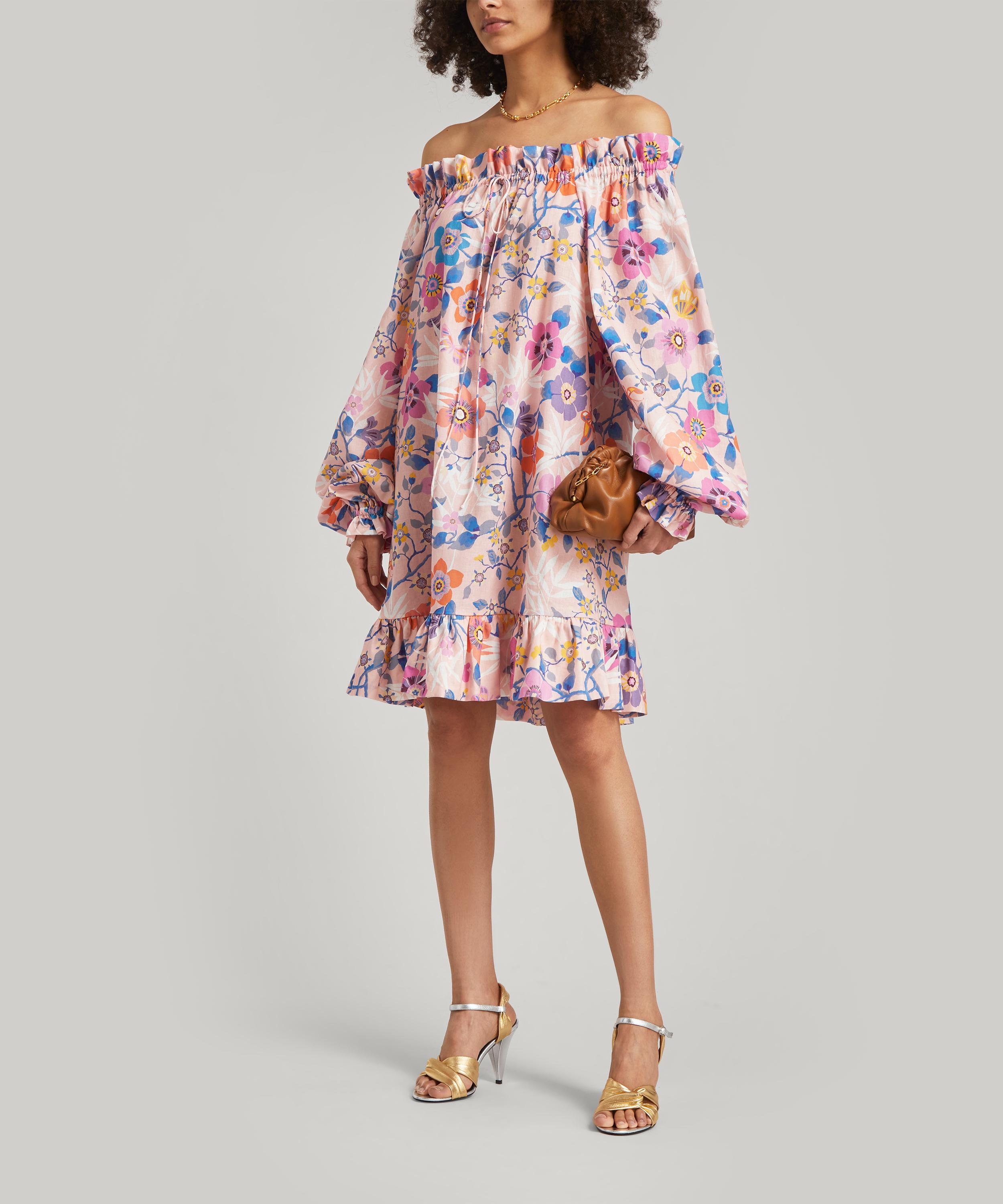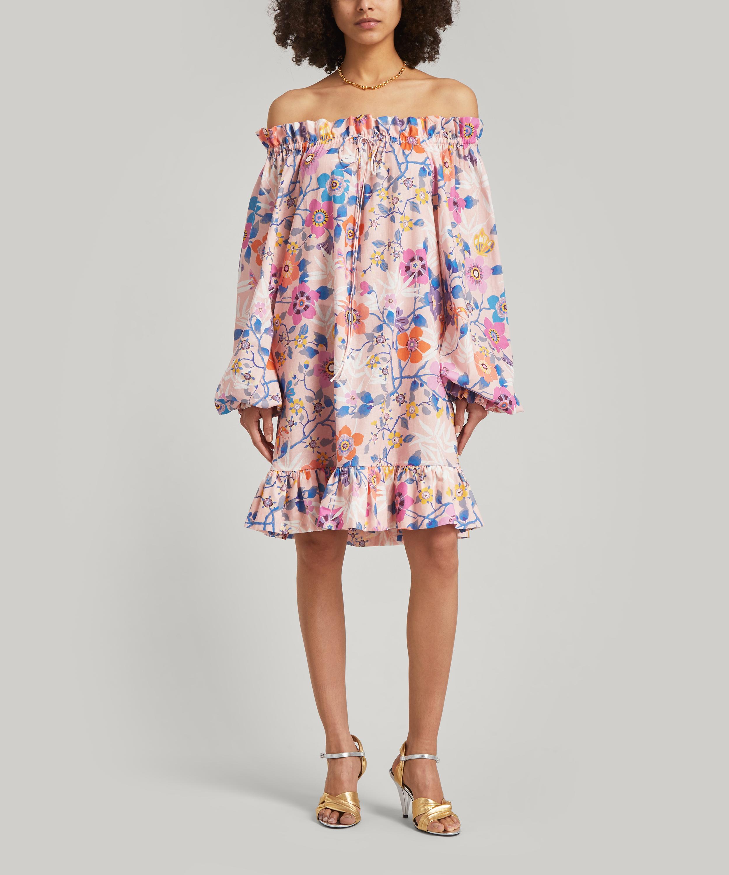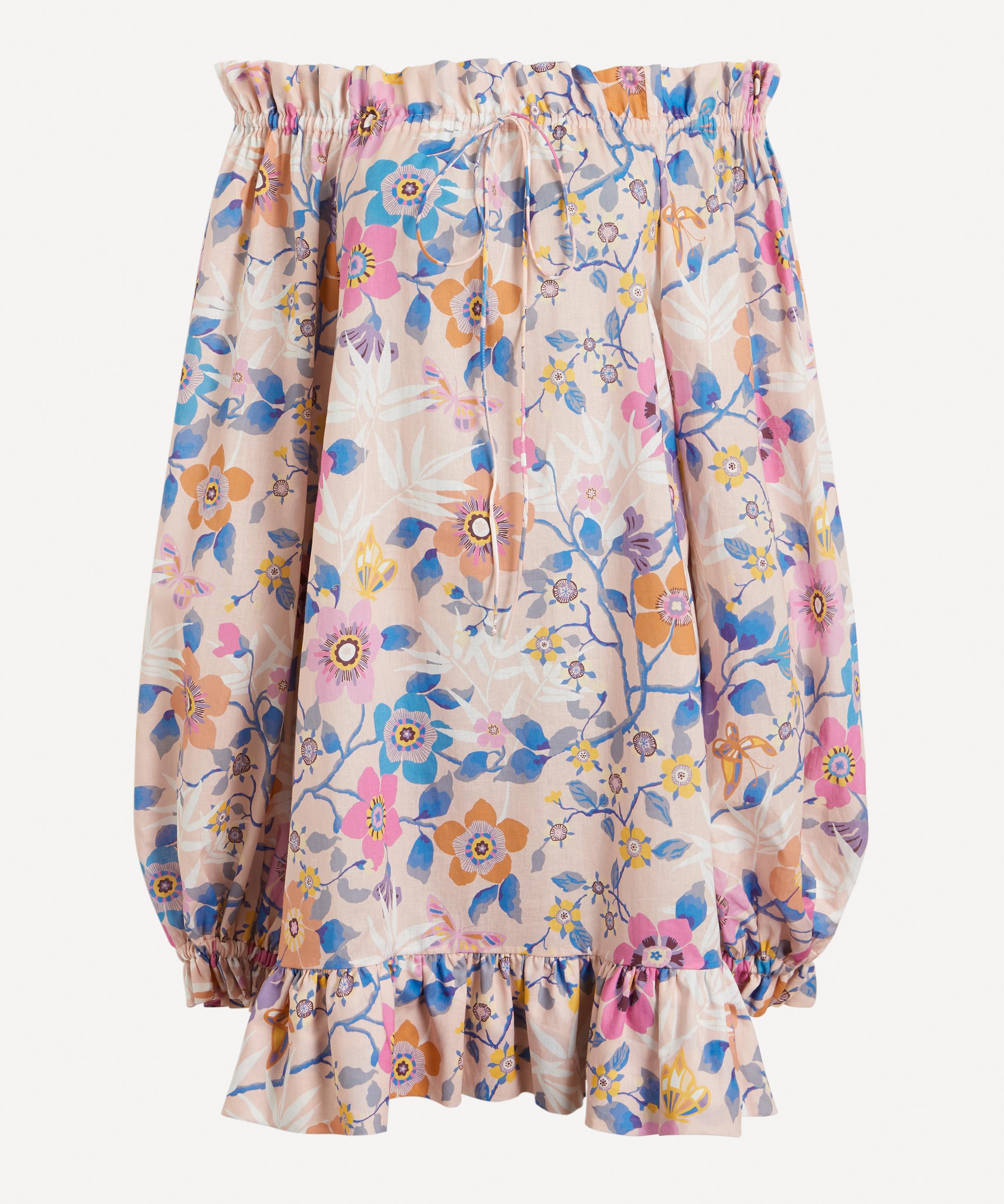 The Vampire’s Wife’s Mini Mob dress is tailored from a floral linen-cotton blend in a highly feminine short, shoulder-less silhouette with exaggerated, flowing bell-sleeves.