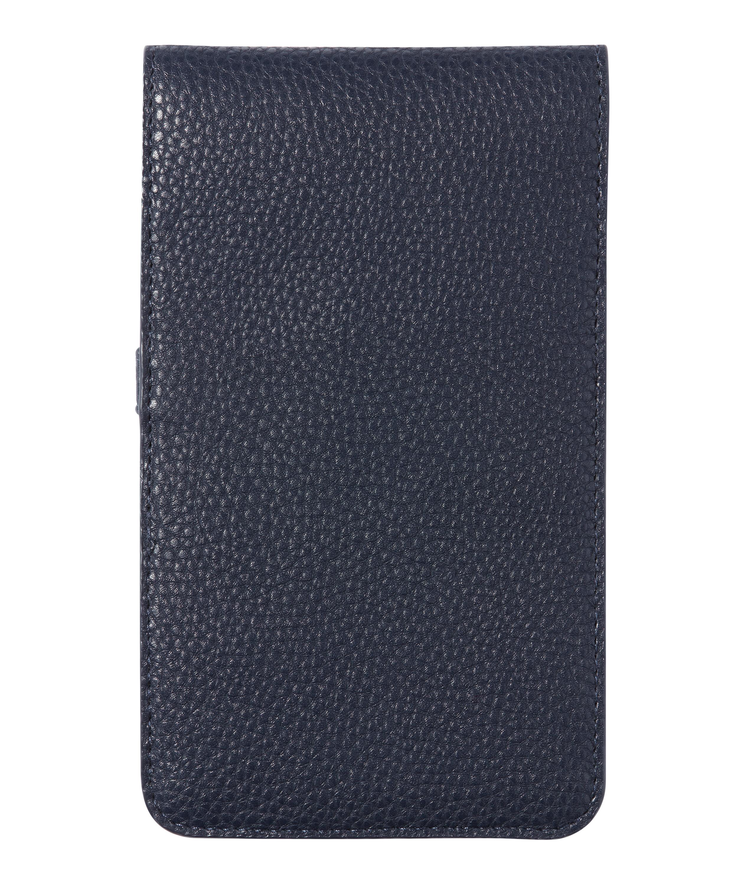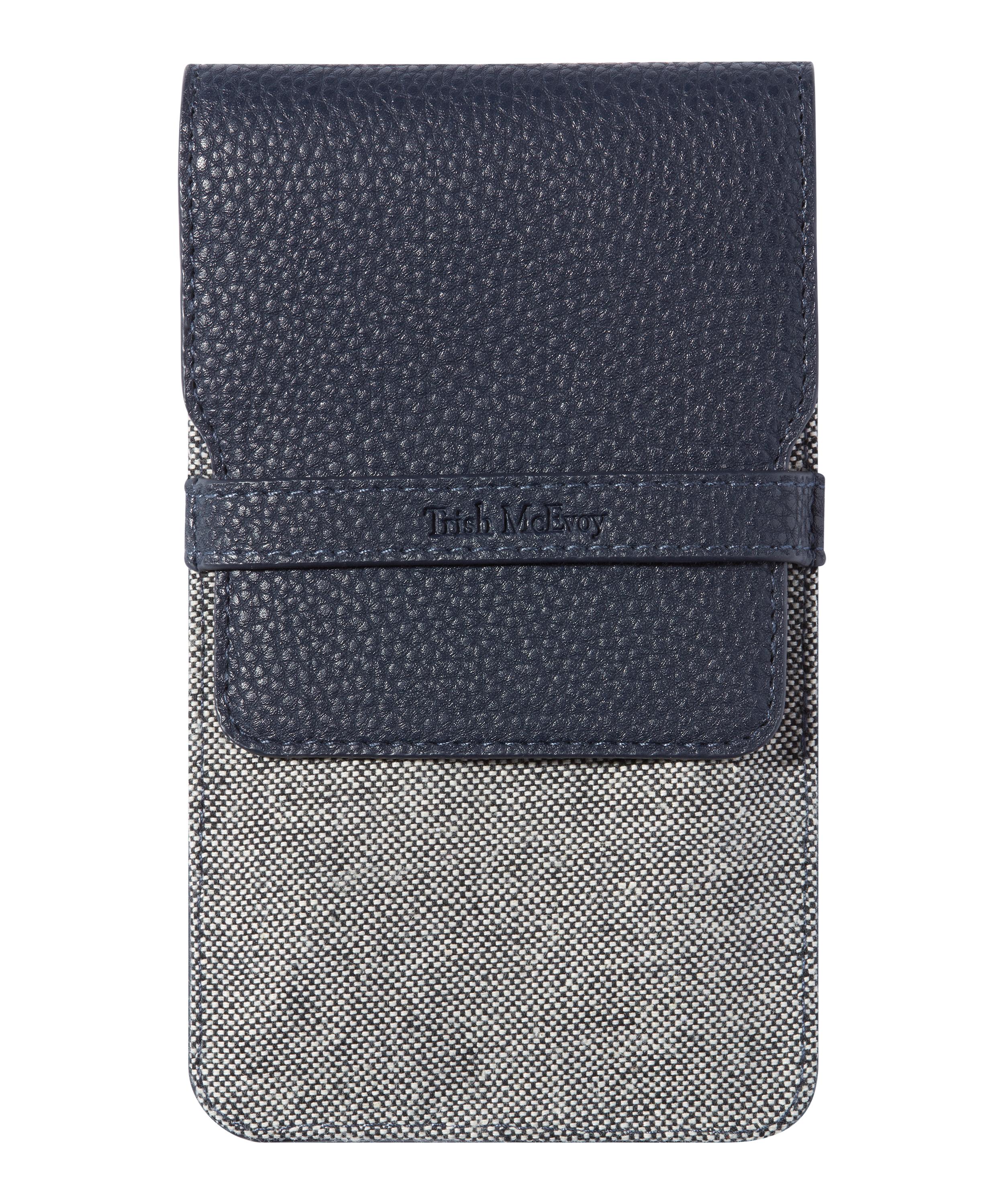 - Housed in a grained leather and woven flap-top pouch
