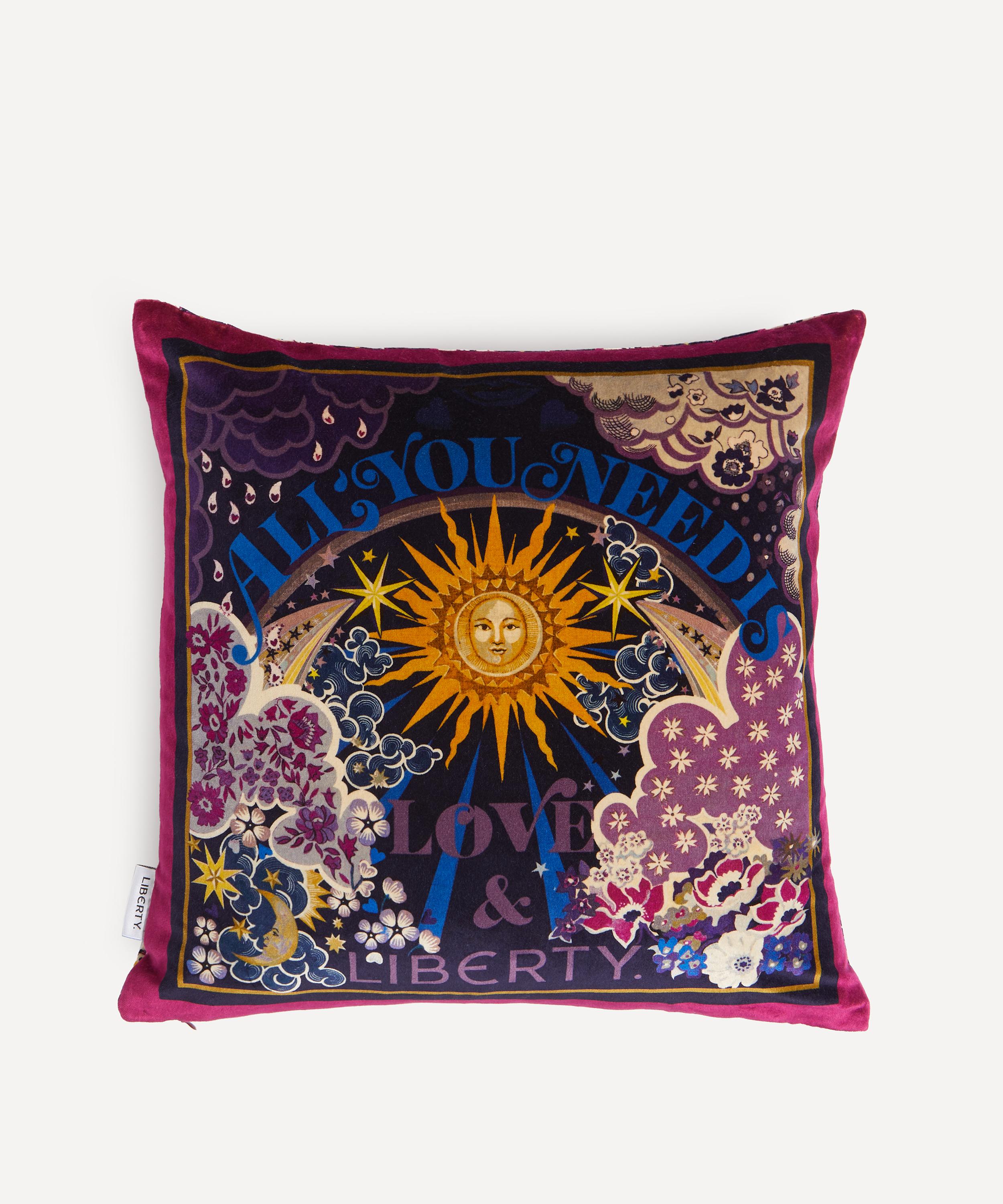 The square velvet cushion features our The Power of Love & Liberty design – based on one of four designs created in an exclusive series of Liberty scarves, it was originally hand-painted at home by our Liberty designers as an artistic response to the hope and love felt within our community during lockdown. Decadently plump with a recycled duck feather filling, arrange on a daybed or armchair for a luxe heritage-inflected approach to modern interior styling.