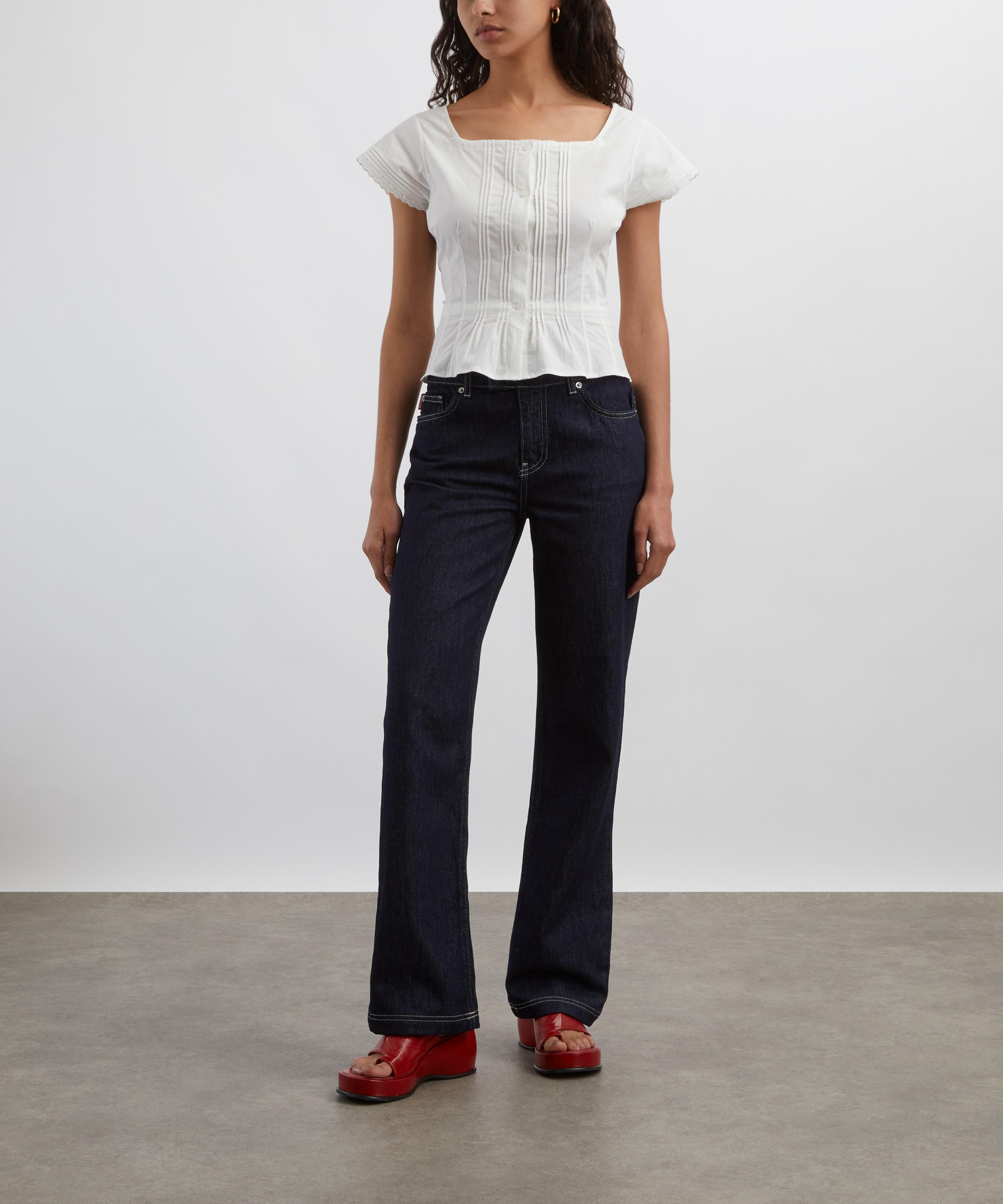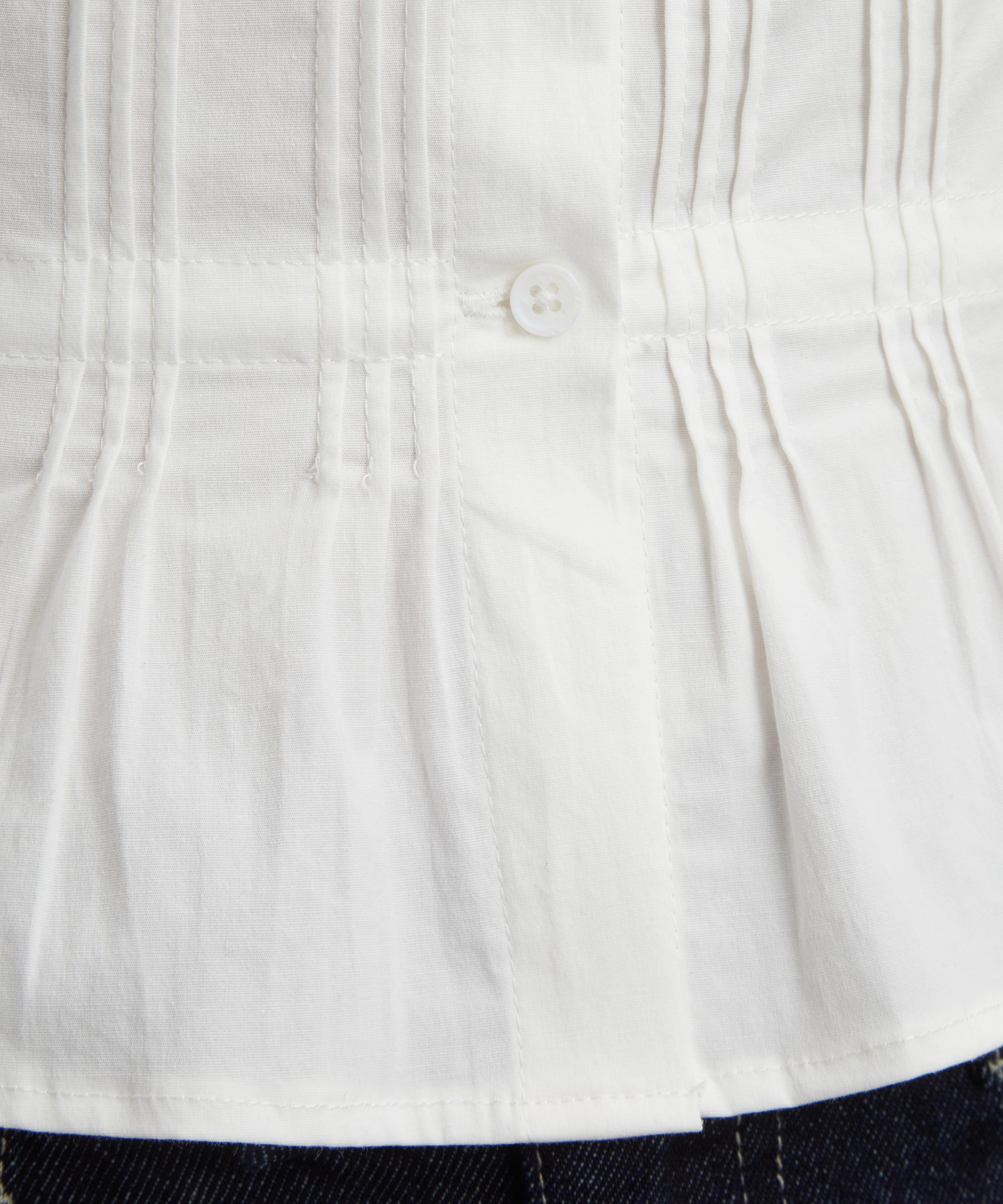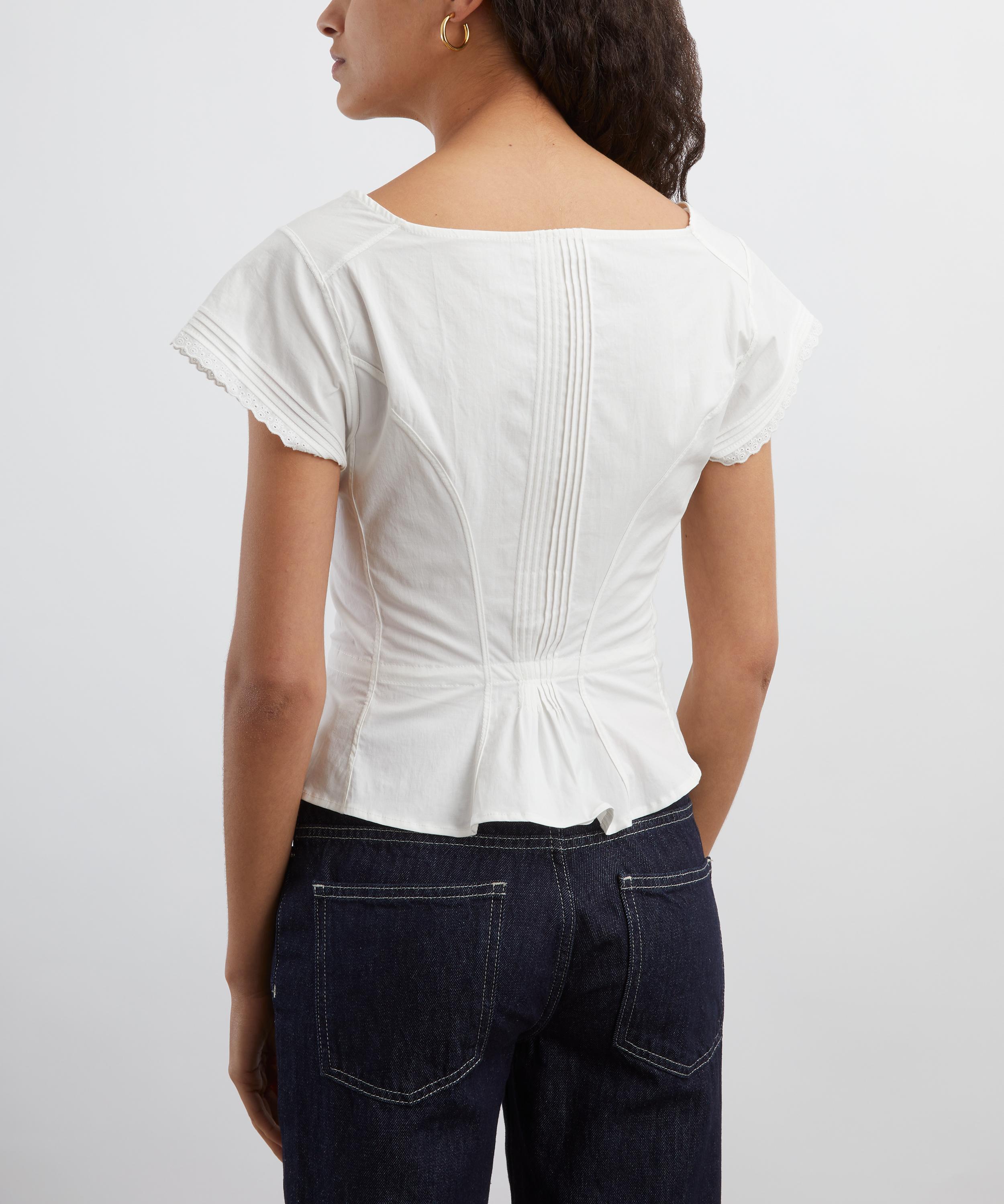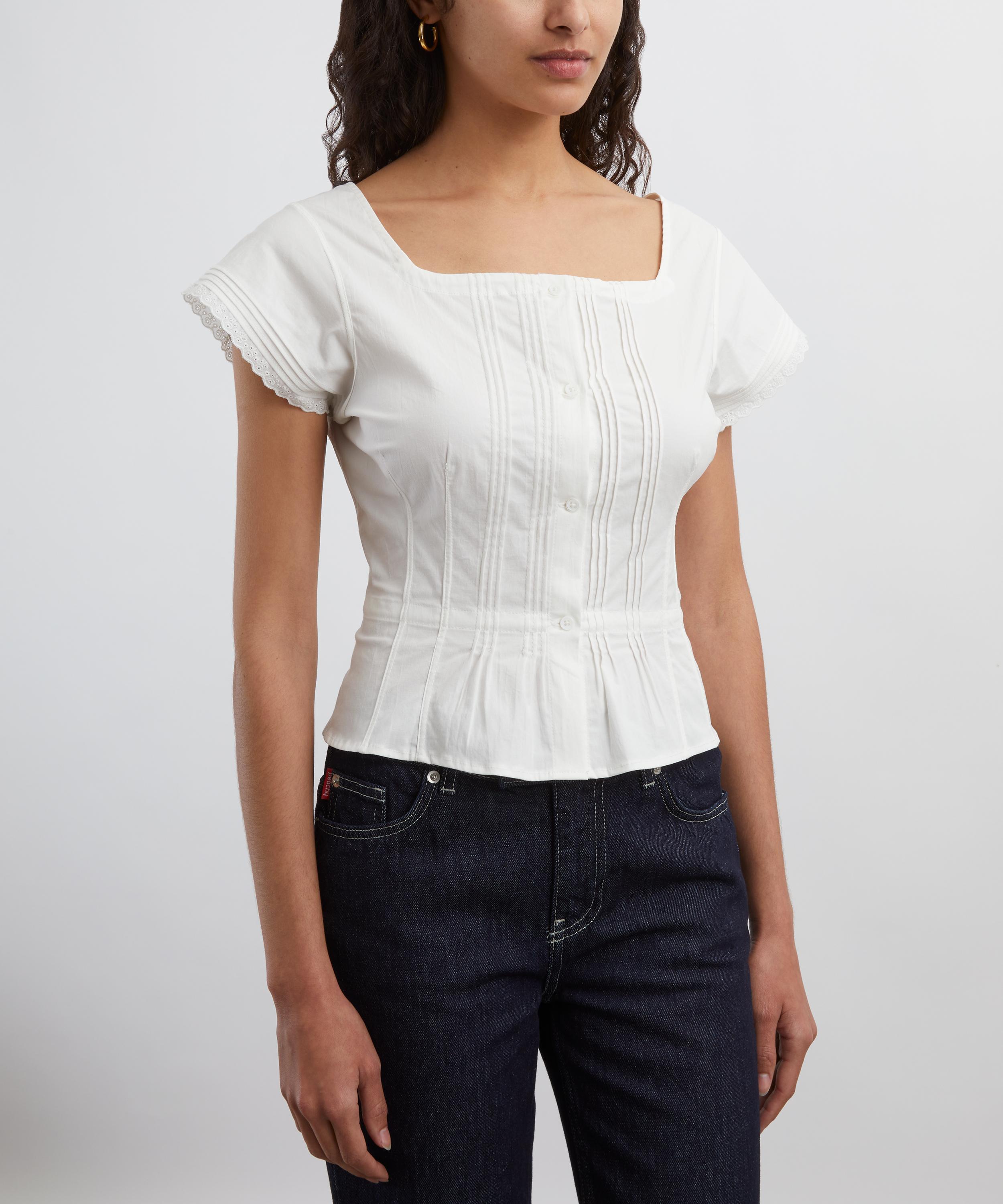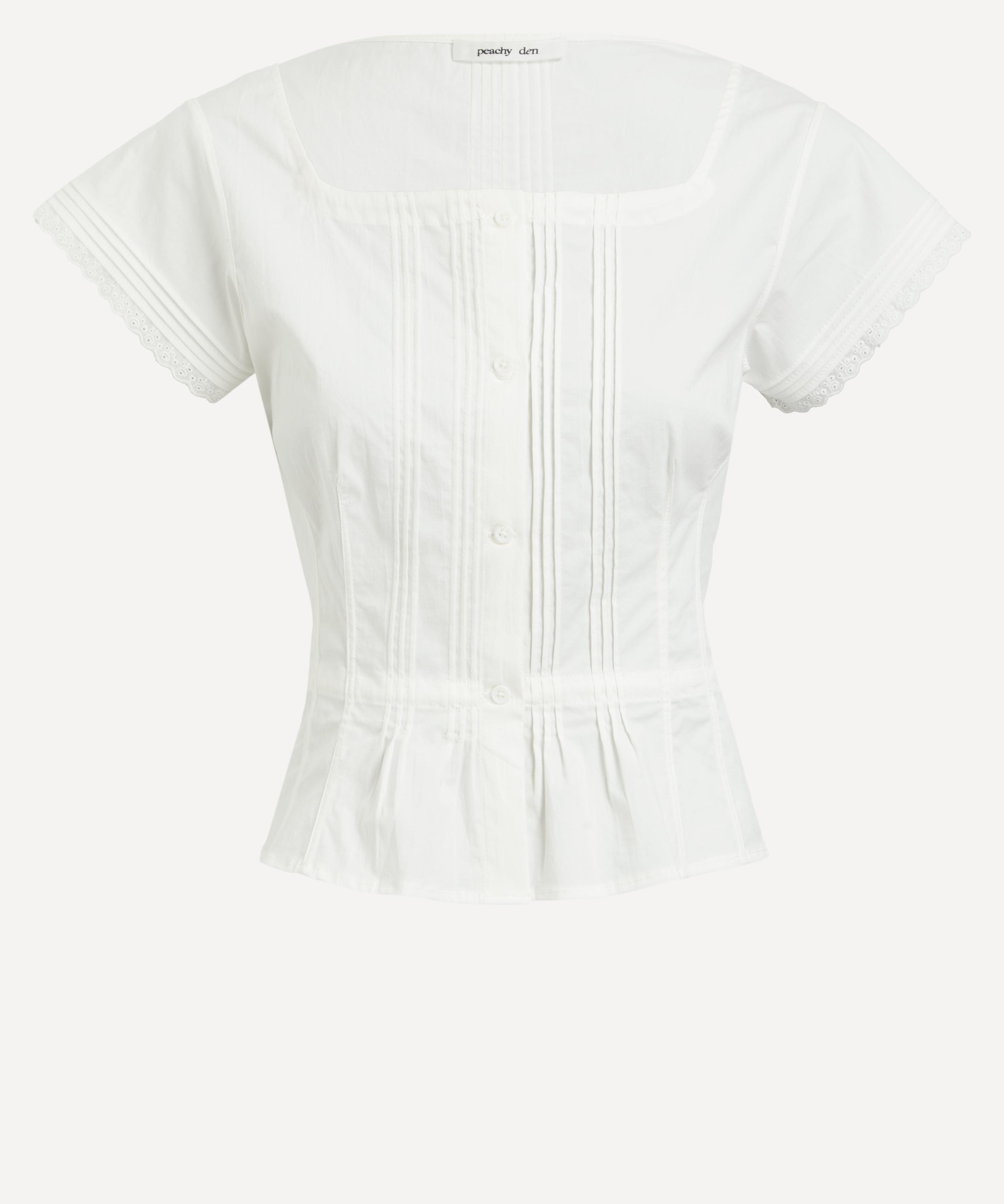 Pretty and playful, this shirt features a pin tick design with a fitted cut, dainty buttons and lace trims – offering a chic, 1930s French Riviera inspired silhouette.Composition & Care