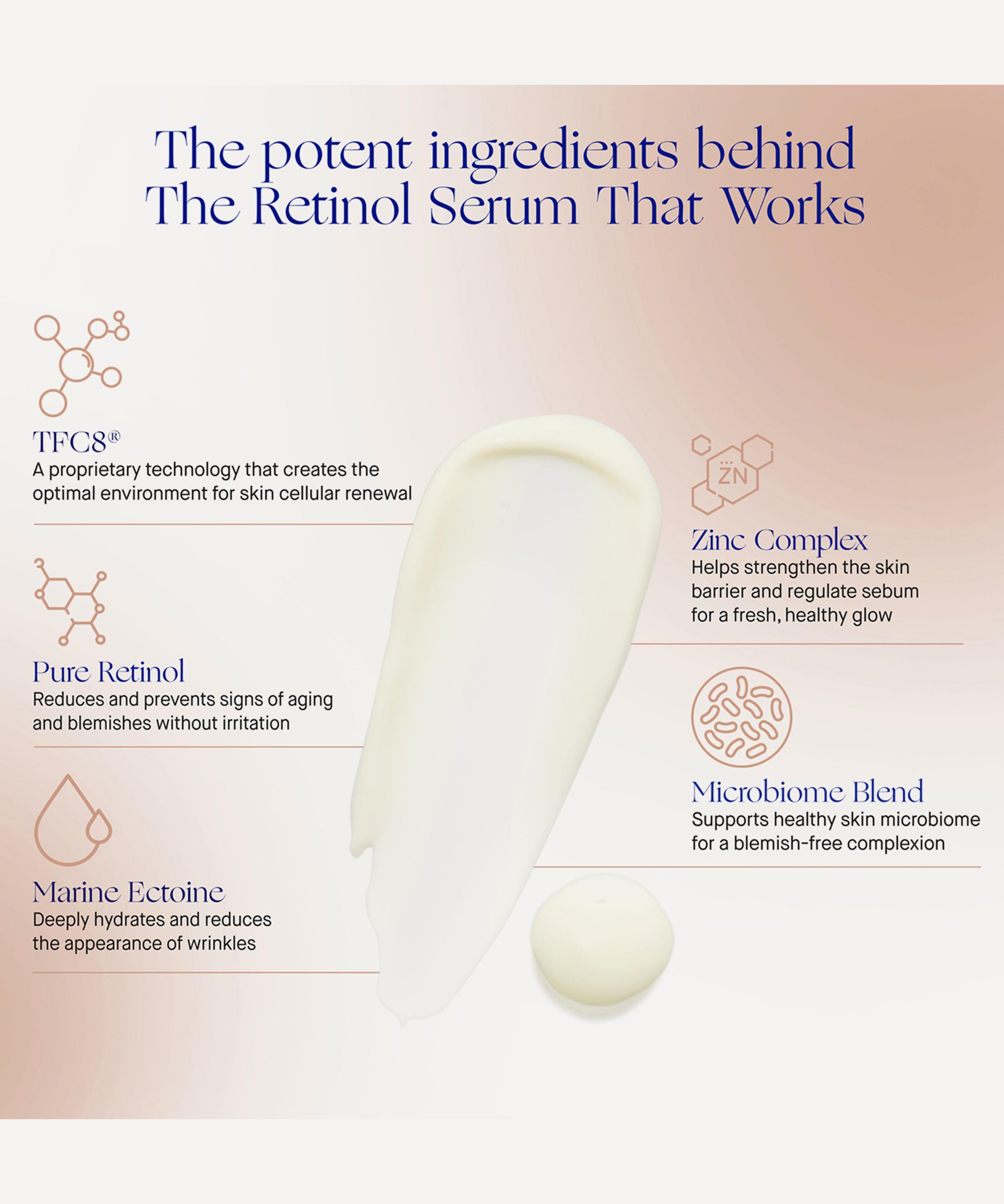This silky smooth, lightweight serum envelops skin in a multitude of replenishing ingredients, including marine ectoine and pure retinol to visibly smooth and banish signs of ageing, while protecting from future breakouts and environmental agressors - leaving you with clear, purified and plumped skin.