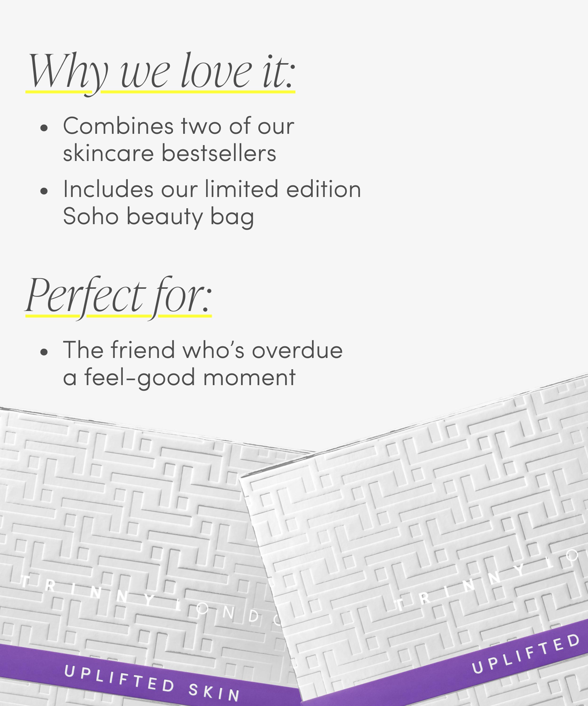 Delivering everyday essentials for optimal radiance in a limited-edition beauty bag, The Uplifted Skin Set by Trinny London delivers instant, skin-refining results – curated to firm and lift all skin types.