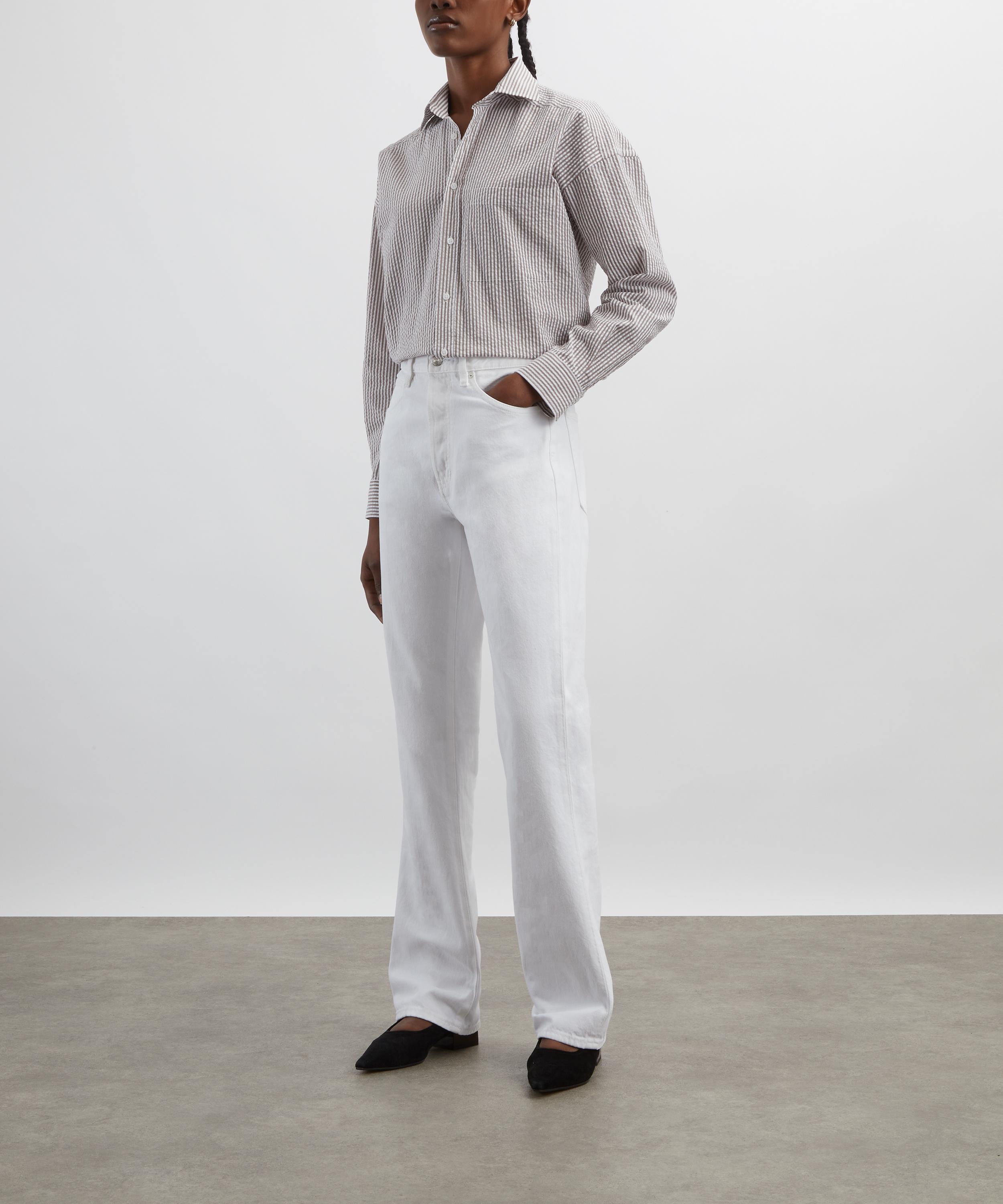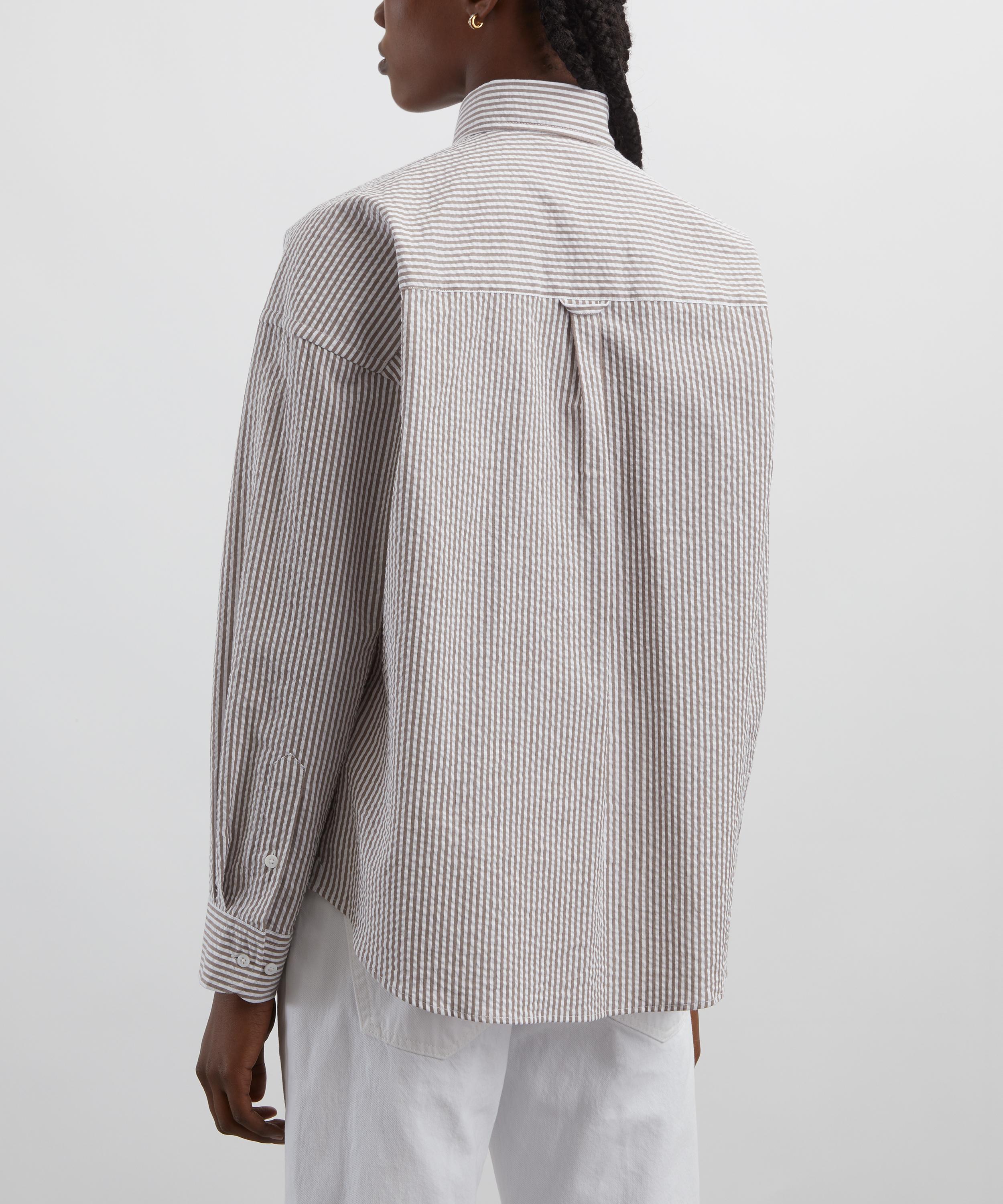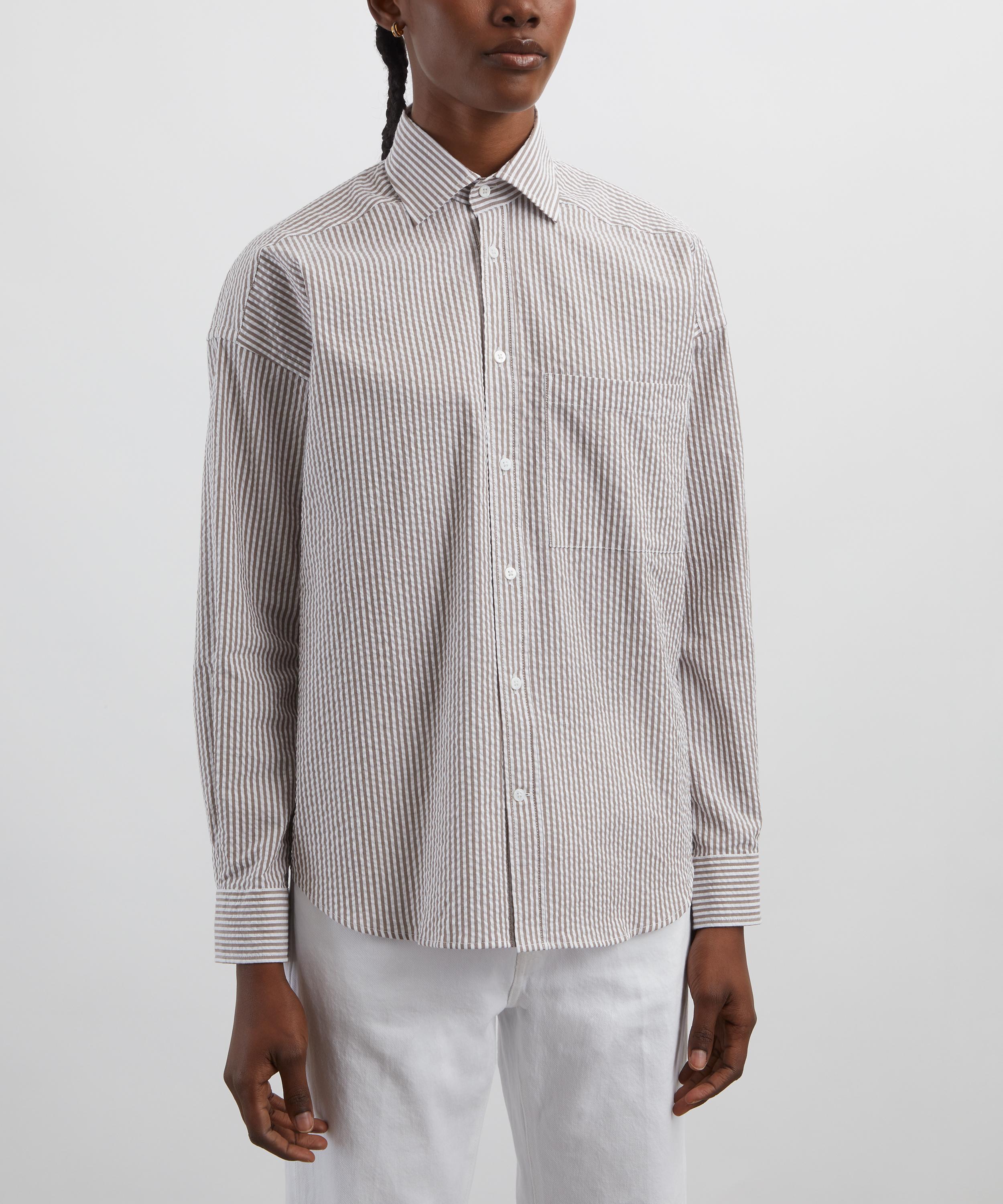 Boasting the perfect addition to your capsule wardrobe, London-based brand With Nothing Underneath presents The Weekend Seersucker Mocha Stripe Shirt.
