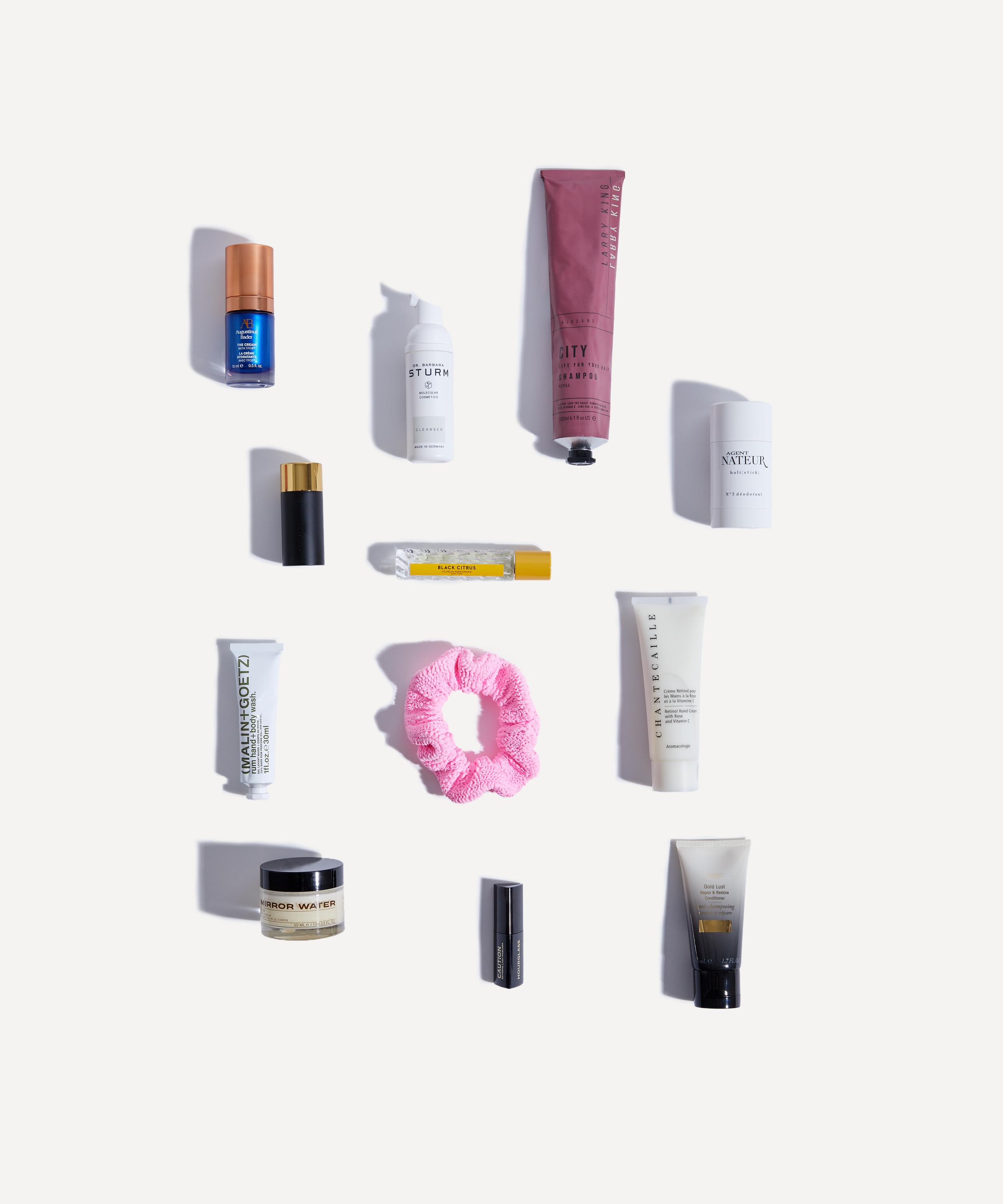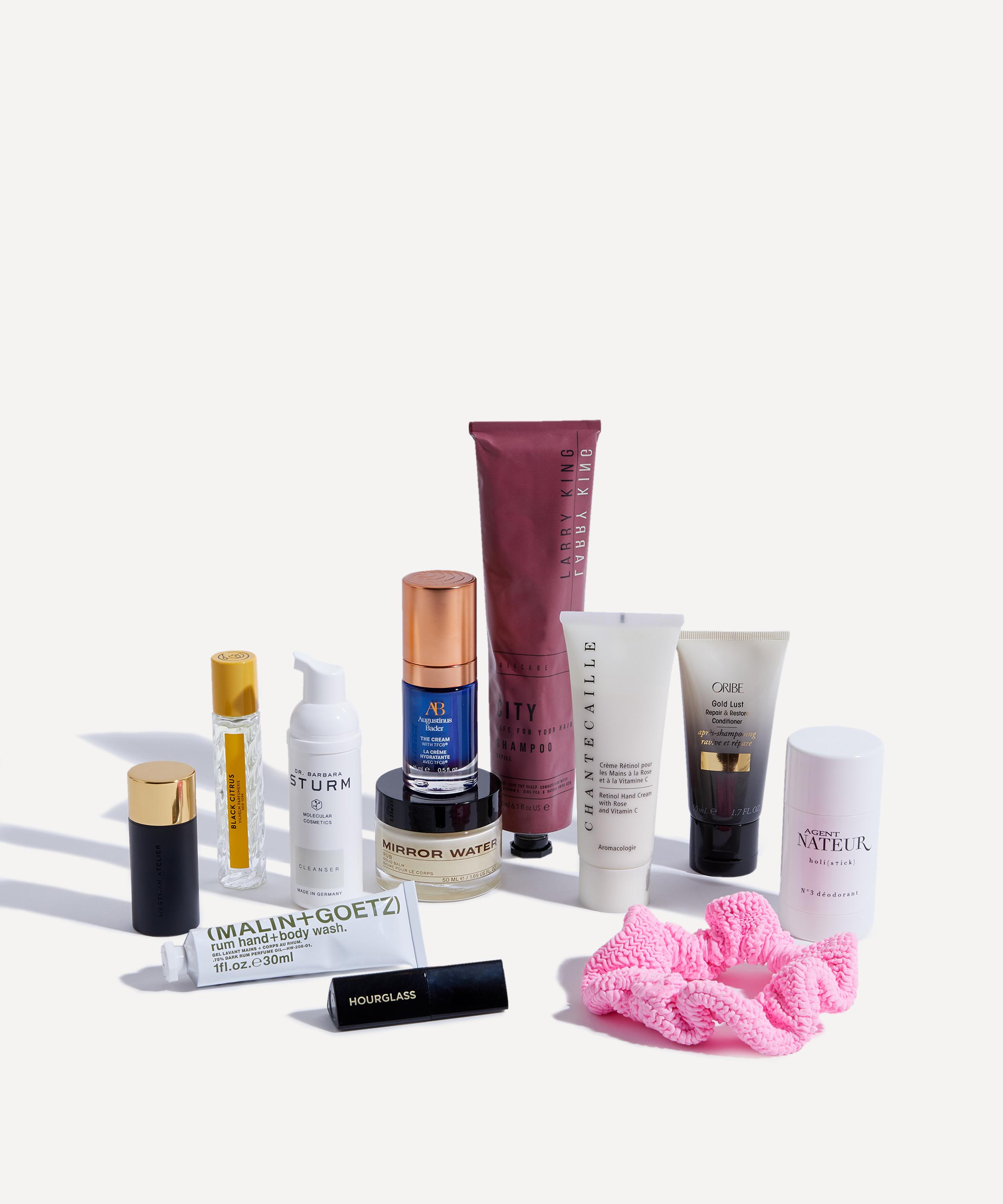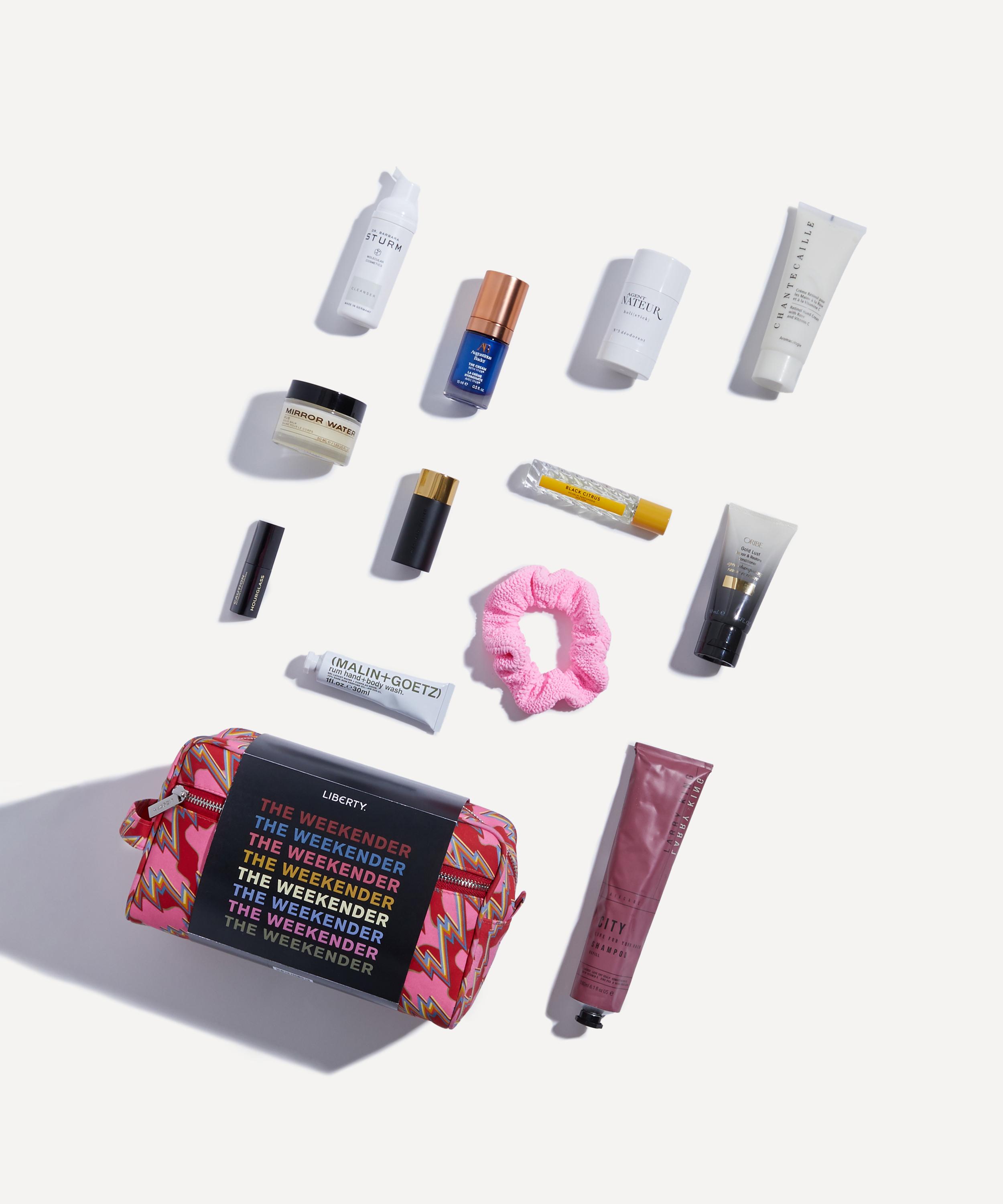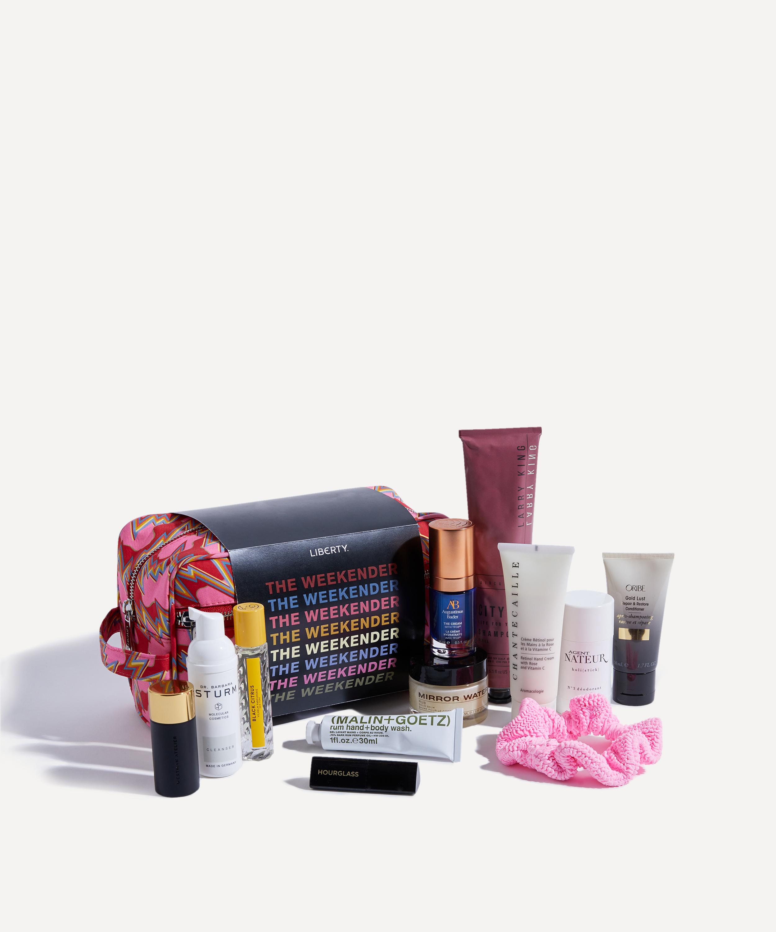 • The Weekender Beauty Kit includes: Dr. Barbara Sturm Cleanser 50ml, Larry King City Life Shampoo 180ml, Hunza G Scrunchie in Bubblegum, Augustinus Bader The Cream 15ml, Hourglass Caution Extreme Lash Mascara Travel Size 5.5g, Vilhelm Parfumerie Black Citrus Eau de Parfum 10ml, Westman Atelier Lit Up in Nectar, Agent Nateur h o l i ( s t i c k ) No.3 Deodorant 50ml, Chantecaille Retinol Hand Treatment 75ml, Mirror Water RUB Solid Balm 50ml, Oribe Gold Lust Repair Conditioner 50ml, (Malin+Goetz) Rum Hand and Body Wash 30ml and a Liberty print washbag