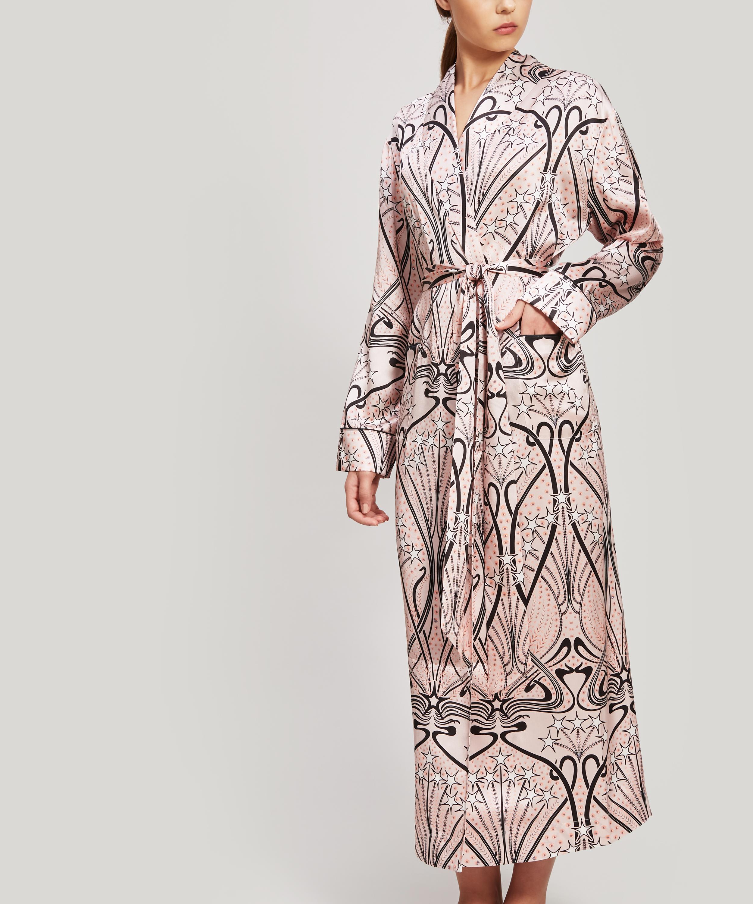 Our Thelma design is expertly printed onto silk charmeuse, a lustrous satin-weave fabric that combines a radiant sheen with intense colour vibrancy. The robe features chic piping on the cuffs and pockets, with a cinched waist tie and a shawl collar. Its flowing silhouette is printed with Thelma – a modern twist on Liberty’s iconic Art Nouveau design Ianthe, with the design’s flowers swapped for a celestial scattering of stars. Throw on a long, flowing robe with mules and cut-off jeans for an easy daytime look, or slip it into your holdall for a slice of night-time indulgence on your next great travel adventure.