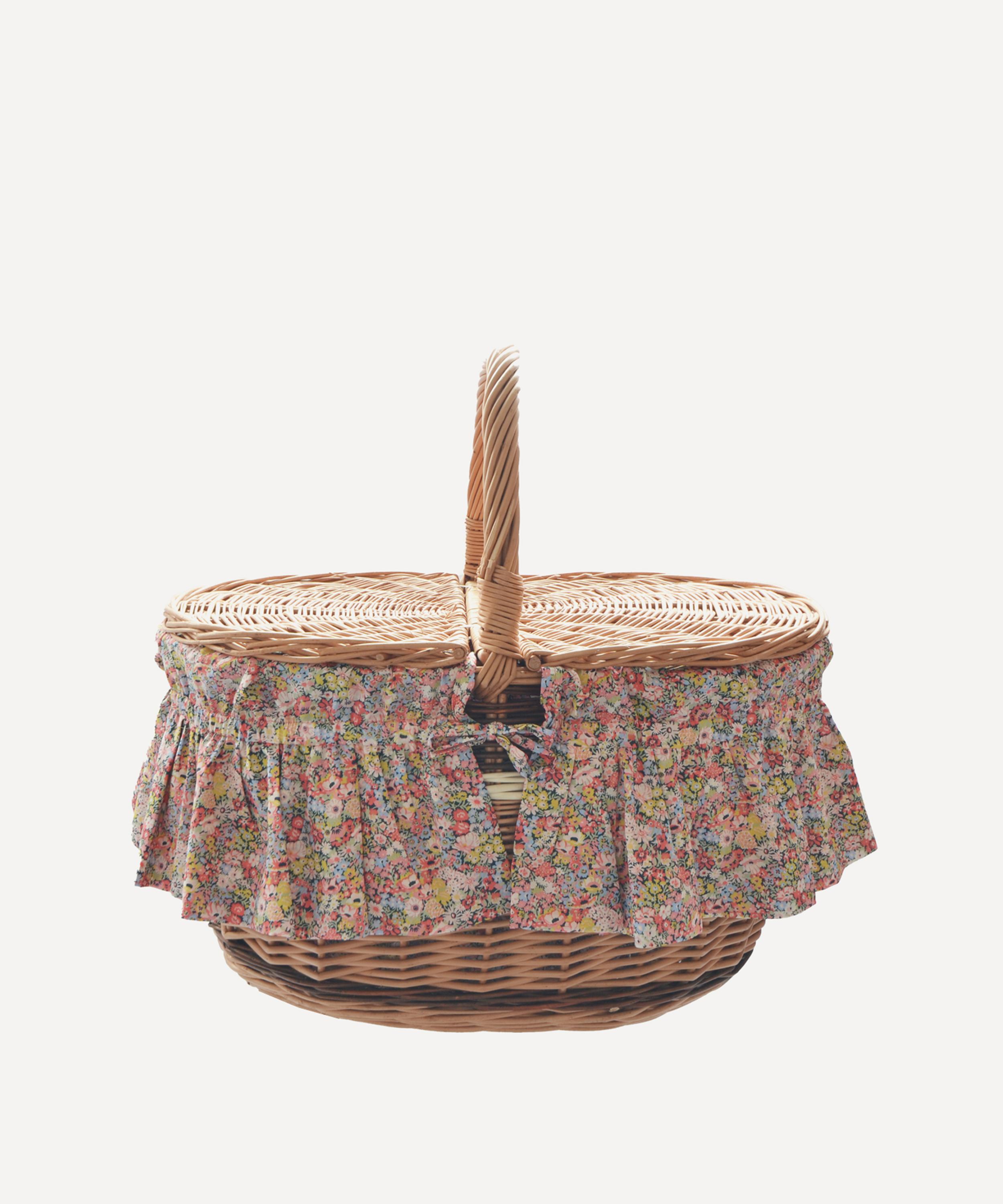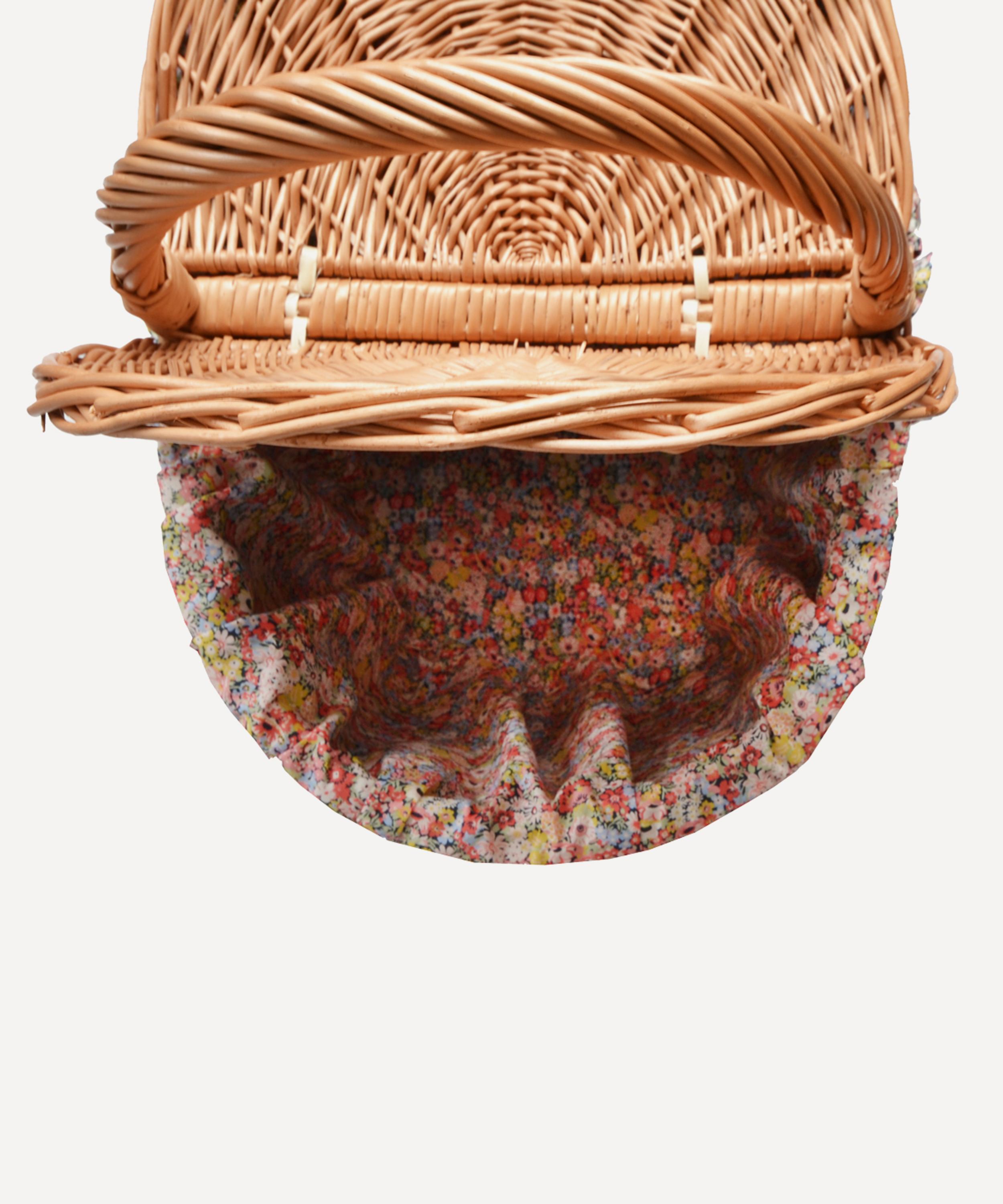 The perfect accompaniment to al-fresco mealtimes, this luxury picnic basket is filled with everything you need for an effortless outdoor get together, including reversible Liberty print napkins, premium mix and match pastel handled cutlery, enamel plates and tumblers. Handmade using natural, environmentally friendly wicker with a removable scalloped edge lining made from our inimitable Tana Lawn™ cotton in Liberty Fabrics’ Thorpe Hill print - a small-scale version of the much-loved Liberty classic Thorpe. The rectangle shaped basket is complete with a double opening lid and a practical carry handle for easy transportation.