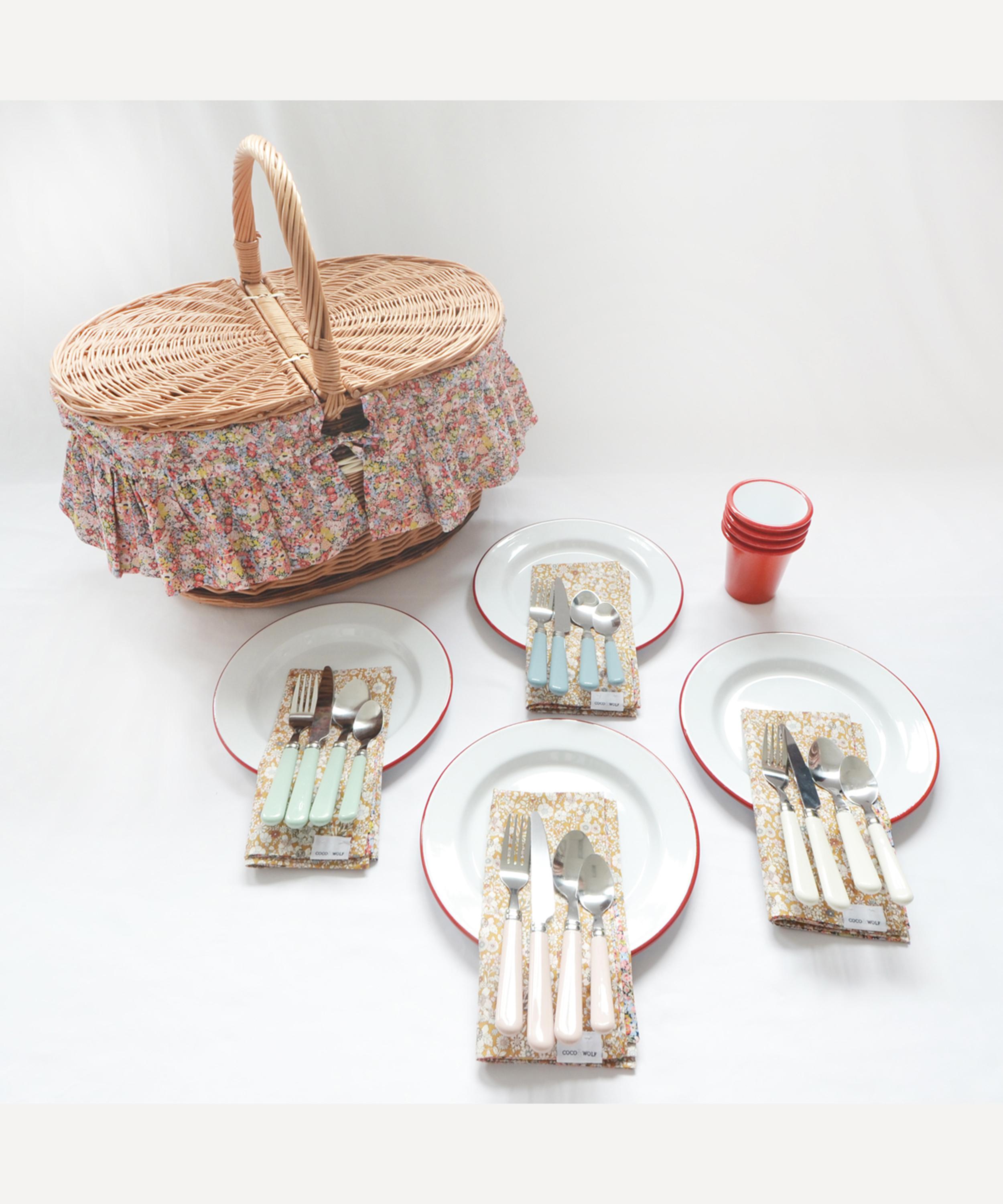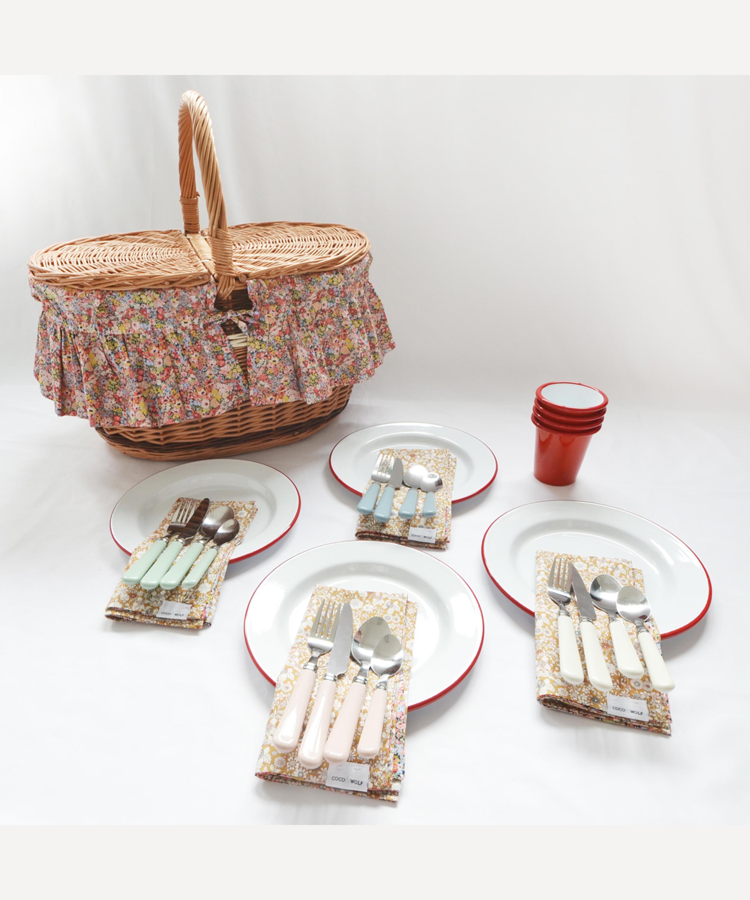 Bring a pop of Liberty print charm to the great outdoors with the Thorpe Hill four-person wicker picnic basket, created by Coco & Wolf in collaboration with Falcon Enamelware.