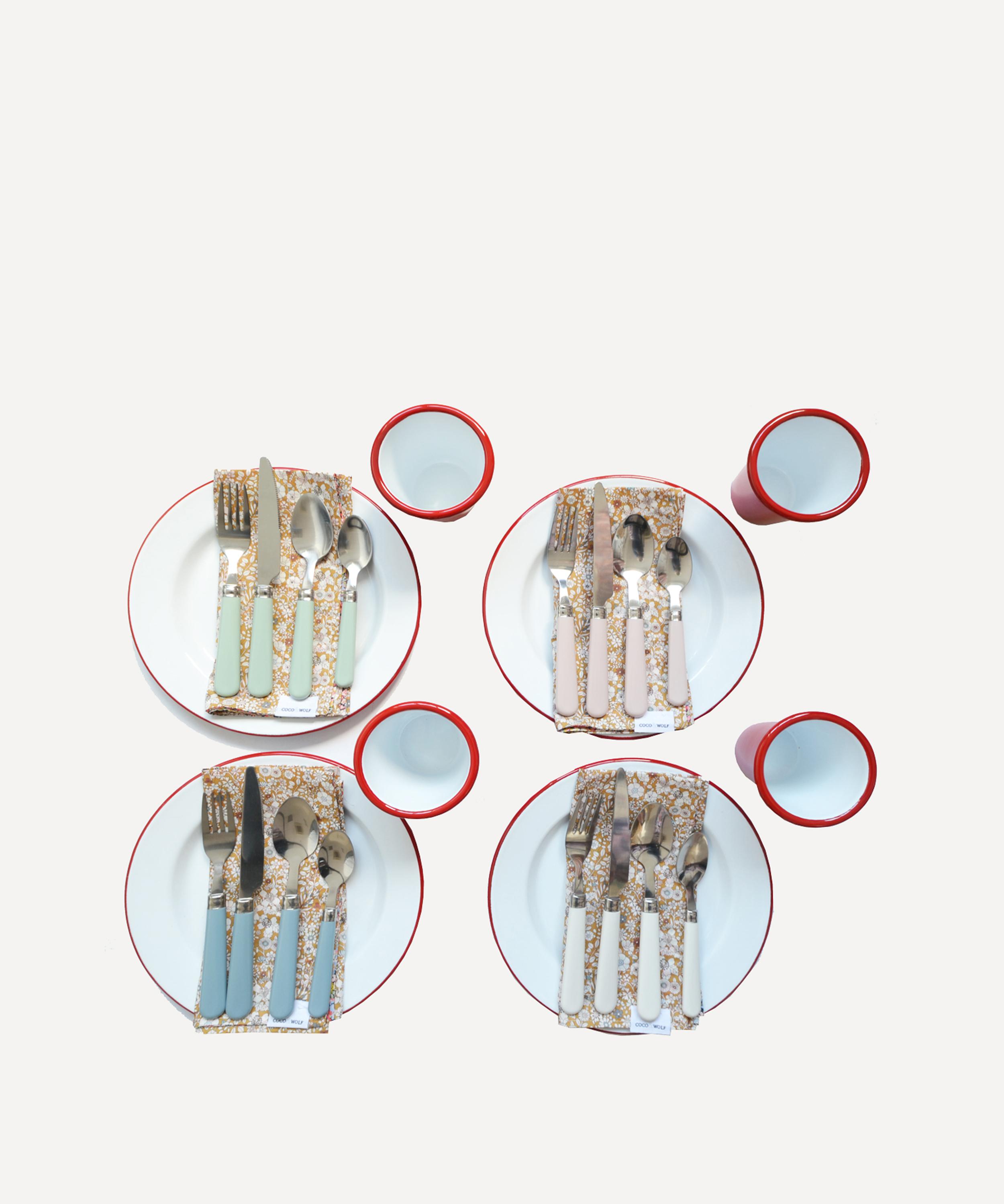 - Set includes: 4 reversible napkins, 1 cutlery bag, 16-piece cutlery set, 4 tumblers, 4 plates