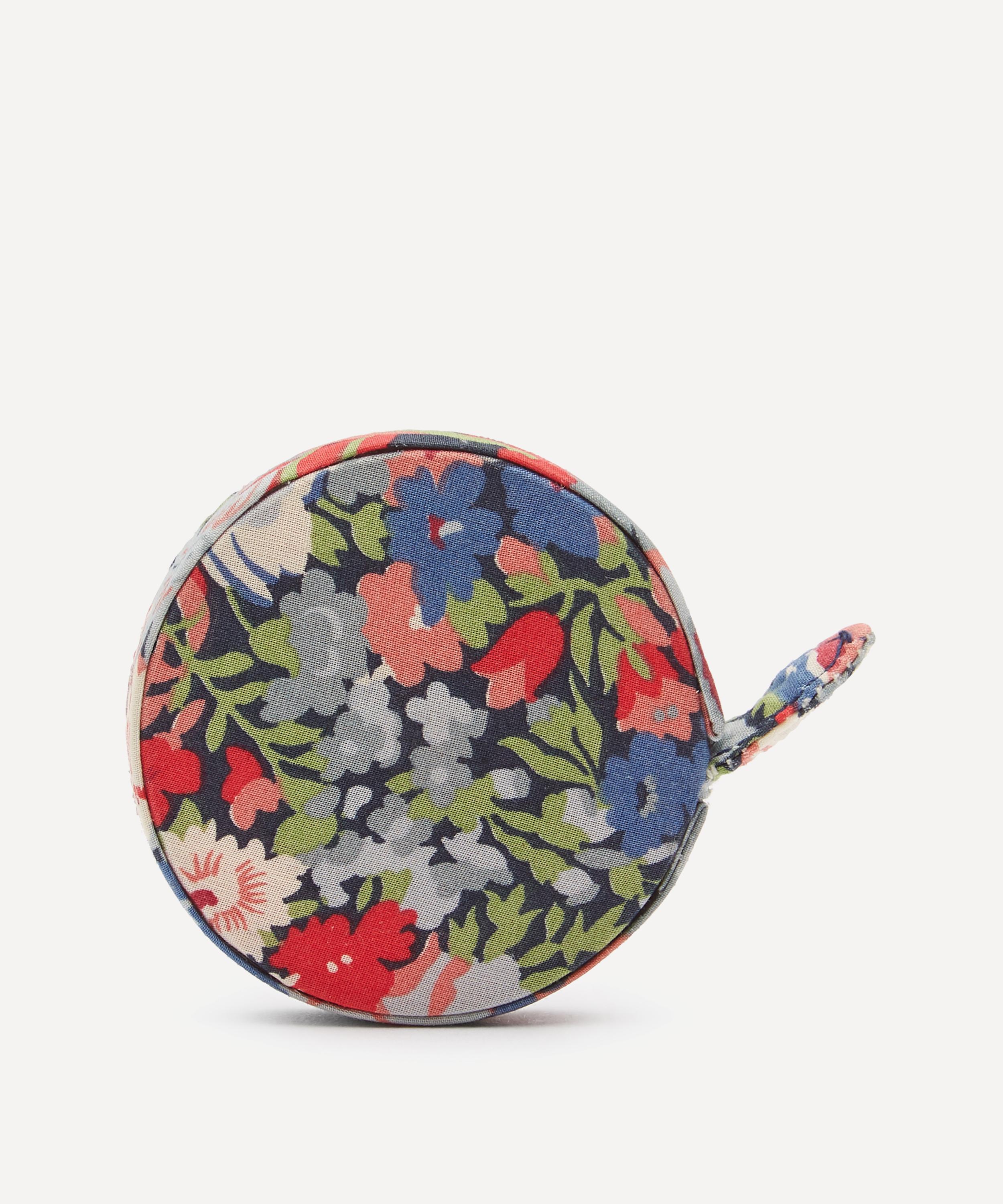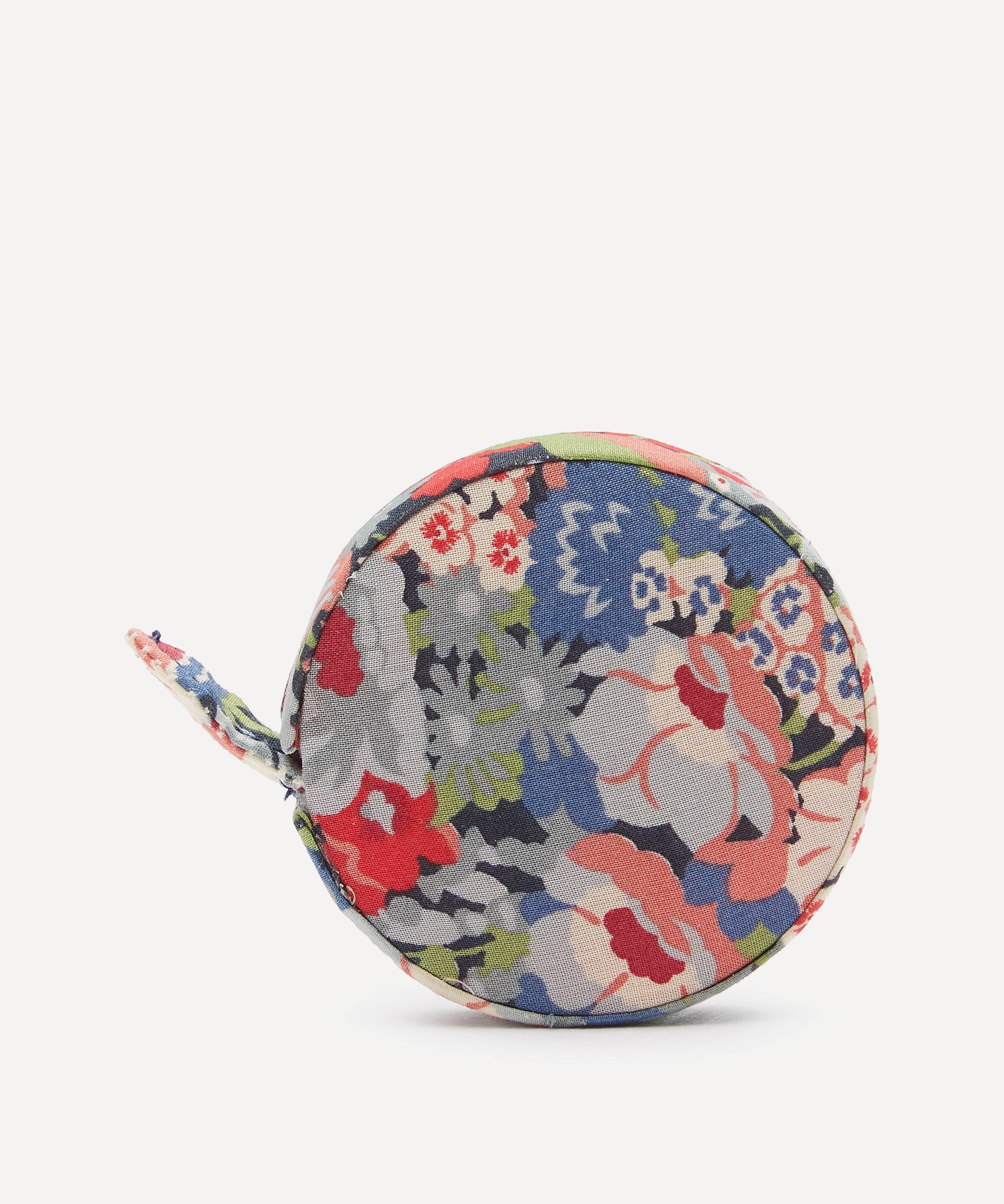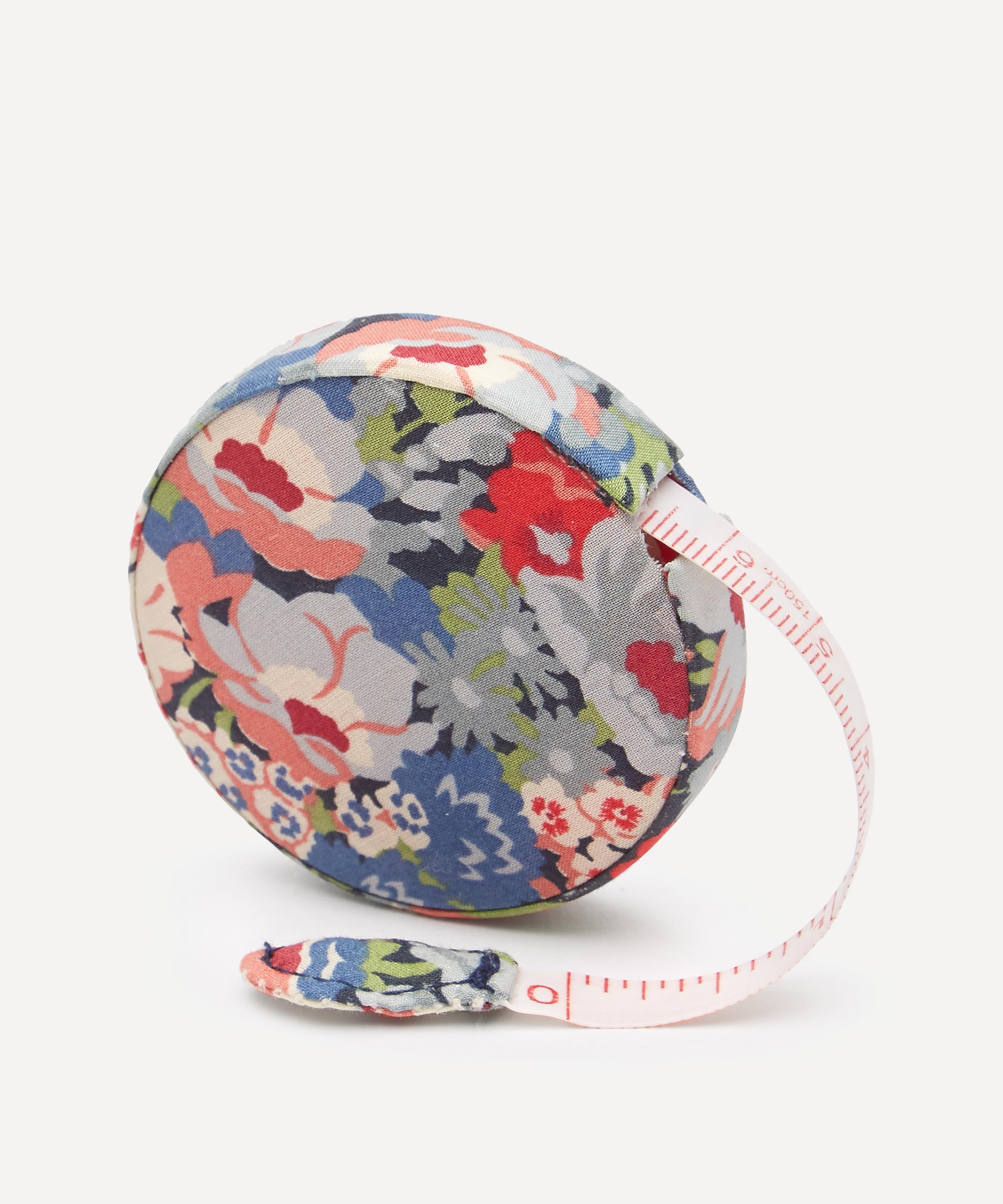 This measuring tape comes in a circular fabric case featuring a classic Liberty print.