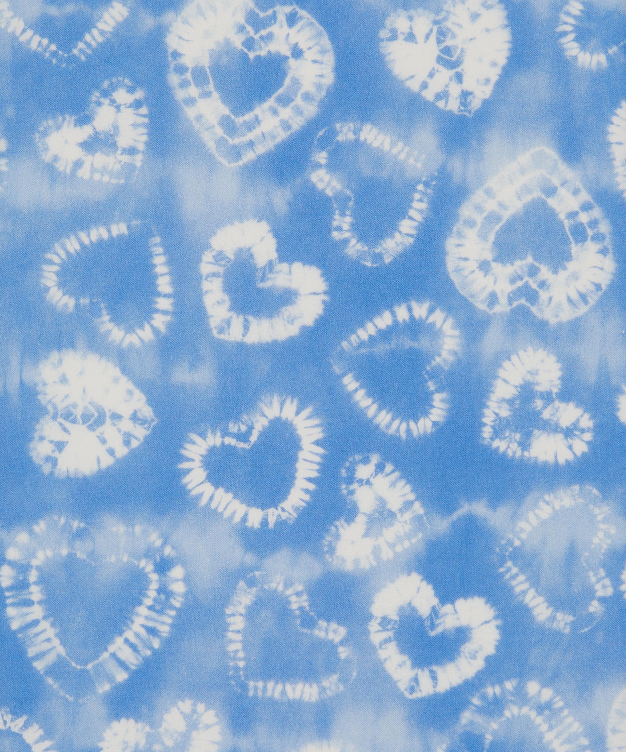Created by hand-folding and tying fabrics into a variety of heart shapes before immersing in dye, this fun conversational print is characterised by an array of scattered hearts.