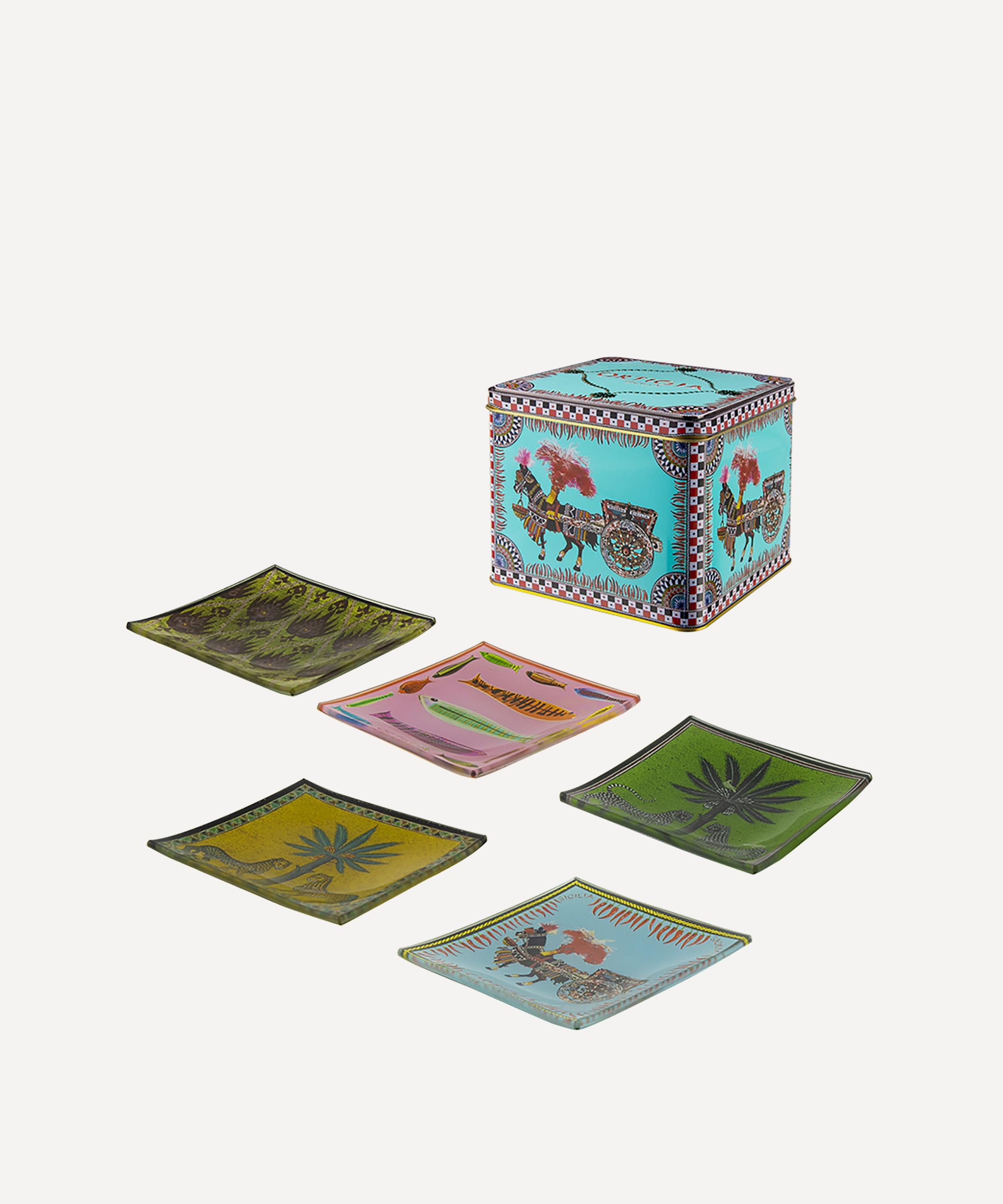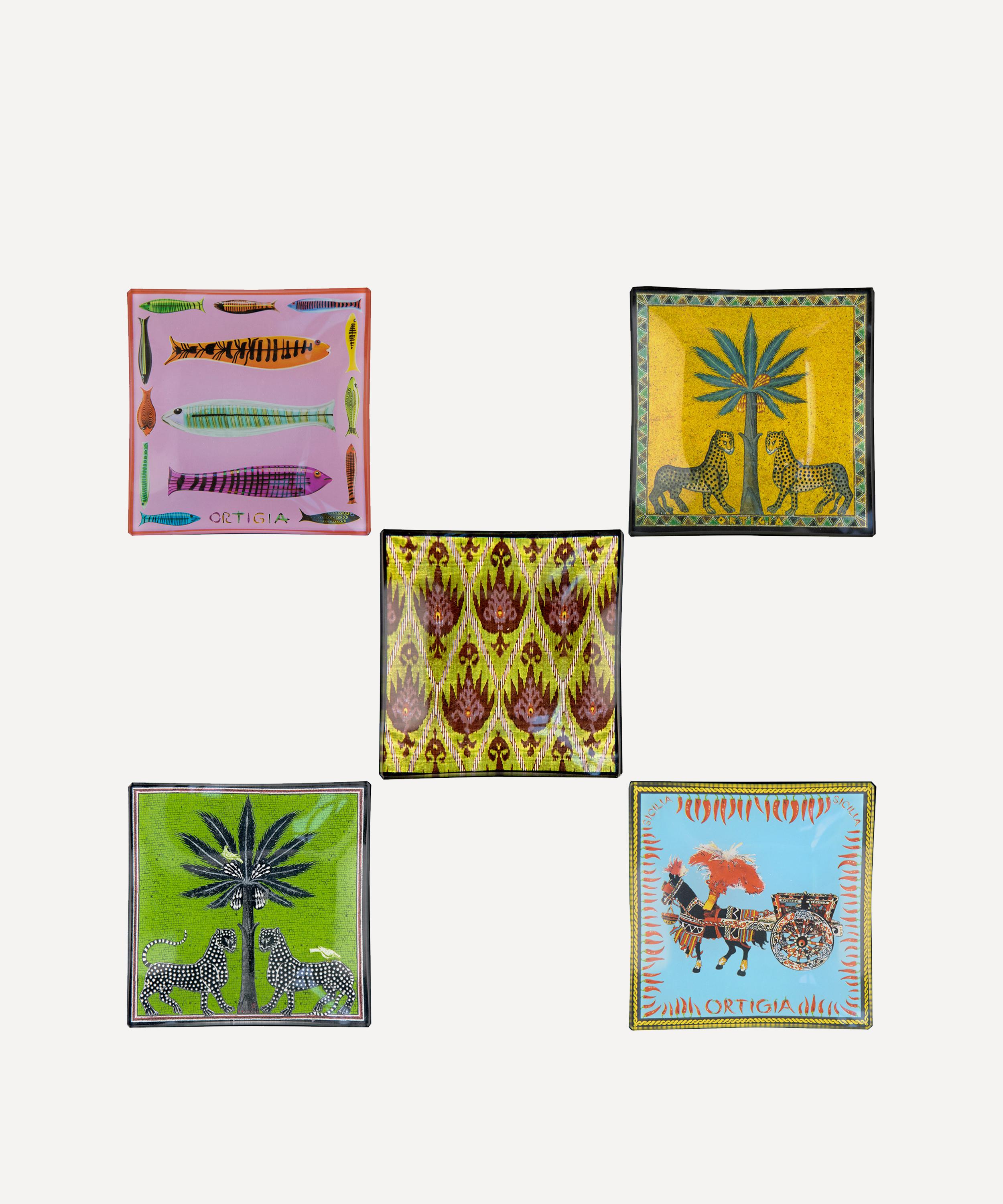 Housed in an intricately decorated tin, the plates are expertly crafted from glass in a mix of bright and bold colours and patterned with illustrations created using serigraphy – a printing method using silkscreens and stencils to create bold, distinctive artwork. Place them on a tabletop packed with colourful, freshly cut flowers or use them to house Ortigia’s candles, scents and soaps and bring the brand’s vibrant aesthetic into the heart of your home.