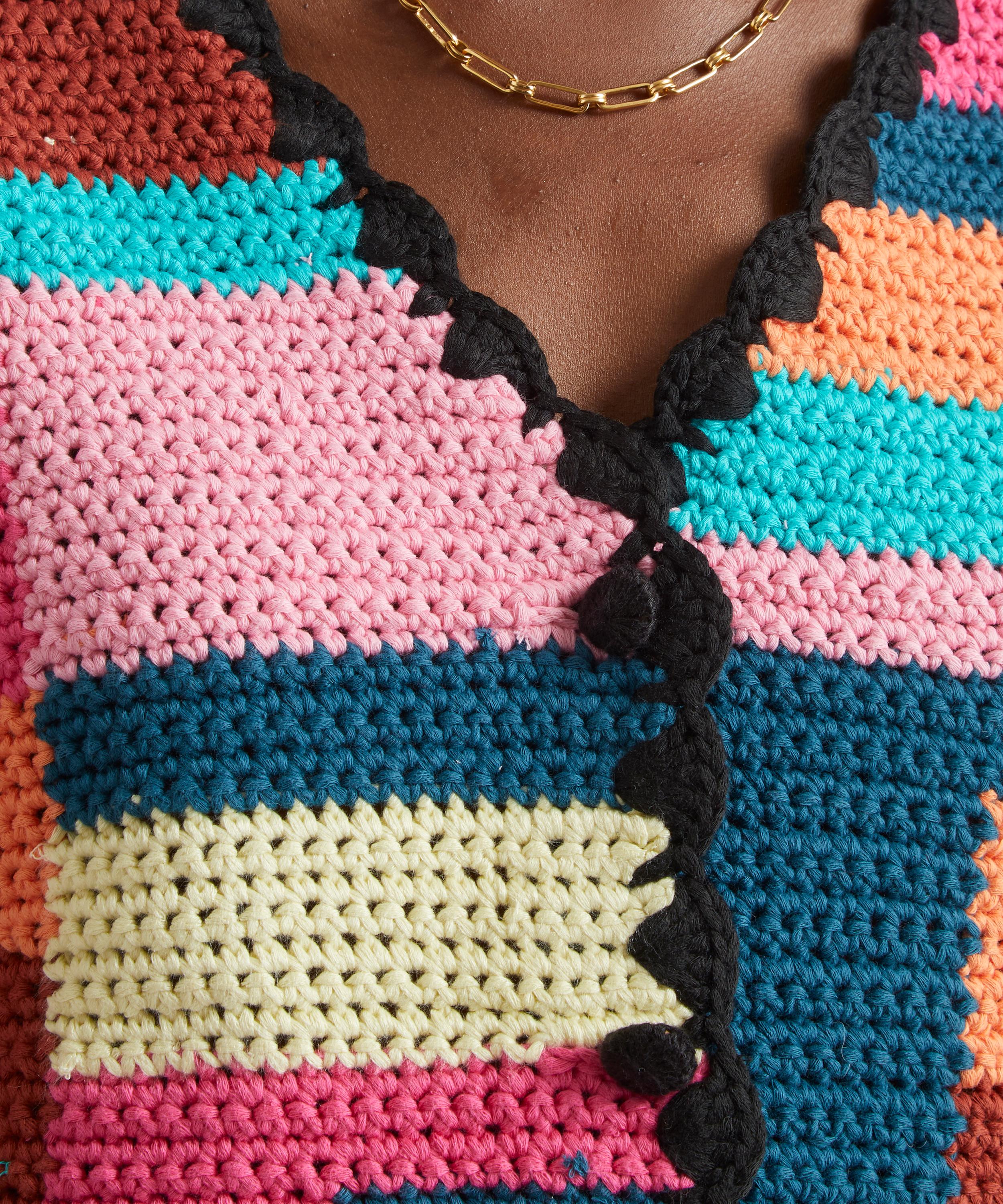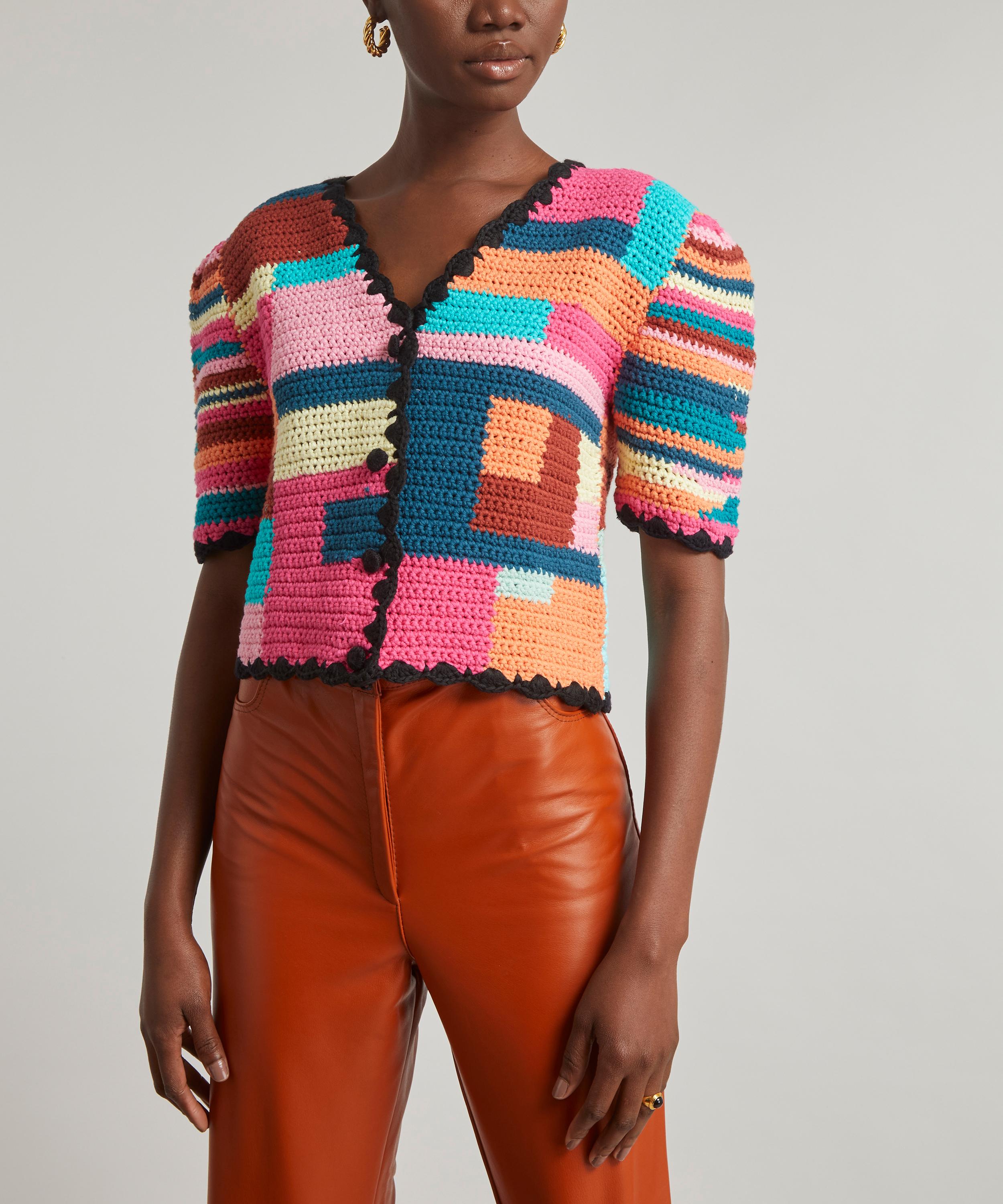 Designed and handmade in Uruguay, the Tini cardigan is crafted from cotton and expertly knitted with an eclectic hand-crocheted pattern, featuring a bold medley of multi-coloured squares and stripes. Tailored to a regular fit with padded shoulders and elegant short-sleeves, it has a flattering V-neckline complete with a contrasting black crochet trim across the edges of its buttoned placket, cuffs and hem. Brimming with a bohemian edge, team the Tini with cropped leather trousers and a pair of chunky-mules for a retro-finish.