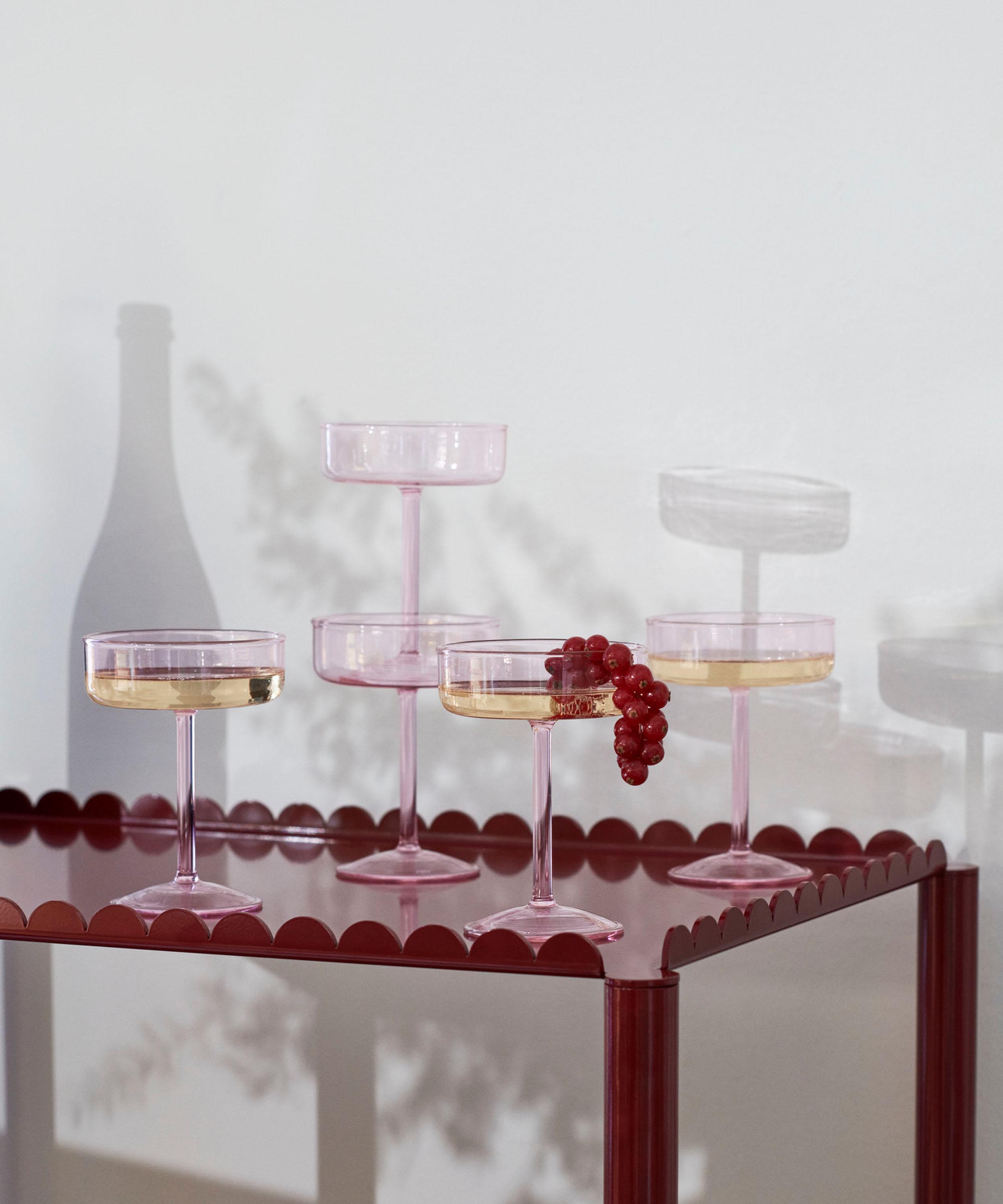 This set of coupe glasses from HAY are poised to beautify your table setting with a contemporary, angular design.