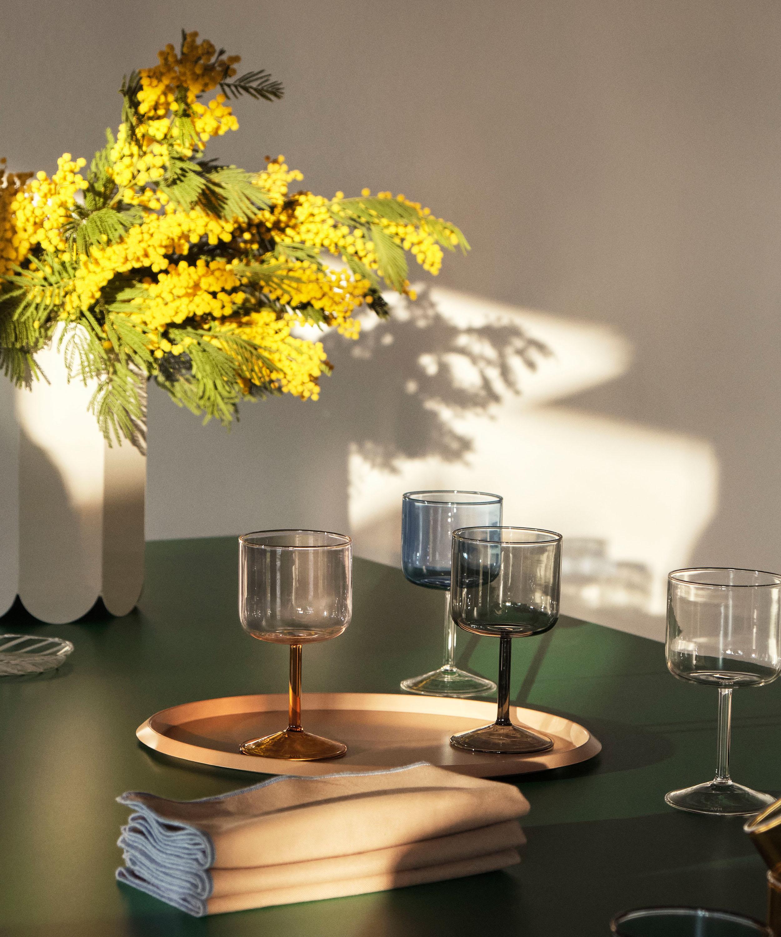 This set of wine glasses from HAY are poised to beautify your table setting with a spectrum of soft colour.