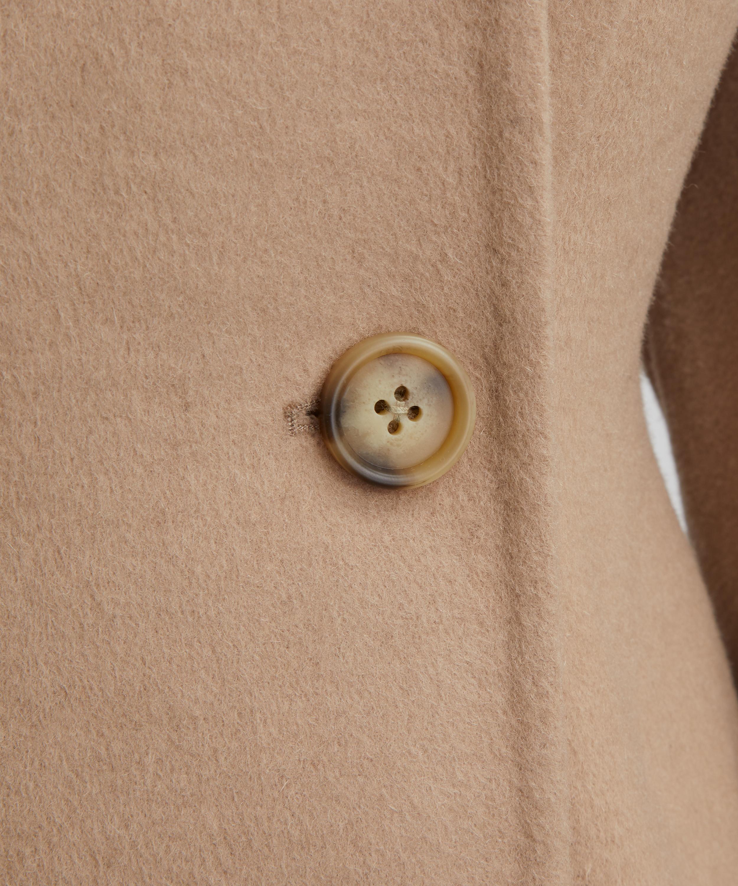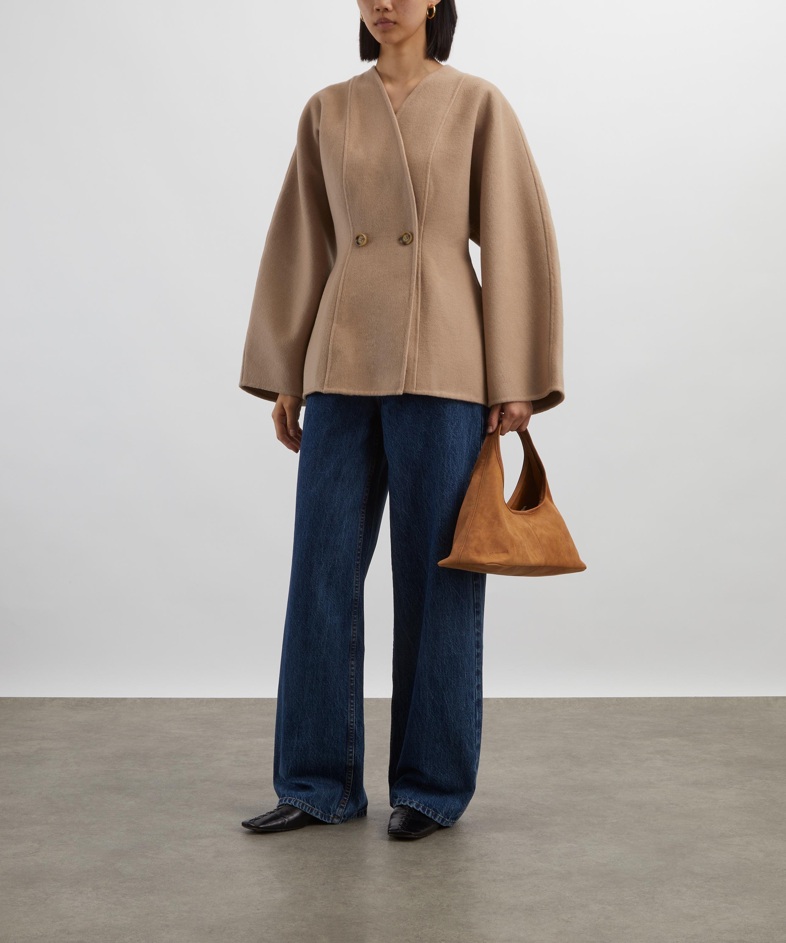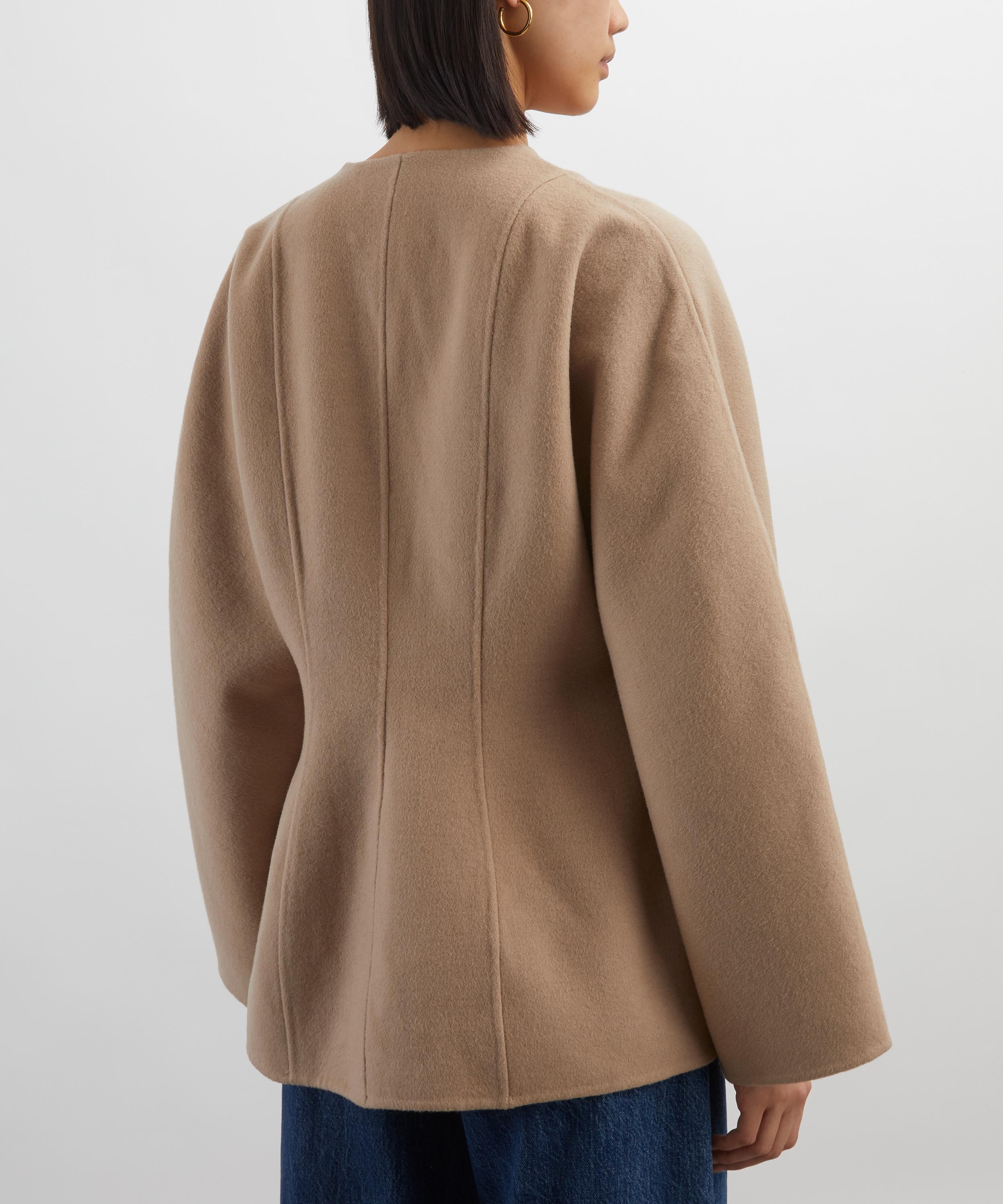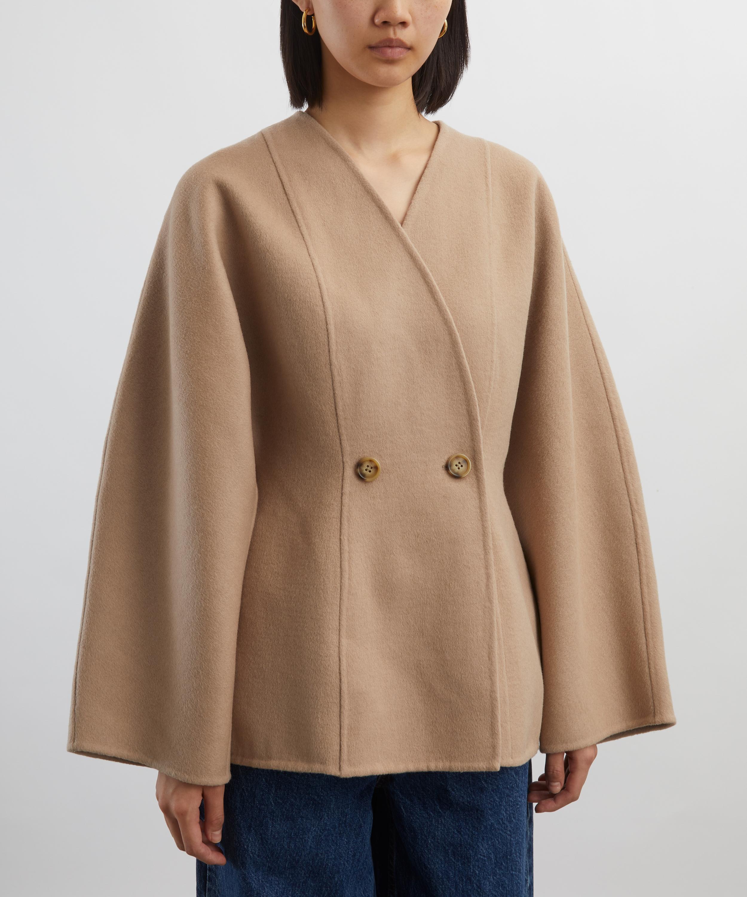 Crafted from a double-faced wool blend, this tailored jacket features a flattering fit-and-flare silhouette, subtly shaped at the waist. Designed with a sharp V-neckline, double-breasted closure, and long dolman sleeves, it’s finished with clean lengthwise seams for a polished, sculpted look.