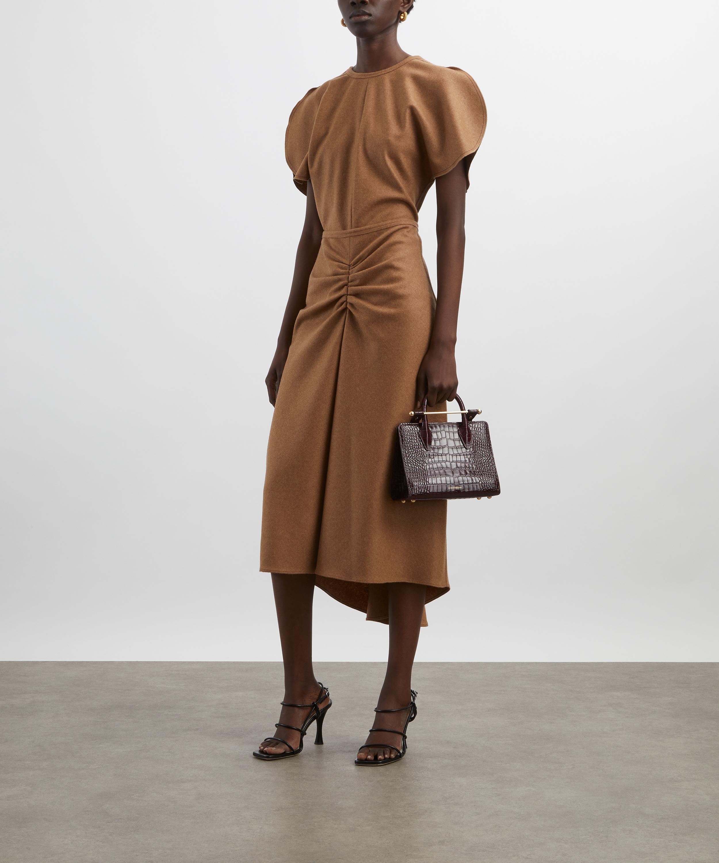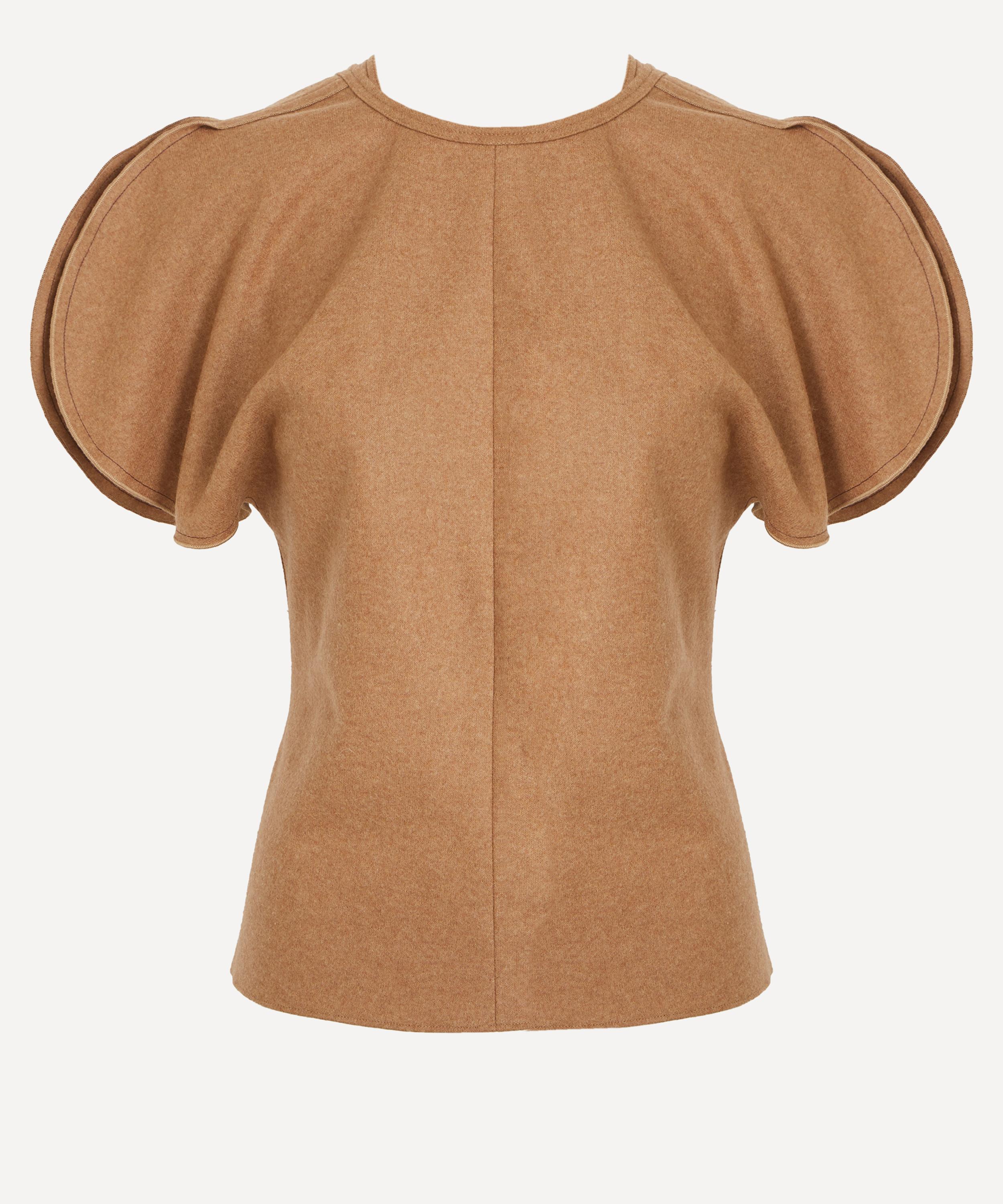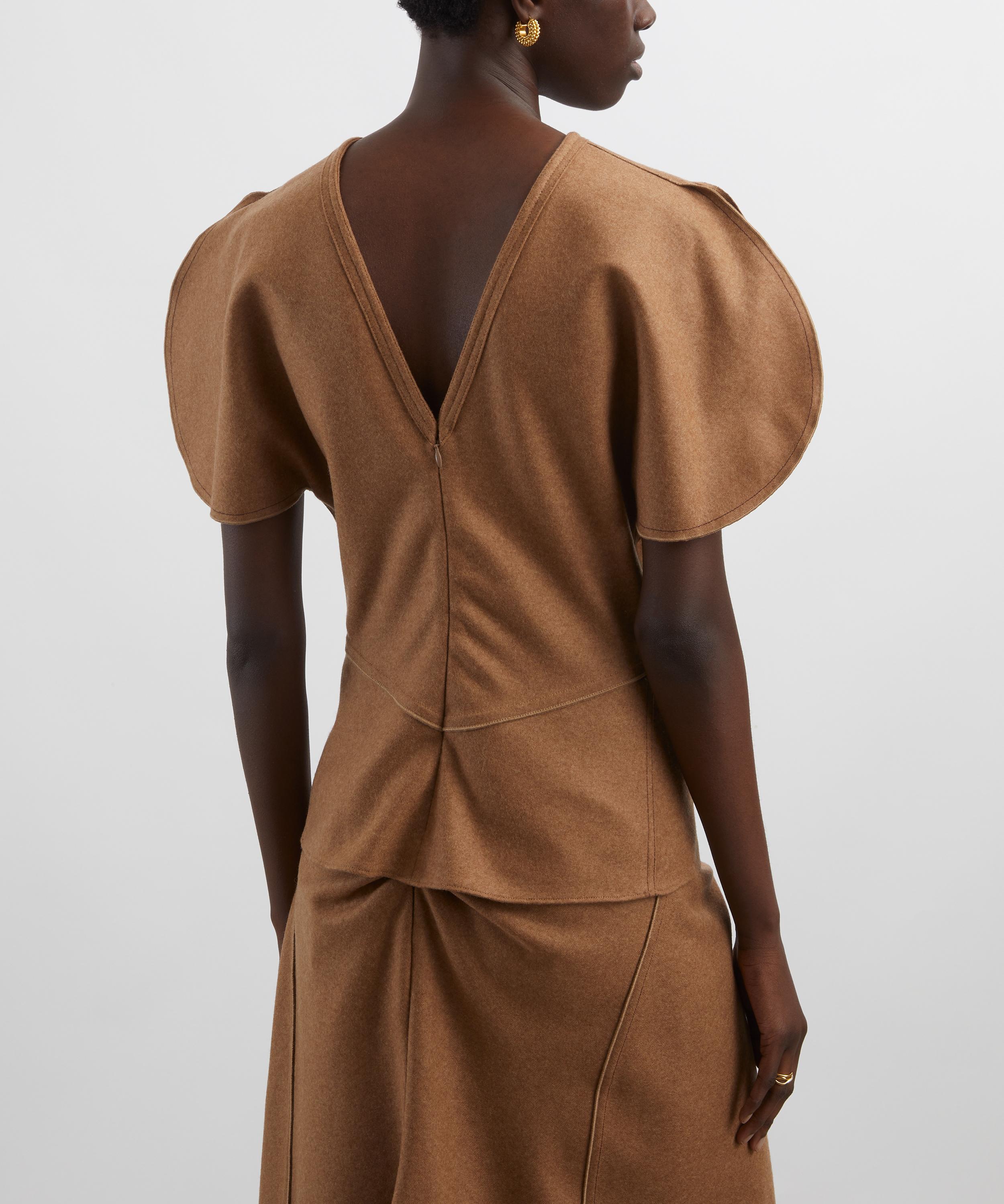 Crafted from a soft wool-cashmere blend in rich toffee, the Draped Sleeve Top combines refined elegance with modern allure. A deep V-back contrasts a modest neckline and draped sleeves, while exposed baby-overlocking highlights the house’s signature detailing.