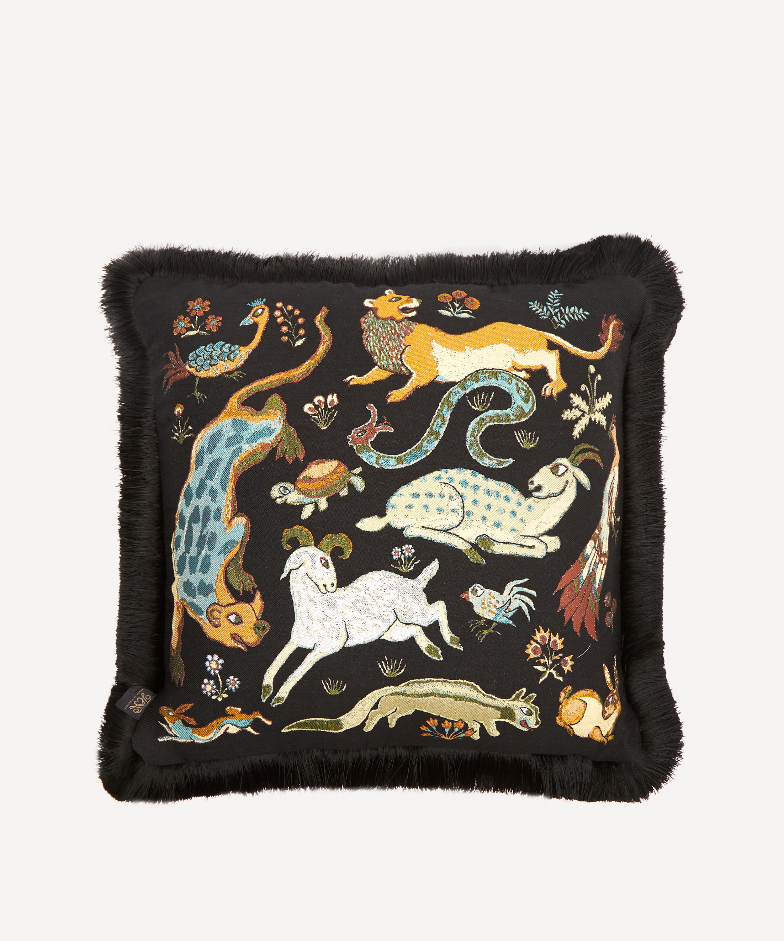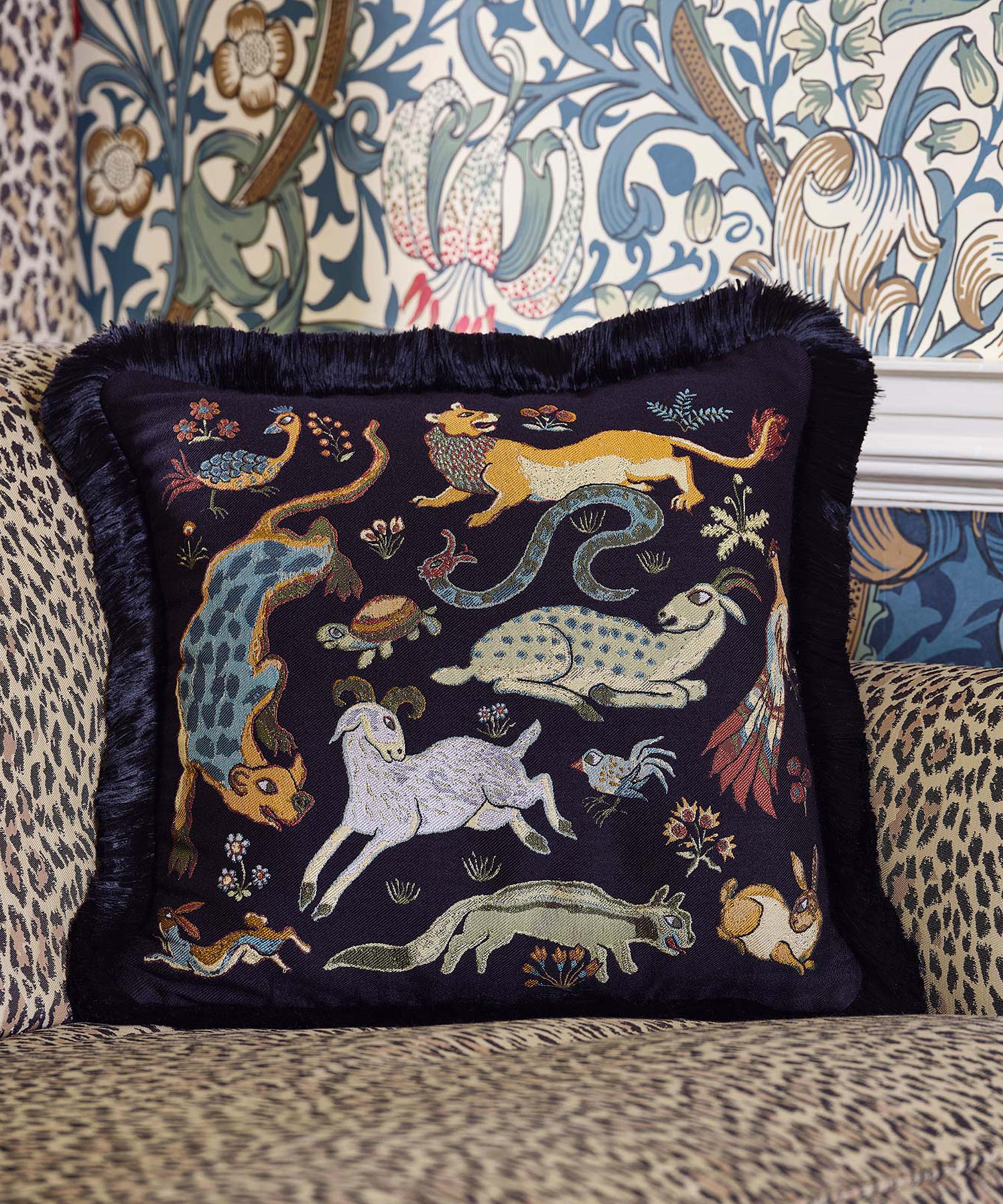 Drawing inspiration from the medieval castle of Trematon in Cornwall, this tapestry cushion is crafted from British jacquard and woven with silk threads that showcase mythical creatures leaping and prowling against a backdrop of Cornish foliage. Complete with lustrous satin fringing, it will breathe life into love-worn sofas and chairs, beautifully enhancing any room to opulent new heights.
