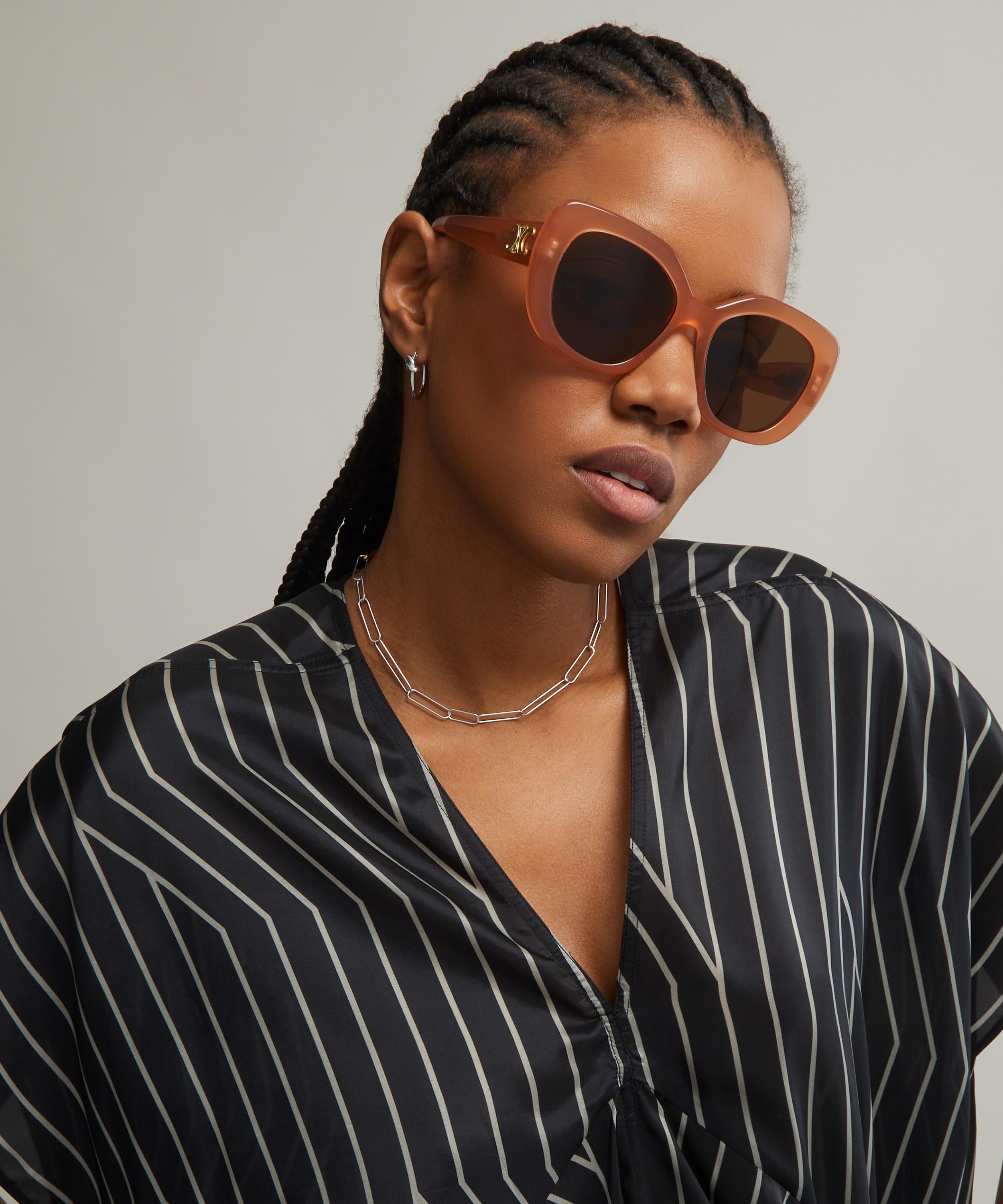 Innovatively styled and impeccably crafted, the Triomphe 06 sunglasses from Celine pay homage to the esteemed fashion house’s chic Parisian aesthetic. The chunky pink acetate frames are sleek and impactful, while the gold-tone Triomphe branding to the temples adds a signature finish.