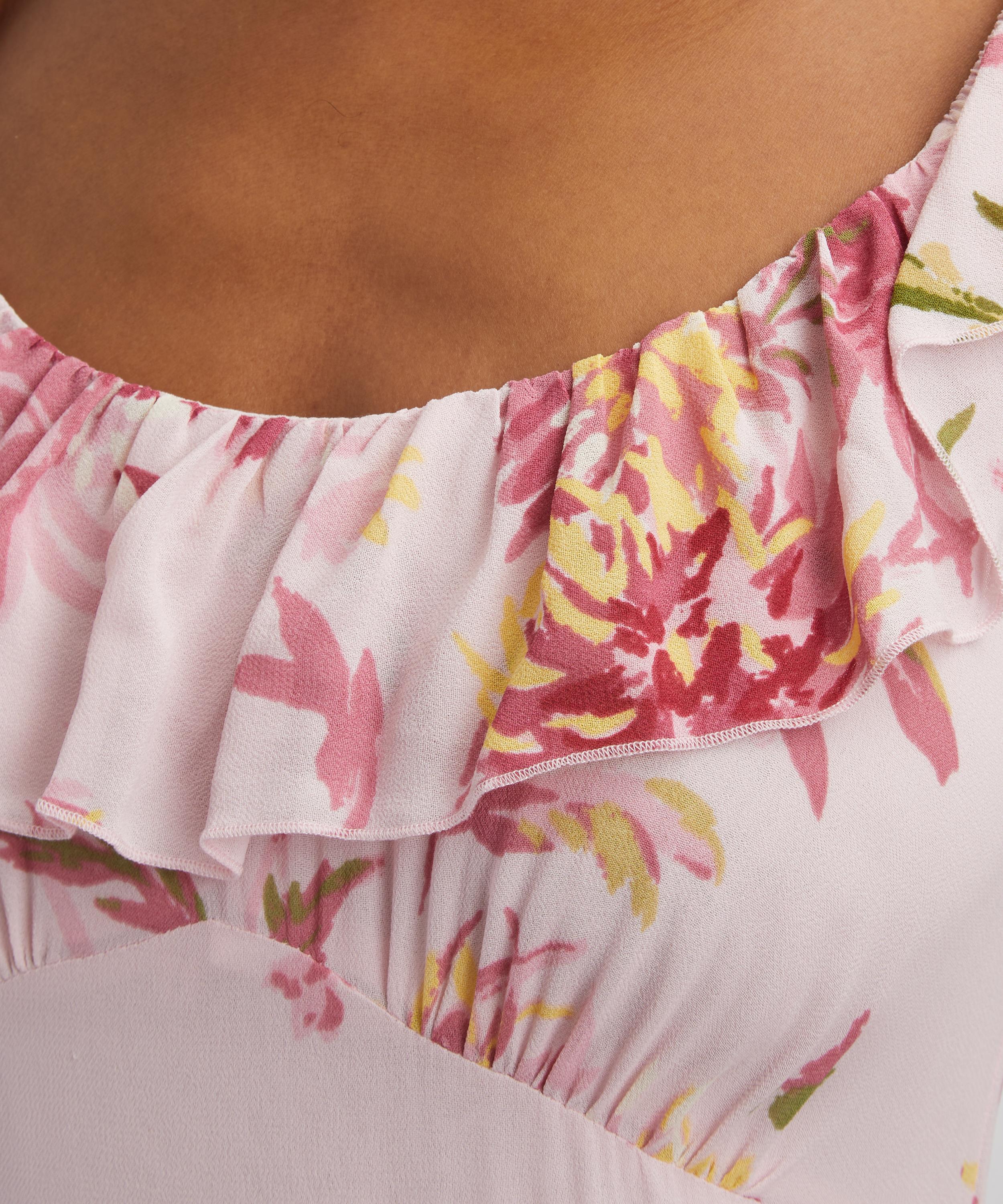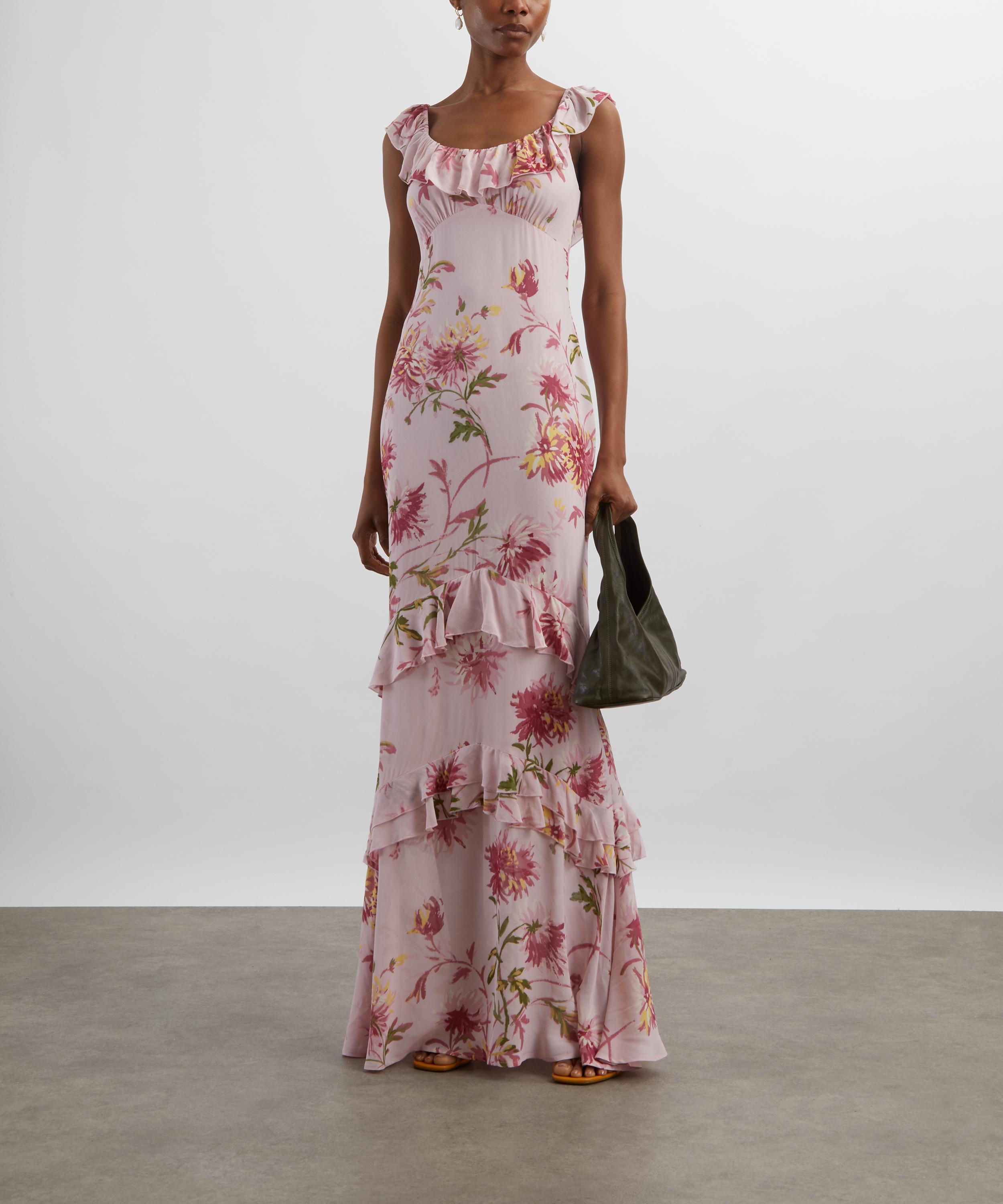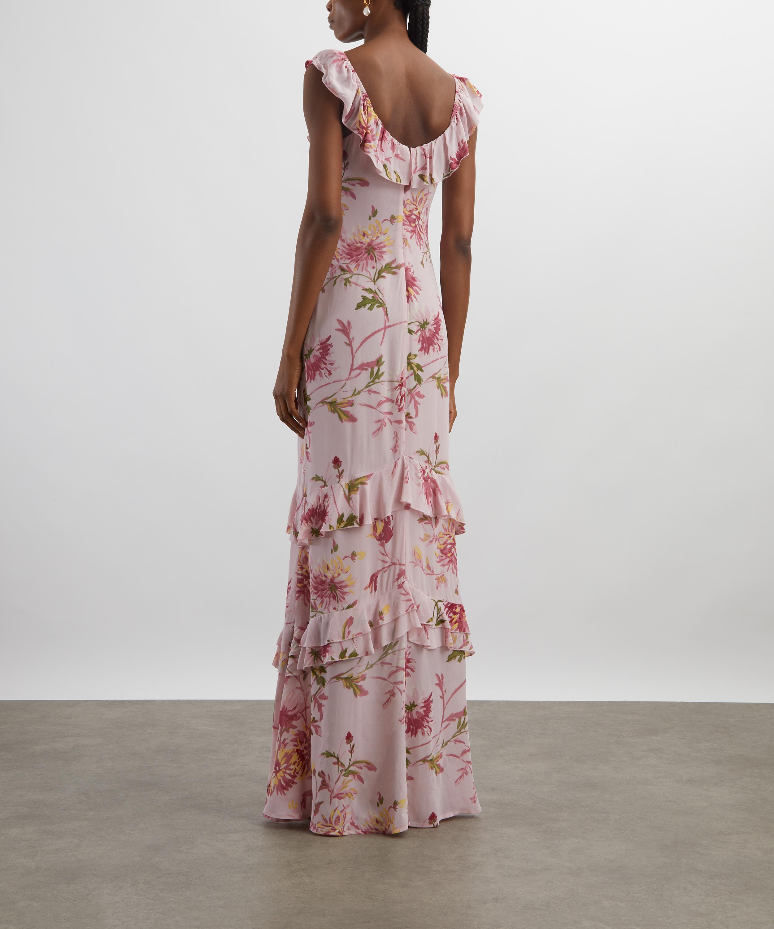Crafted from lightweight georgette fabric featuring a delicate pink Chrysanthemum print, the Tripoli Dress exudes effortless elegance. Designed with a fitted bodice, ruffled scoop neckline, and empire waist, its floor-grazing column skirt is adorned with cascading ruffles, creating a romantic, feminine silhouette.