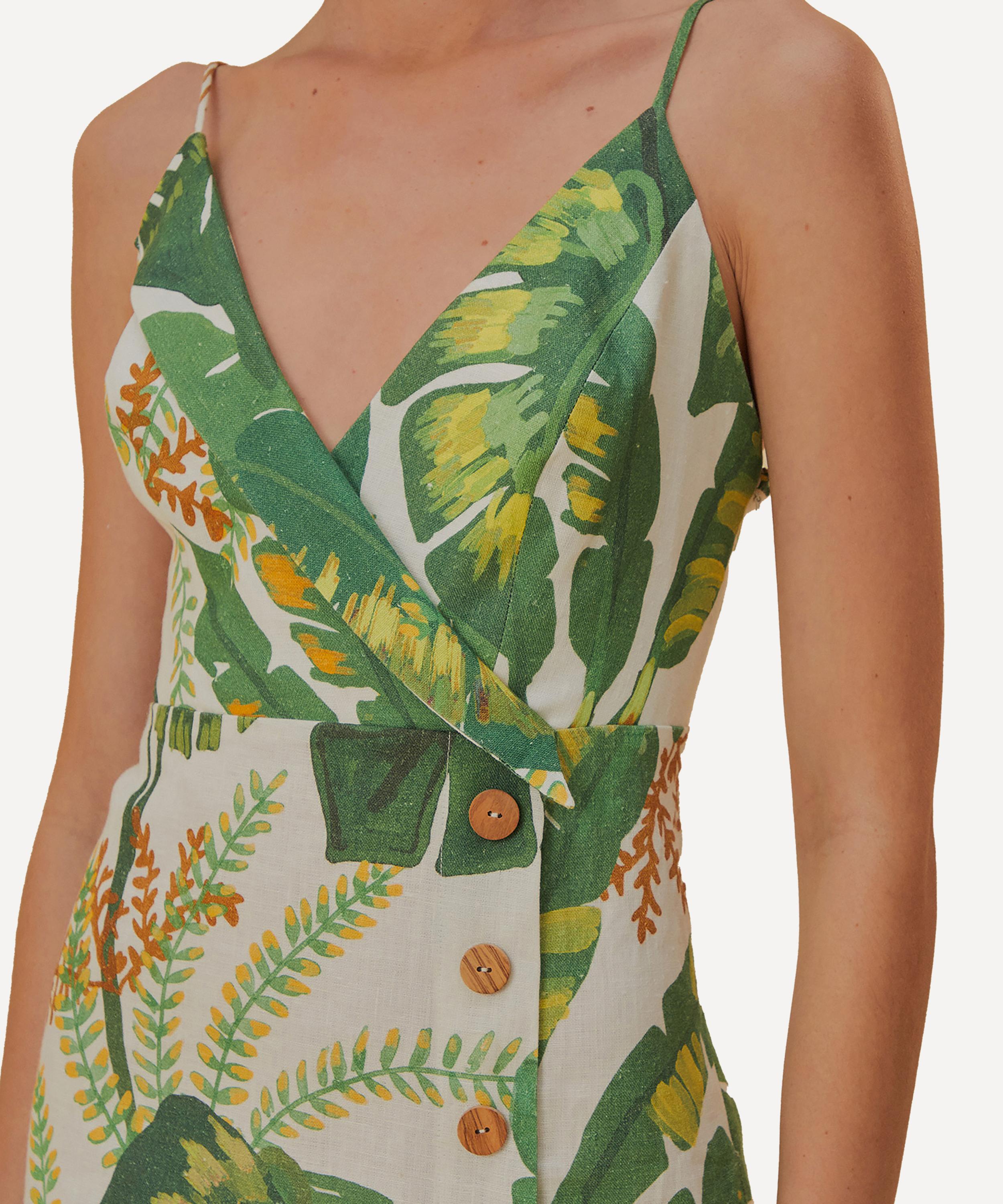 Adorned all-over in the bold and blooming Tropical Forest print, this playfully-short cotton mini-dress is the ultimate summer piece with its flattering V-neckline, and sleeveless design. Complete with a cross-over front, it’s embellished with wooden buttons to the side.