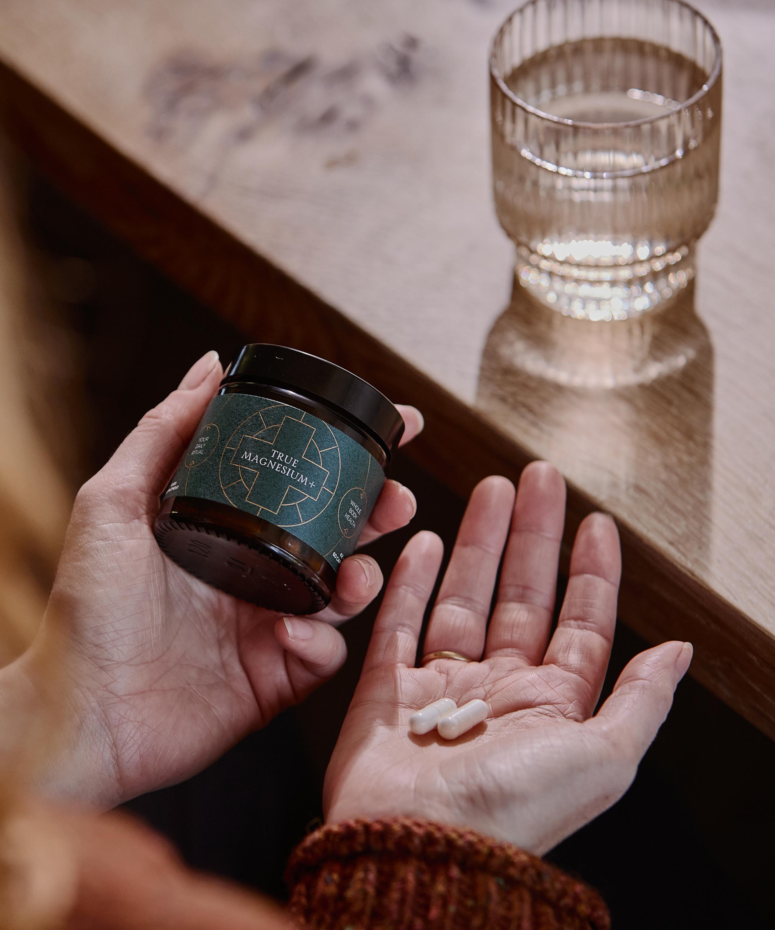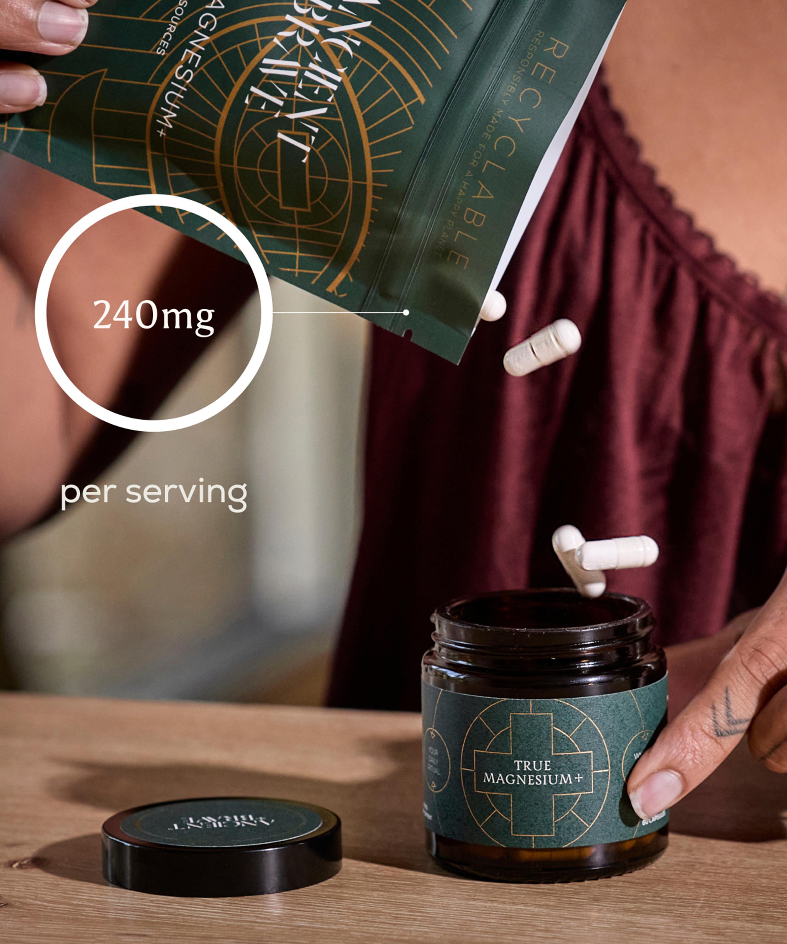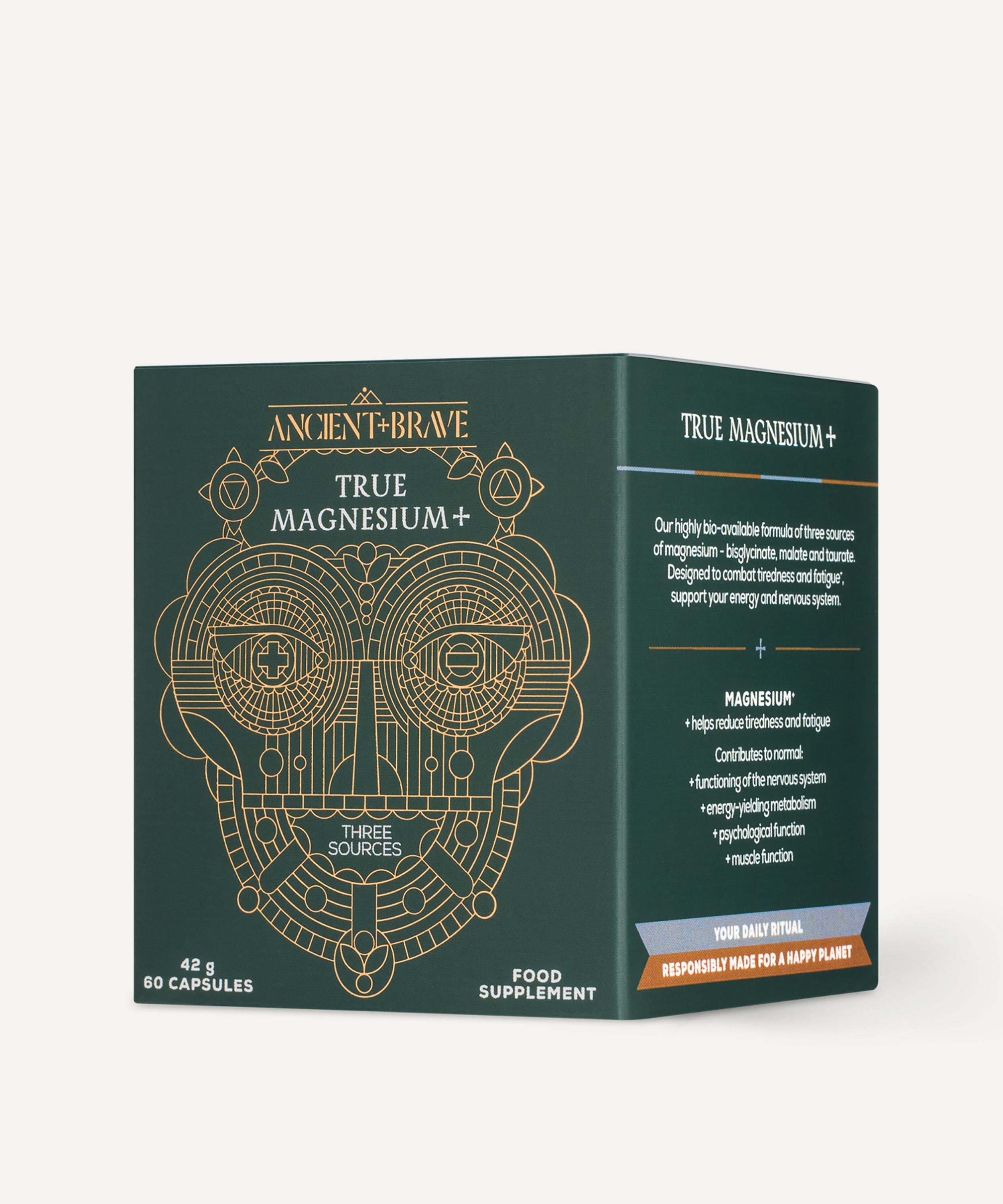 Take a break from topical skincare and elevate your sleep rituals with Ancient + Brave’s True Magnesium+ Soft Gels, containing a powder supplement designed to restore the body from within.
