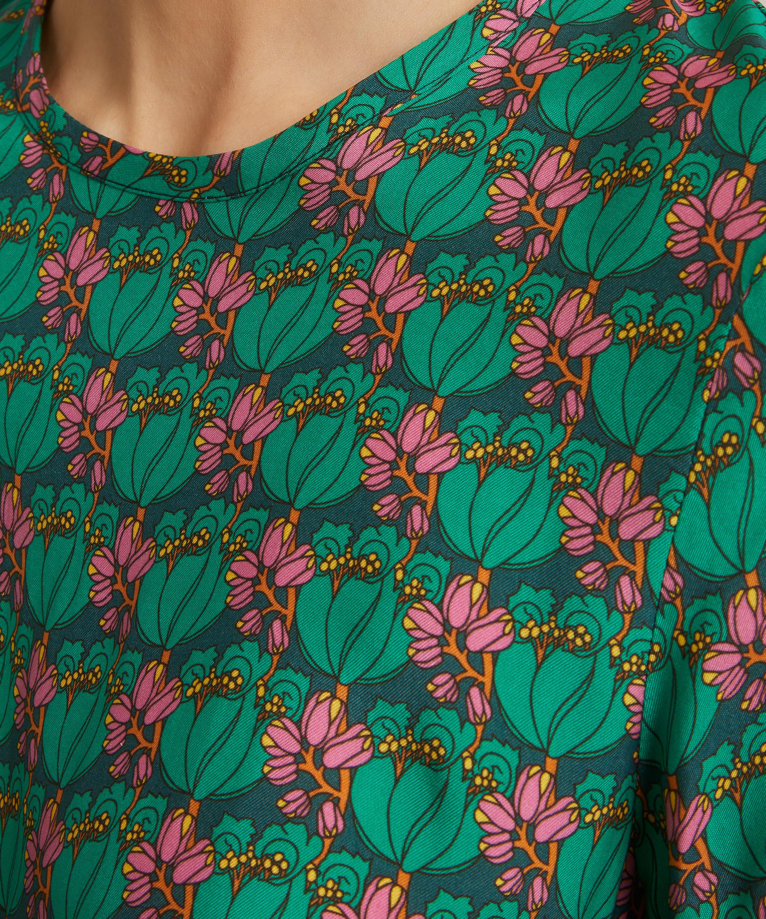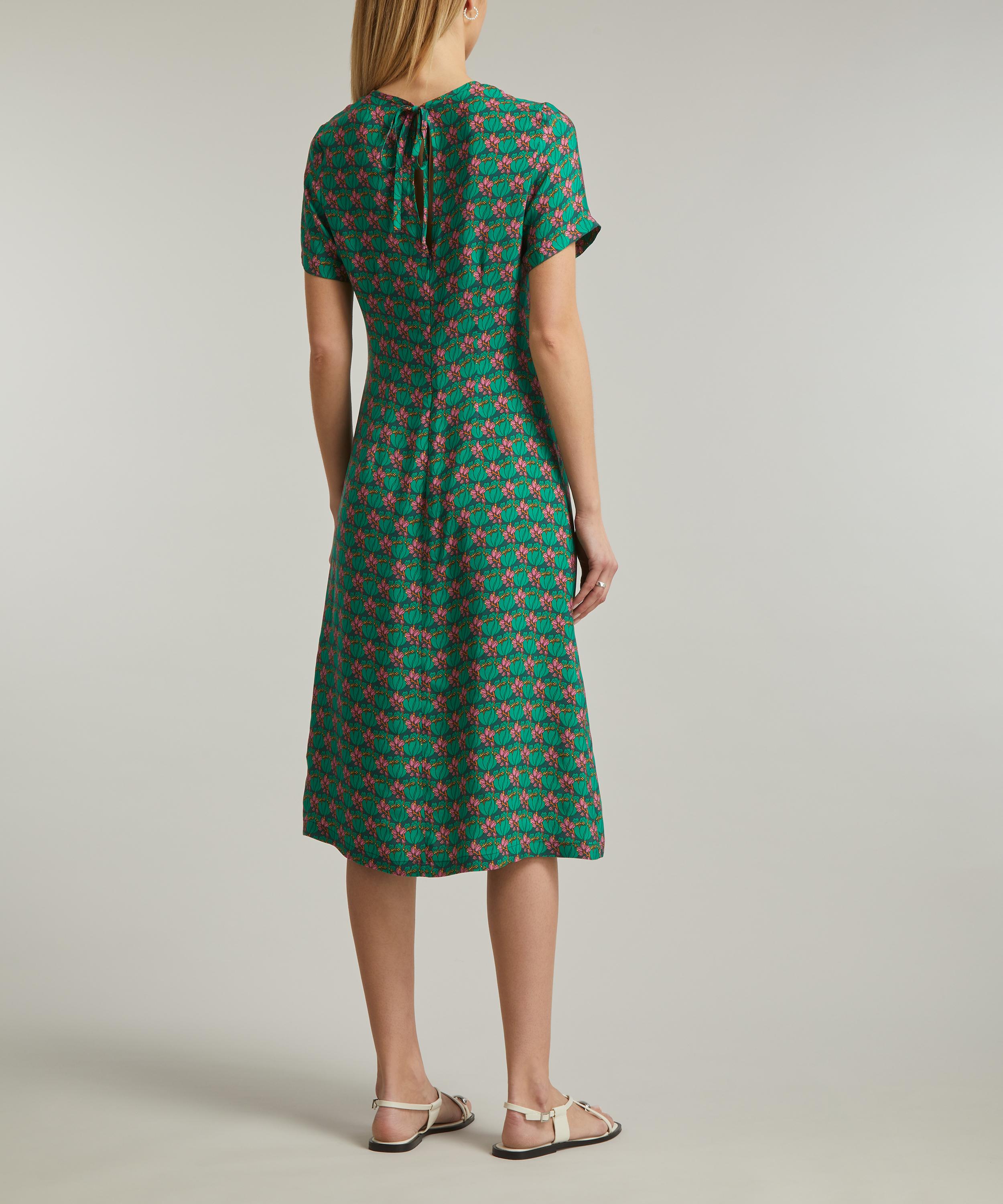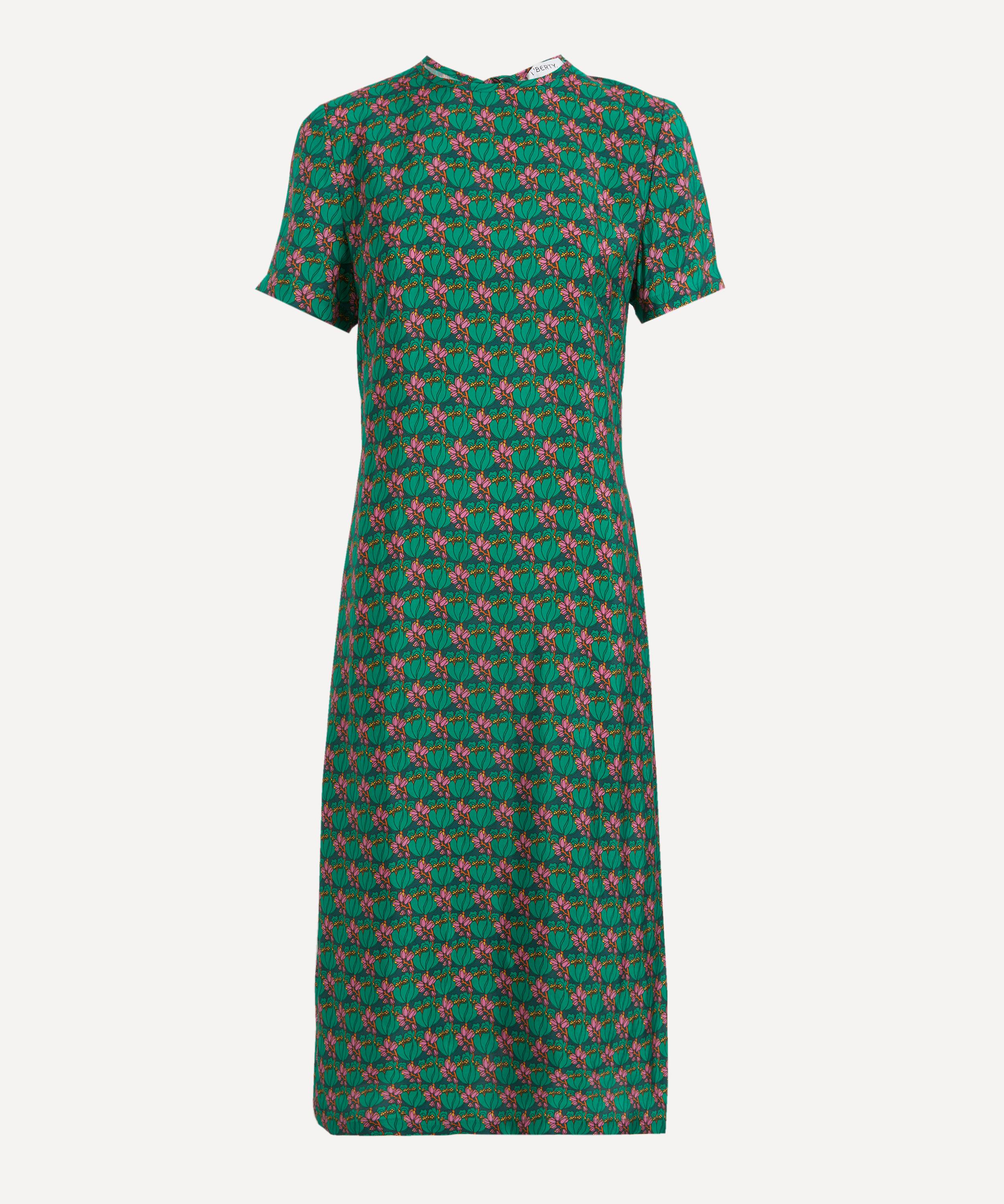 Effortlessly stylish and easy-to-wear, the Tee Dress is designed to fit and flatter the feminine form with its sleek and elegant column silhouette. Complete with cap sleeves and a round neckline, its key-hole opening at the back is secured with a chic bow closure. Crafted from silky-soft Epsom Peach Cupro, it showcases our Tudor Tulip print: Designed at the height of the Art Nouveau revival, this densely structured botanical showcases the organic forms popular in the period, reworked in a new graphic layout.