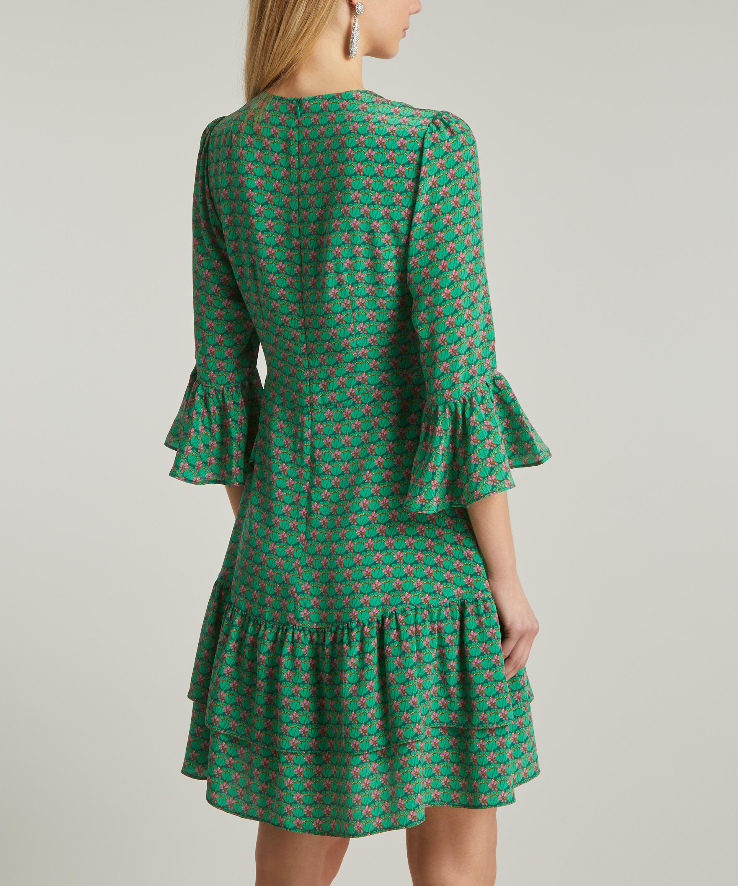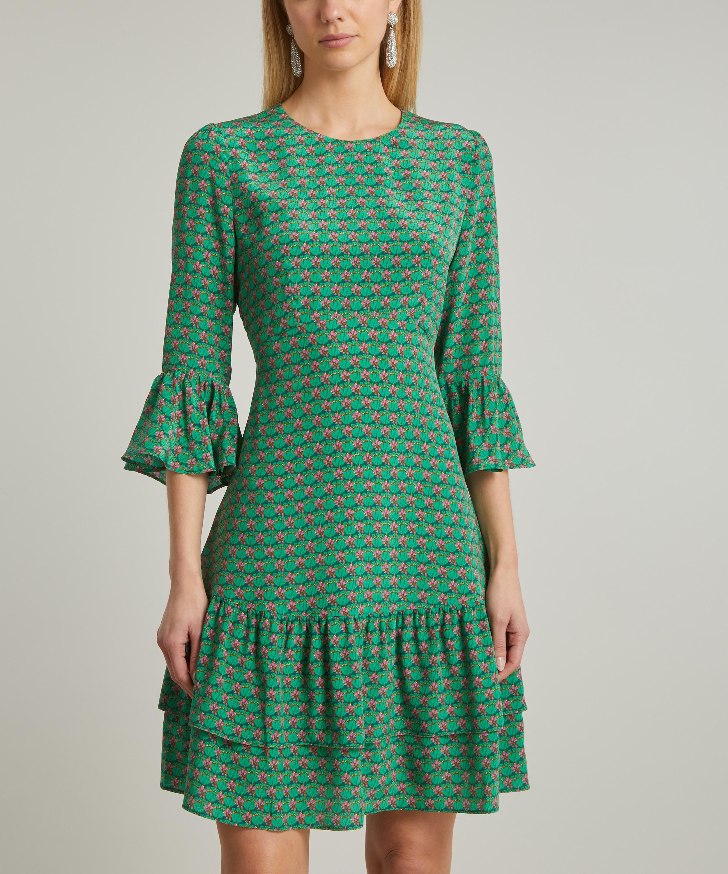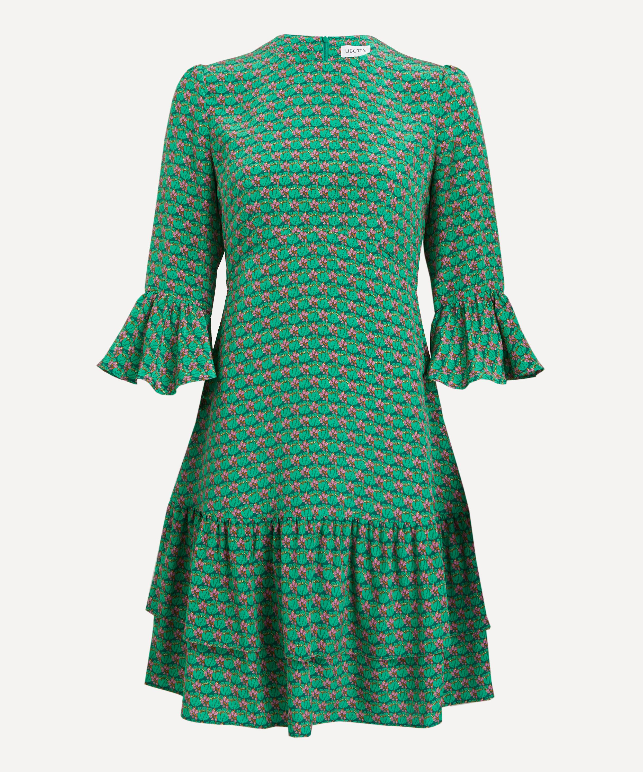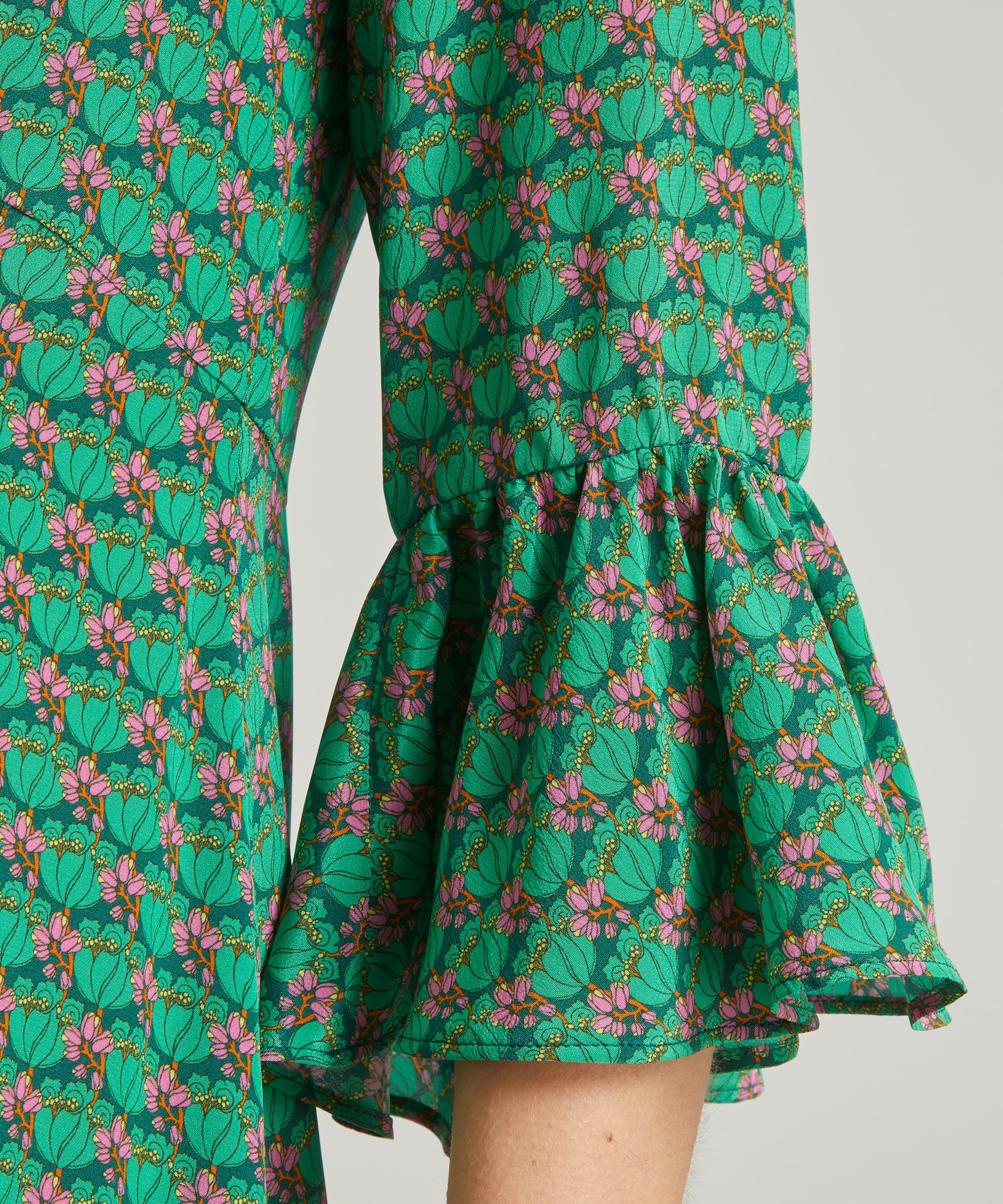 Crafted from lustrous Kensington Silk Crepe de Chine, our new Aperitif dress is designed to fit and flatter the feminine figure with its elegant V-neckline, fluted sleeves and frilled hem. Secured with a belted waist that wraps around the body to enhance the silhouette, it showcases our delightfully charming Tudor Tulip print: Designed at the height of the Art Nouveau revival, this densely structured botanical showcases the organic forms popular in the period, reworked in a new graphic layout.