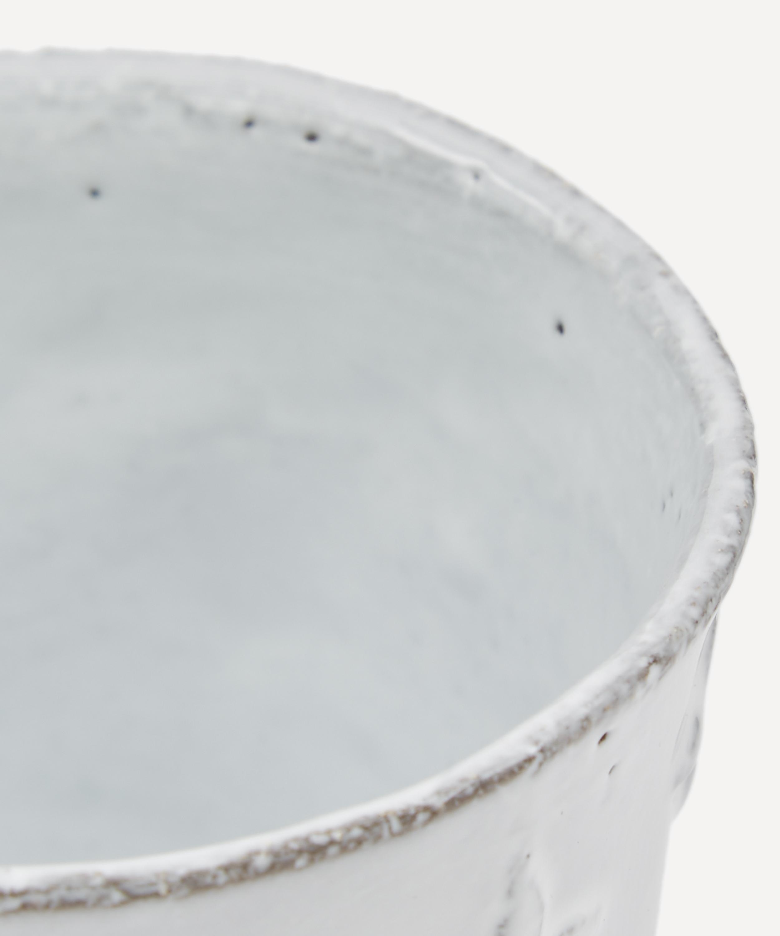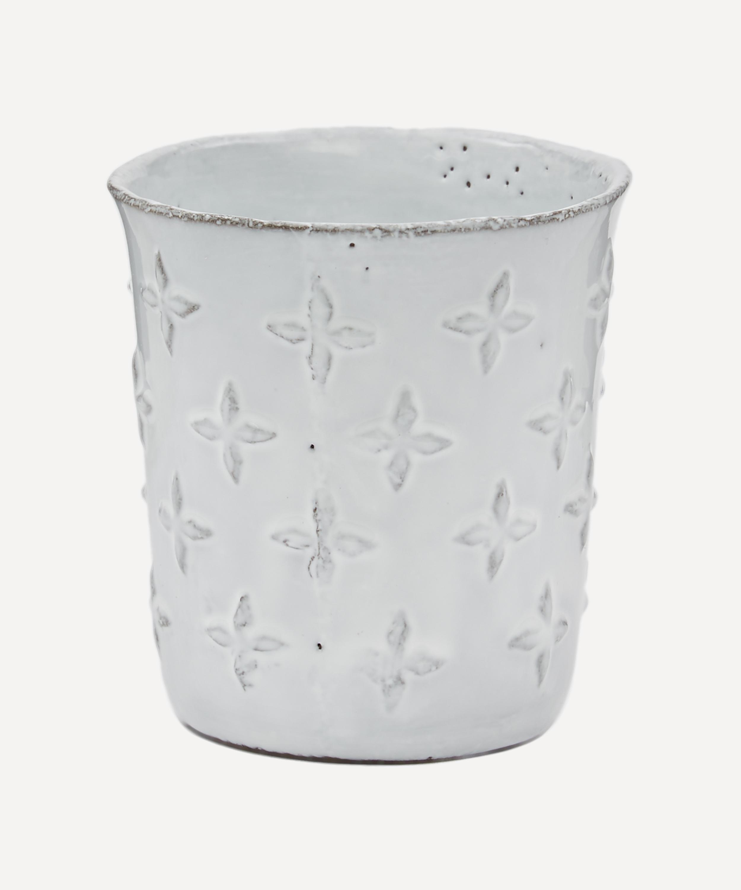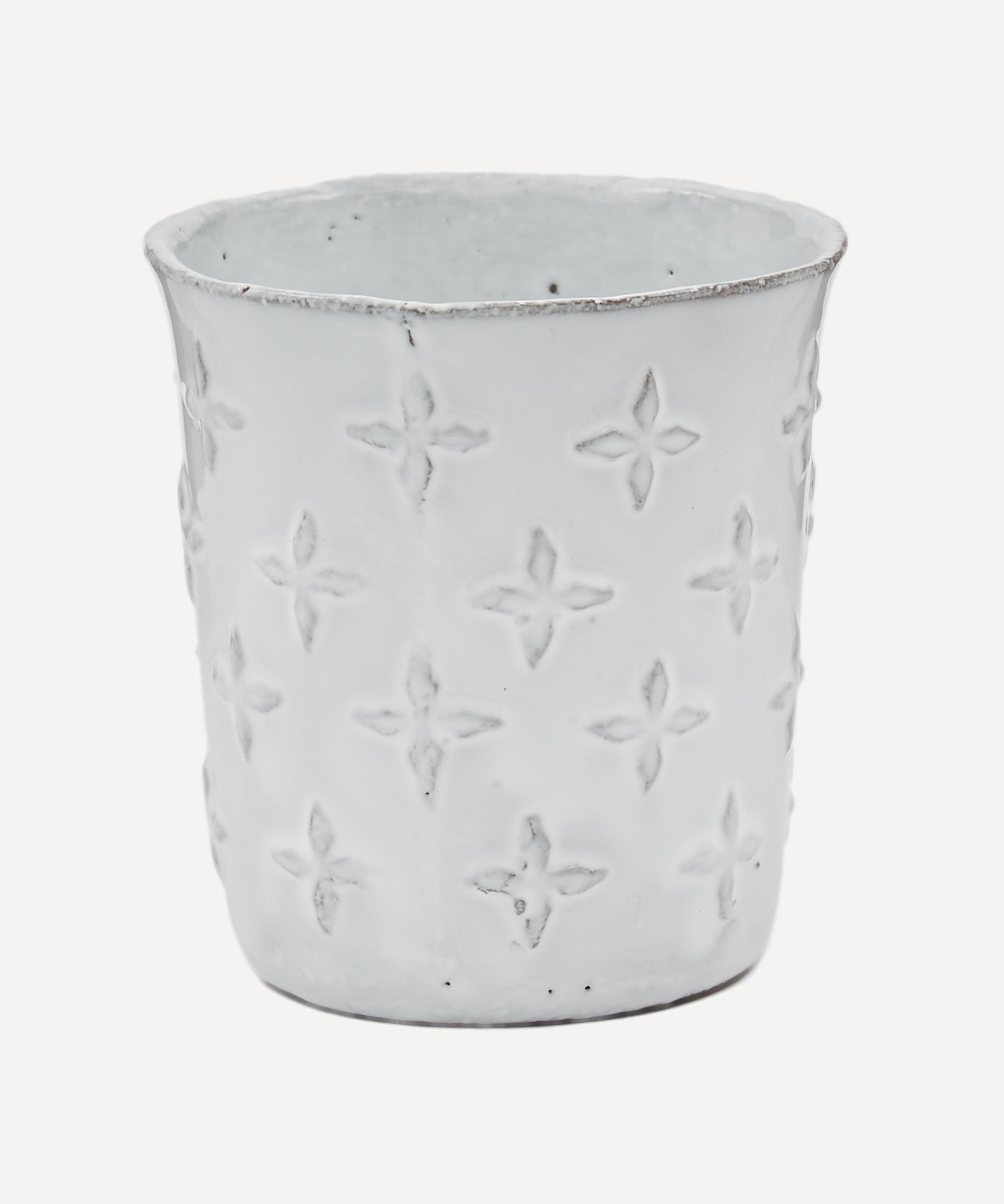Votary of pre-industrial fabrication, Astier de Villatte is celebrated for being the one and only studio in Paris to hold and harbour the traditions of artisanal ceramic production. Restoring the ancestral systems of moulding and stamping, the Tuileries tumbler is made using techniques from the Middle Ages which involve moulding a sheet of handmade clay, double firing the ‘biscuit’ piece and glazing the product in white enamel – a lengthy process that requires a drying time of up to one month. Characterised by exposed clay, a slightly curved rim and an all-over four-point star pattern inspired by traditional tile designs, the cup is engraved with the brand’s signature crest – depicting an interlacing A & V – alongside the initials of one of the 40 master artisans who created it. Each handmade piece tells a beautiful story, romancing and imparting a sense of nostalgia into its owner. Display it with additional pieces from the collection to breathe an air of authenticity into your table setting.
