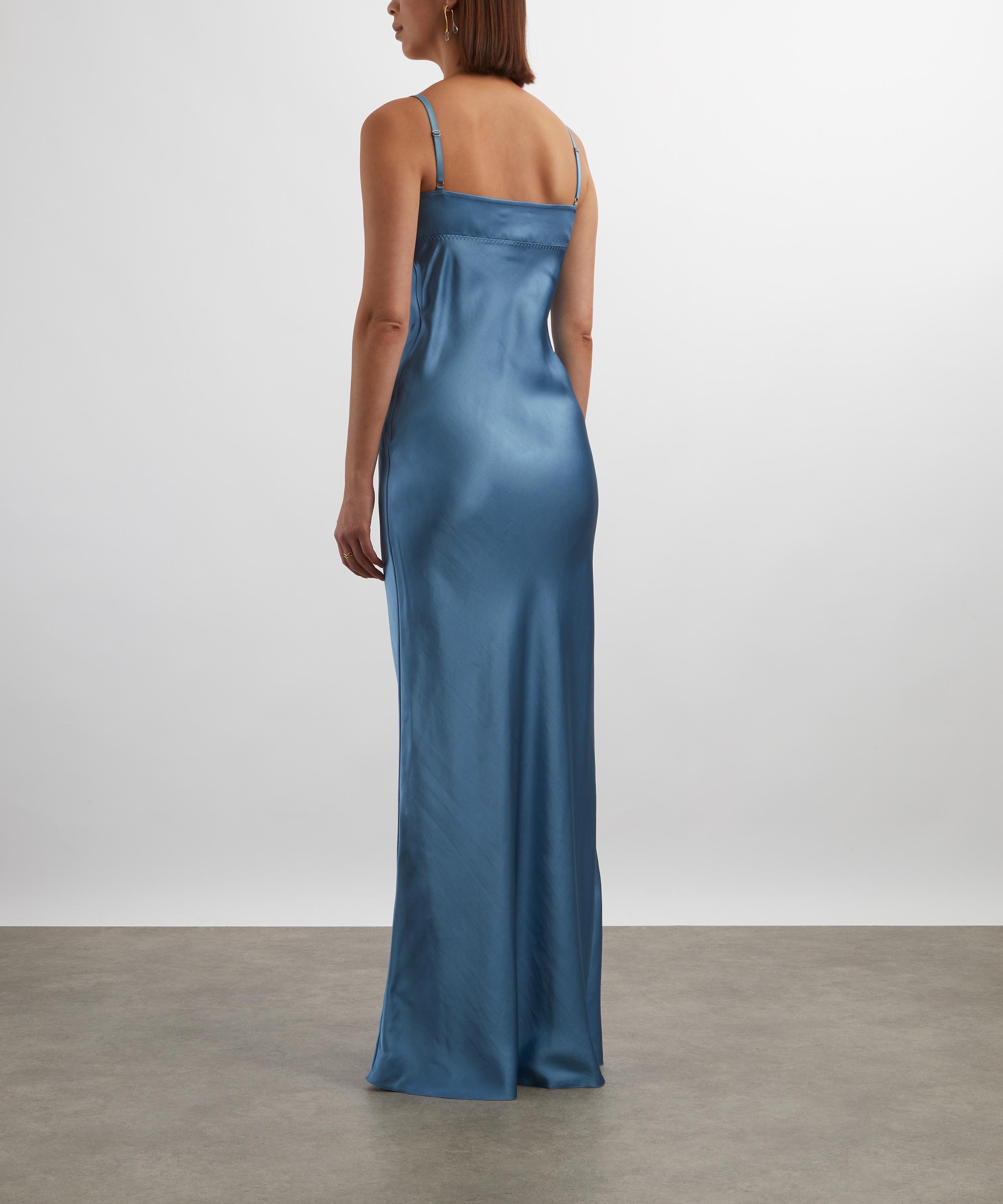Rendered in blue satin, the Tulip dress features a fluid slip silhouette complete with a floor-skimming skirt, and a sculpted bodice inspired by tulip petals - offering timeless elegance with a sultry edge.