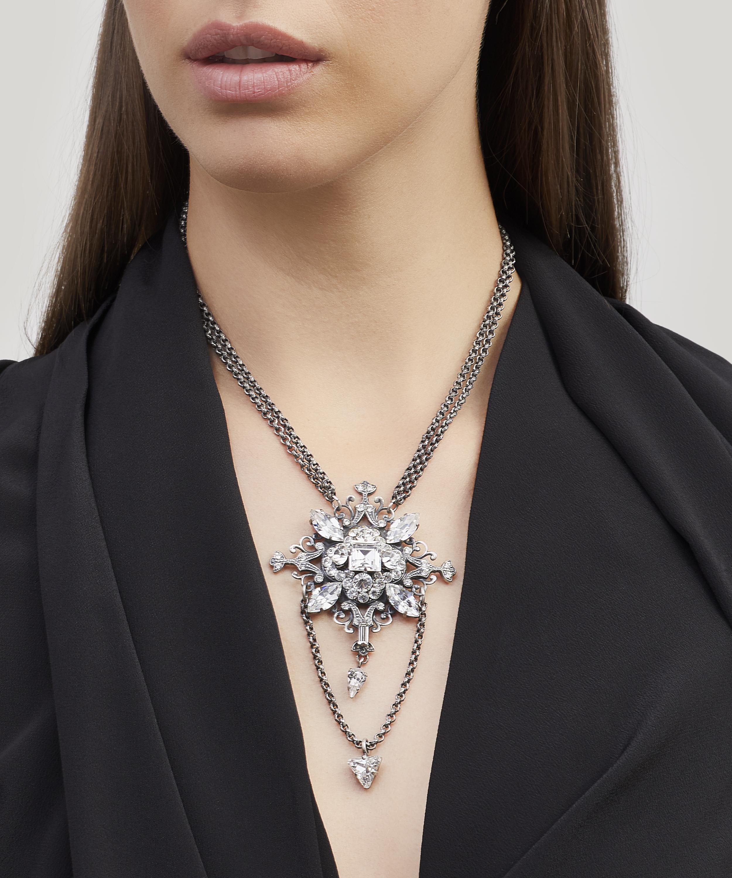Crafted in England from white metal, this vintage Claire Garnett necklace showcases an extravagantly embellished pendant with a trillion cut faux diamond chain drop. Suspended from a pair of short, round link chains, the pendant features a stylised quatrefoil centre and an intricate stencil lozenge base, studded with a dazzling assortment of mixed-cut faux diamonds. Complete with the Claire Garnett authenticity script, it makes for a show-stopping addition to any special occasion jewellery curation.