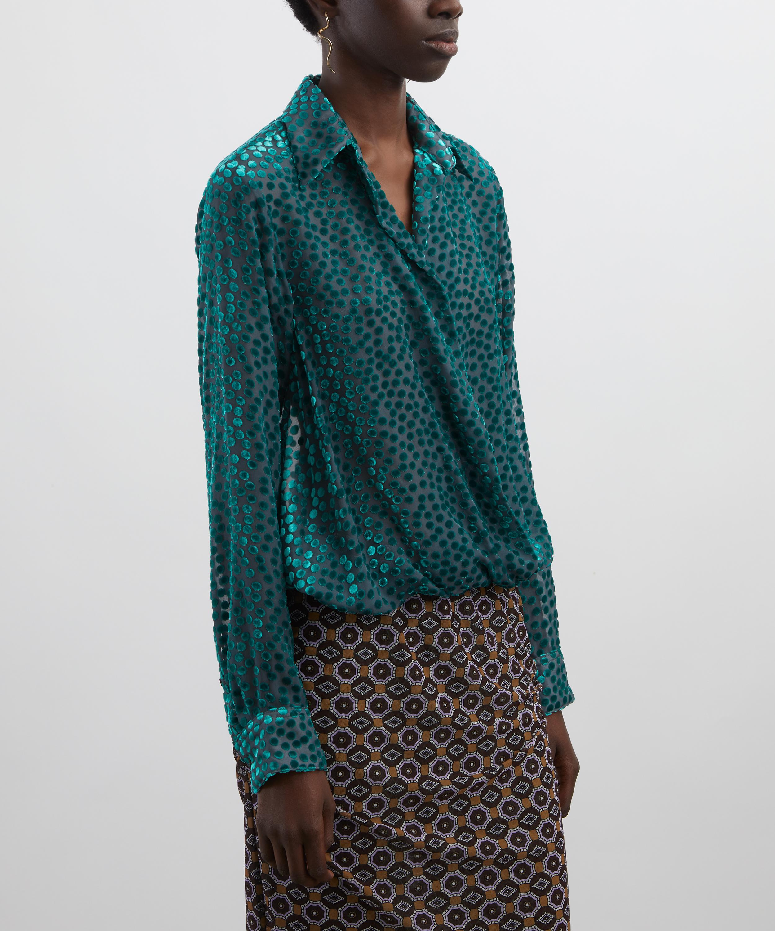 Crafted from polka-dot silk devoré, this wrap shirt features a drawstring closure that creates an effortlessly draped front.