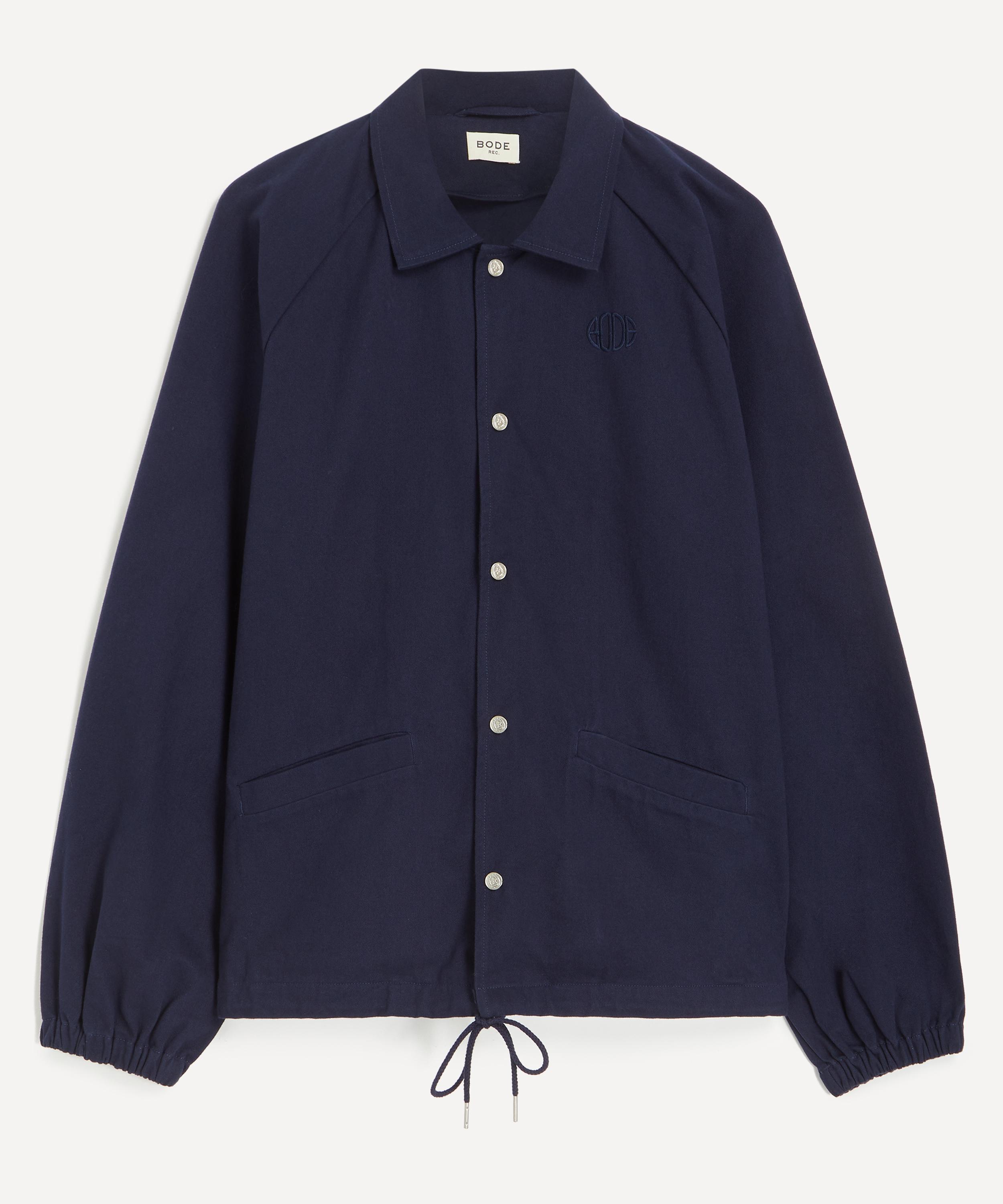 Crafted from heavyweight cotton twill, this jacket channels a 1980s-inspired windbreaker silhouette, detailed with novelty horseshoe snap buttons and finished with Bode’s signature monogram embroidery.
