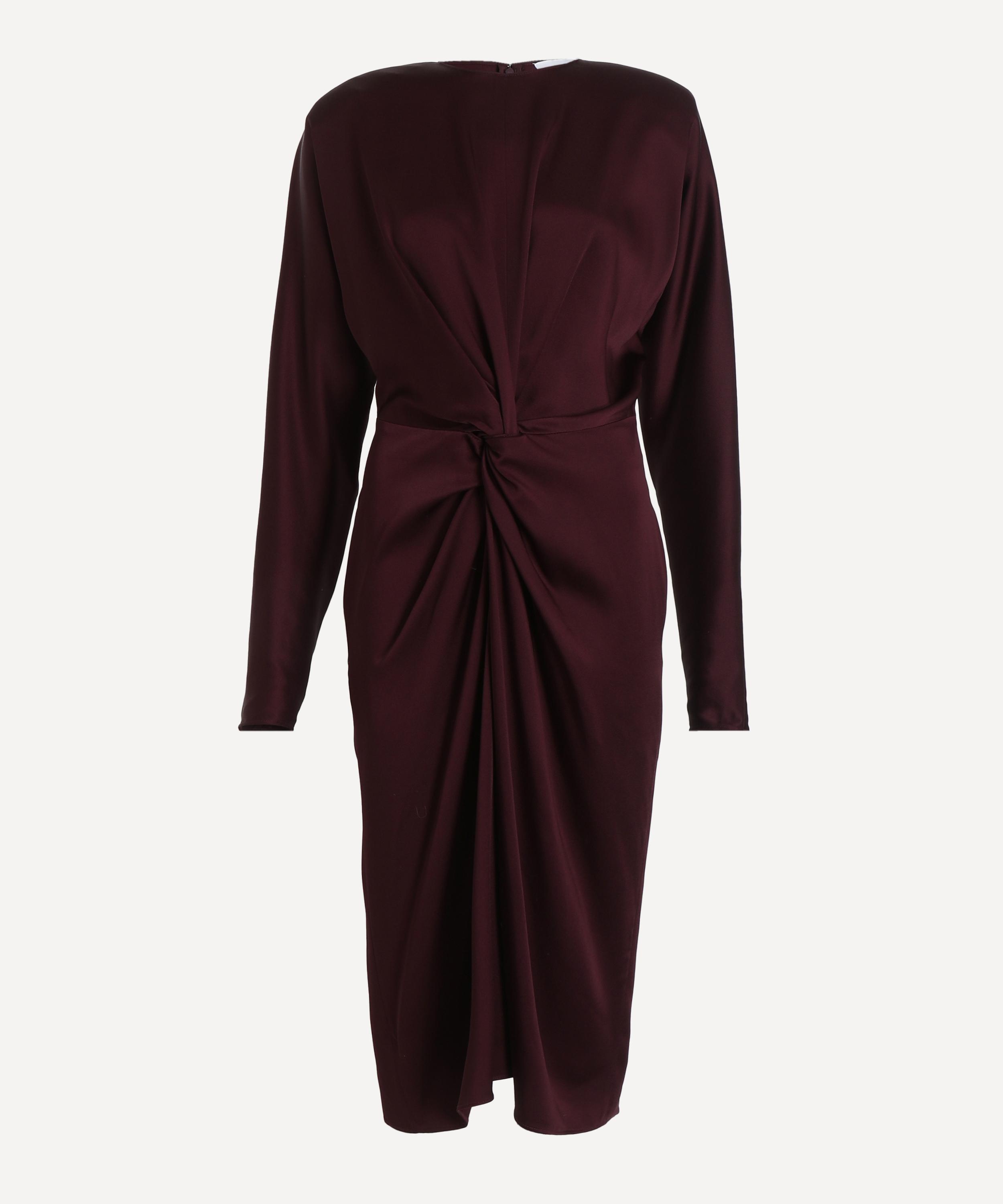 Cut from sumptuous satin in a flattering midi silhouette, it features a twisted knot detail at the front waist and sculptural shoulder pads for a bold, architectural finish. Completed with a concealed zip at the back, style with a sleek clutch and contemporary accessories for a look that exudes confident sophistication.