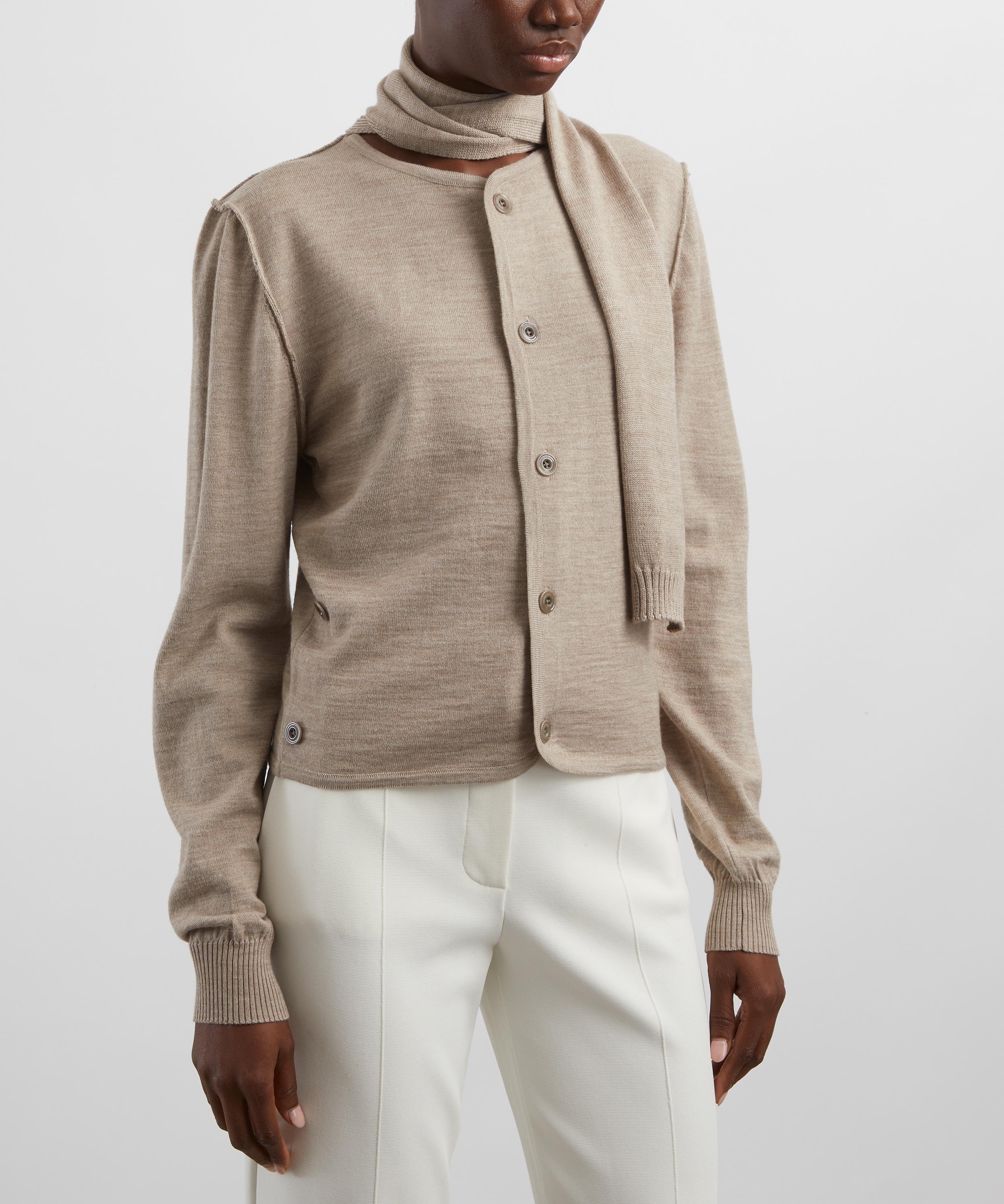 Crafted from a soft Merino wool blend, this abstract knit features an asymmetrical button placket that wraps around the waist, fastening at the side seam. Designed with an integrated scarf, it offers versatile styling options for a dynamic, layered look.