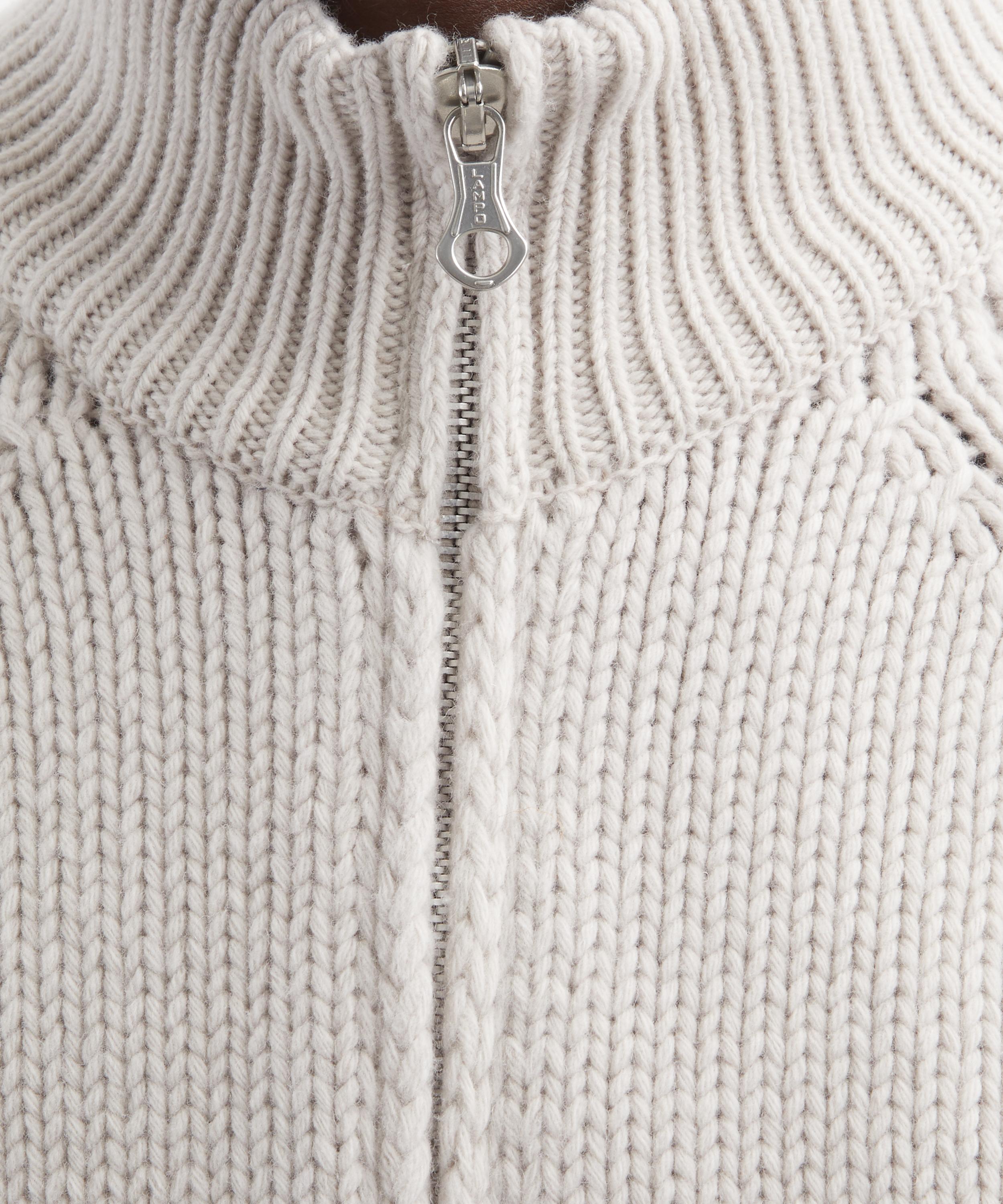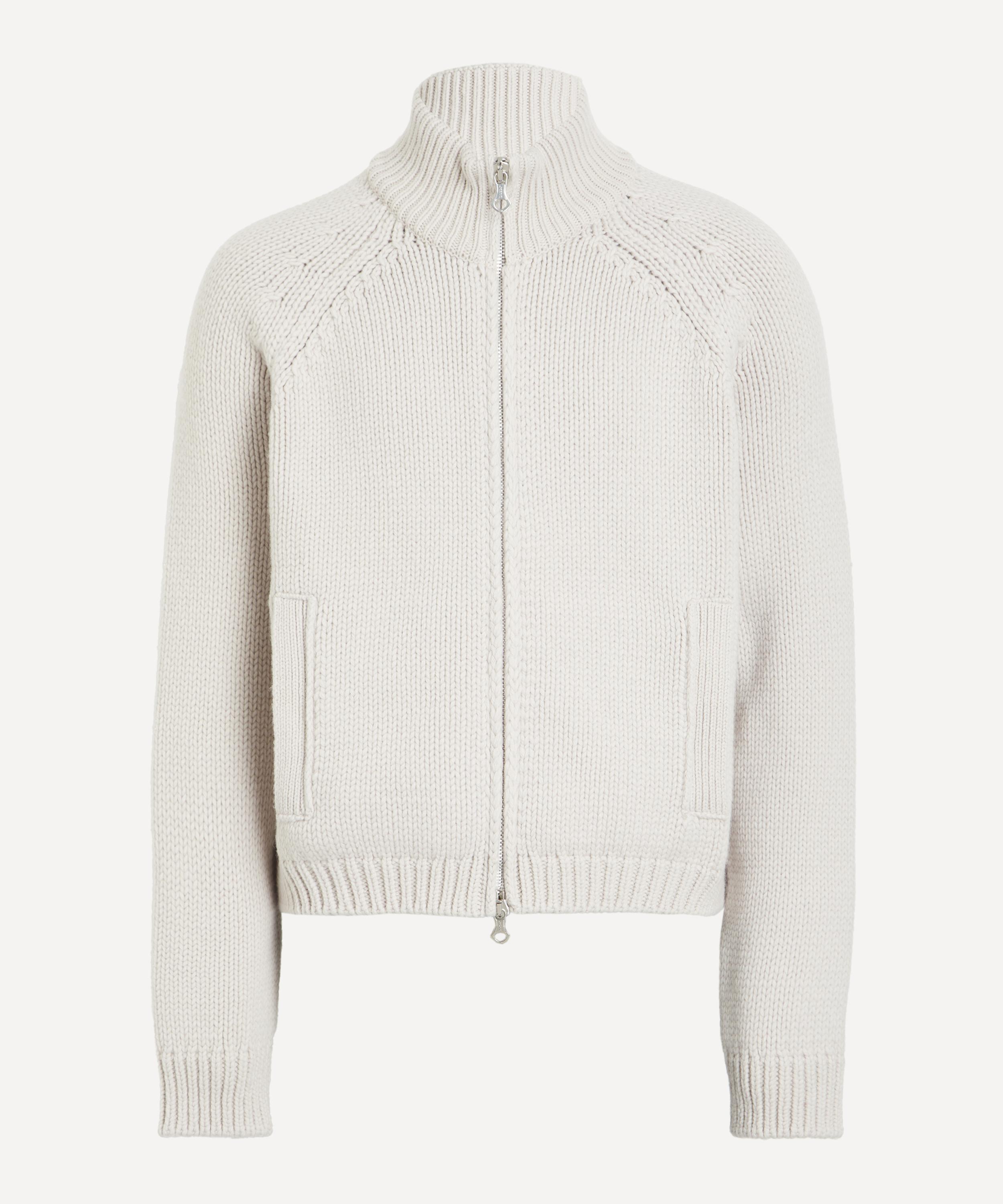 Constructed from an Italian extrafine Merino wool yarn, this knitted cardigan is designed for a cropped, boxy fit with raglan sleeves, and features a ribbed funnel neck collar, two-way zip fastening, and two welt pockets.