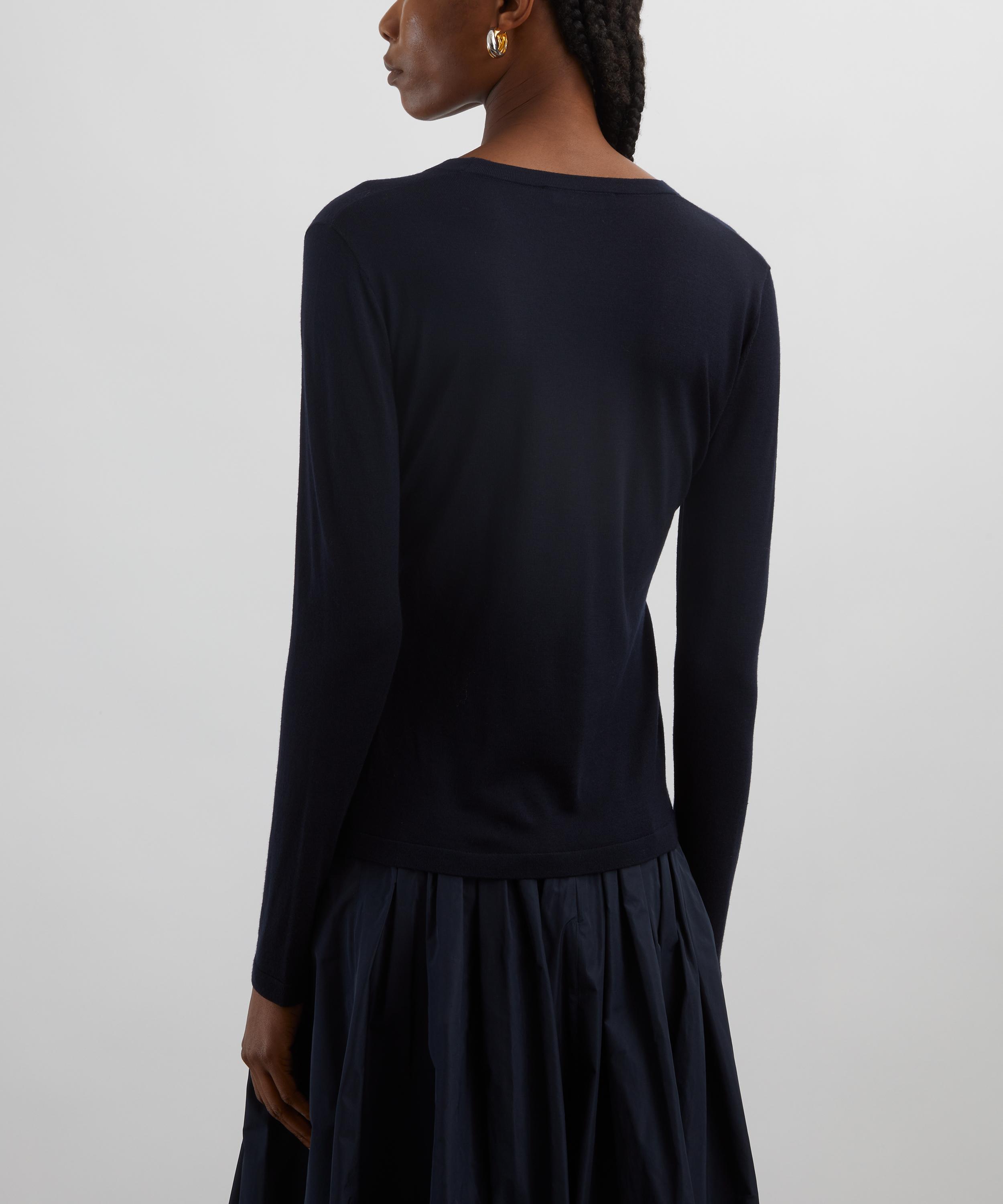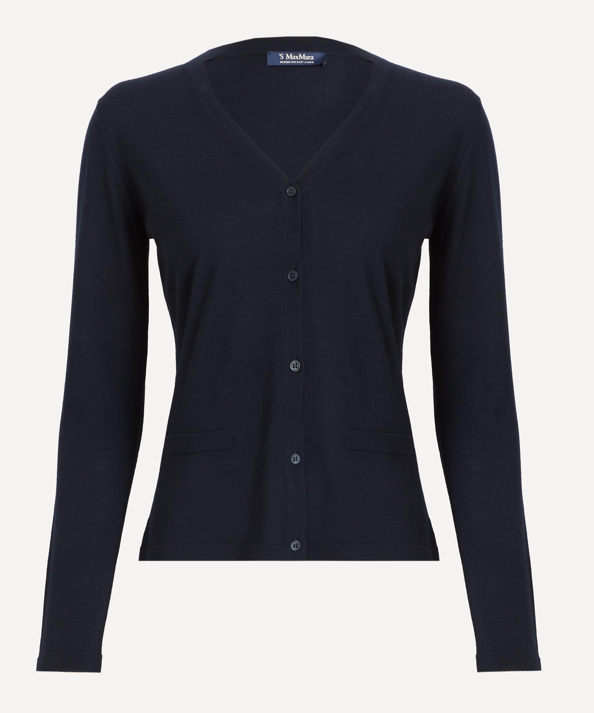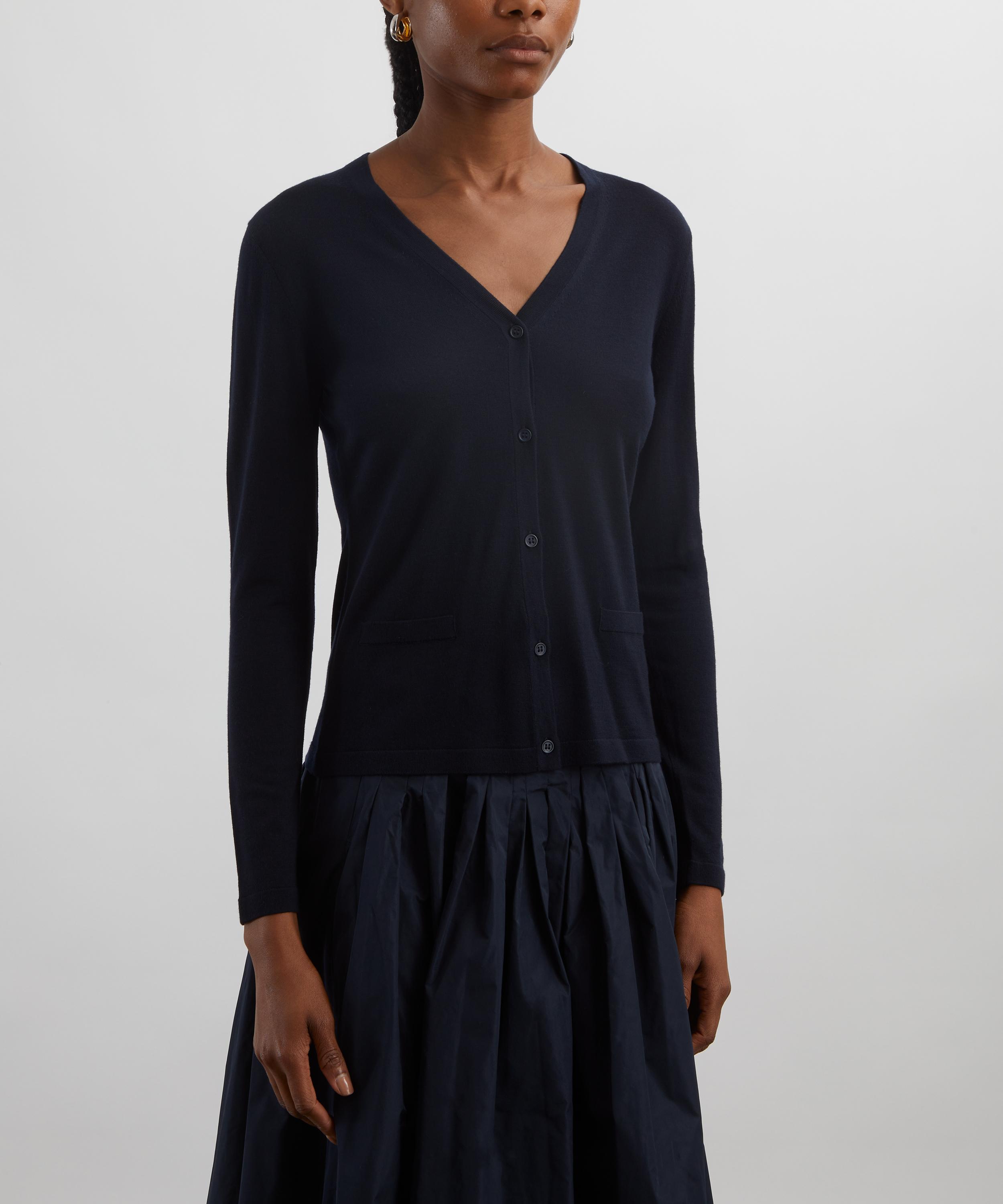 Crafted from pure wool yarn in a rich Ultramarine blue, this cardigan offers a streamlined fit with a V-neckline, long set-in sleeves, horizontal welt pockets and a classic front button fastening, making it a polished yet cosy layer.