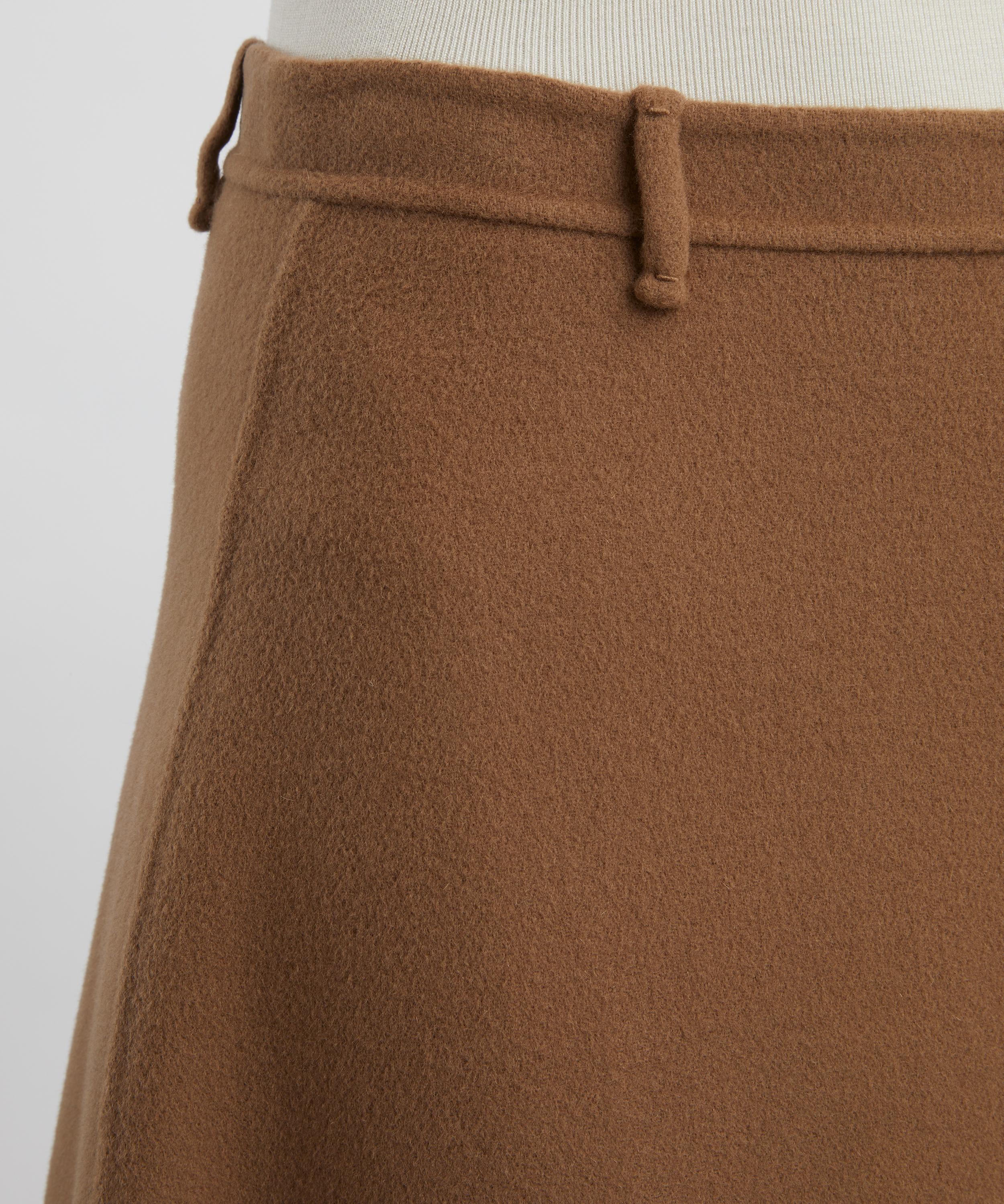 Crafted from hand-sewn double-faced wool broadcloth in a timeless hazelnut hue, this midi skirt offers a flattering flared silhouette complete with a concealed zip fastening, belt loops, and pure silk lining for a luxurious finish.